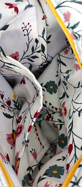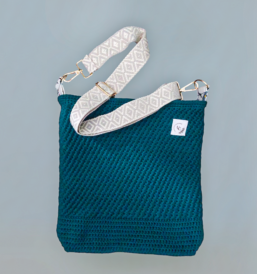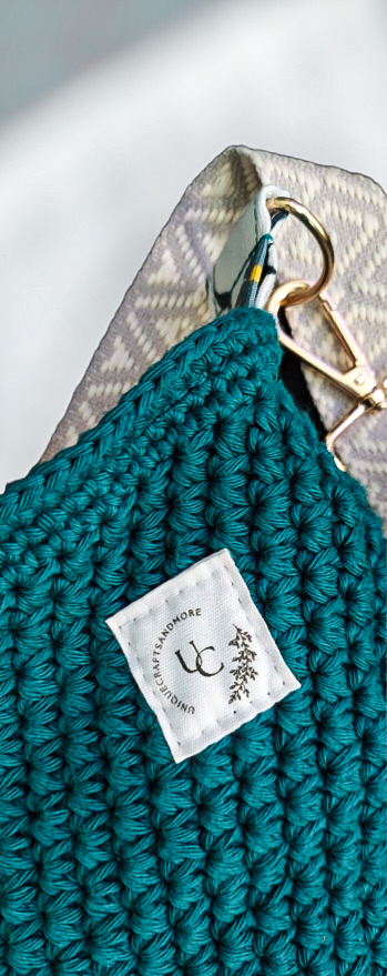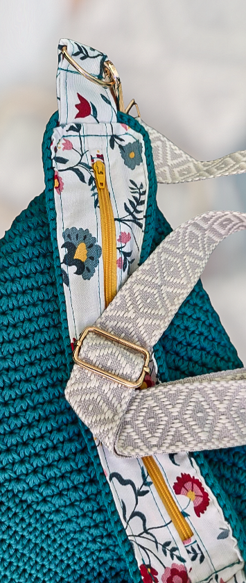 Dit is een zelfgemaakte handtas. De buitenkant van de handtas is gehaakt met 100% katoen garen en de binnenkant van de tas is genaaid. De tas is afgewerkt met een rits. Er is ook een zakje aan de zijkant genaaid waar je allerlei spulletjes in kan steken! Ook zit er een bloemen tassenlint bij zodat je hem gemakkelijk over je schouder kan hangen, dit lint is ook verstelbaar 😊