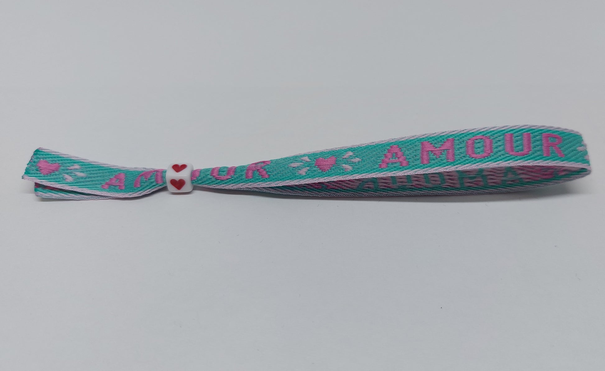 Dit is een stoffen bandjes met een verschuifbaar kraaltje aan zodat het makelijk aan en uit kan en ook voor (bijna) iedereen past. Hou er rekening mee dat de kleur van het hartjes kraaltje anders kan zijn dan op de foto!