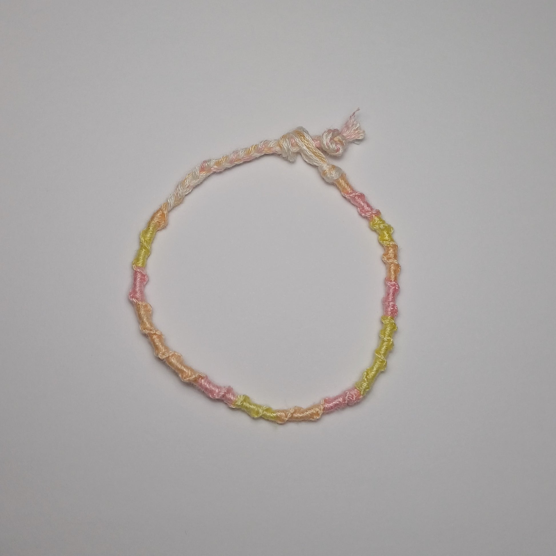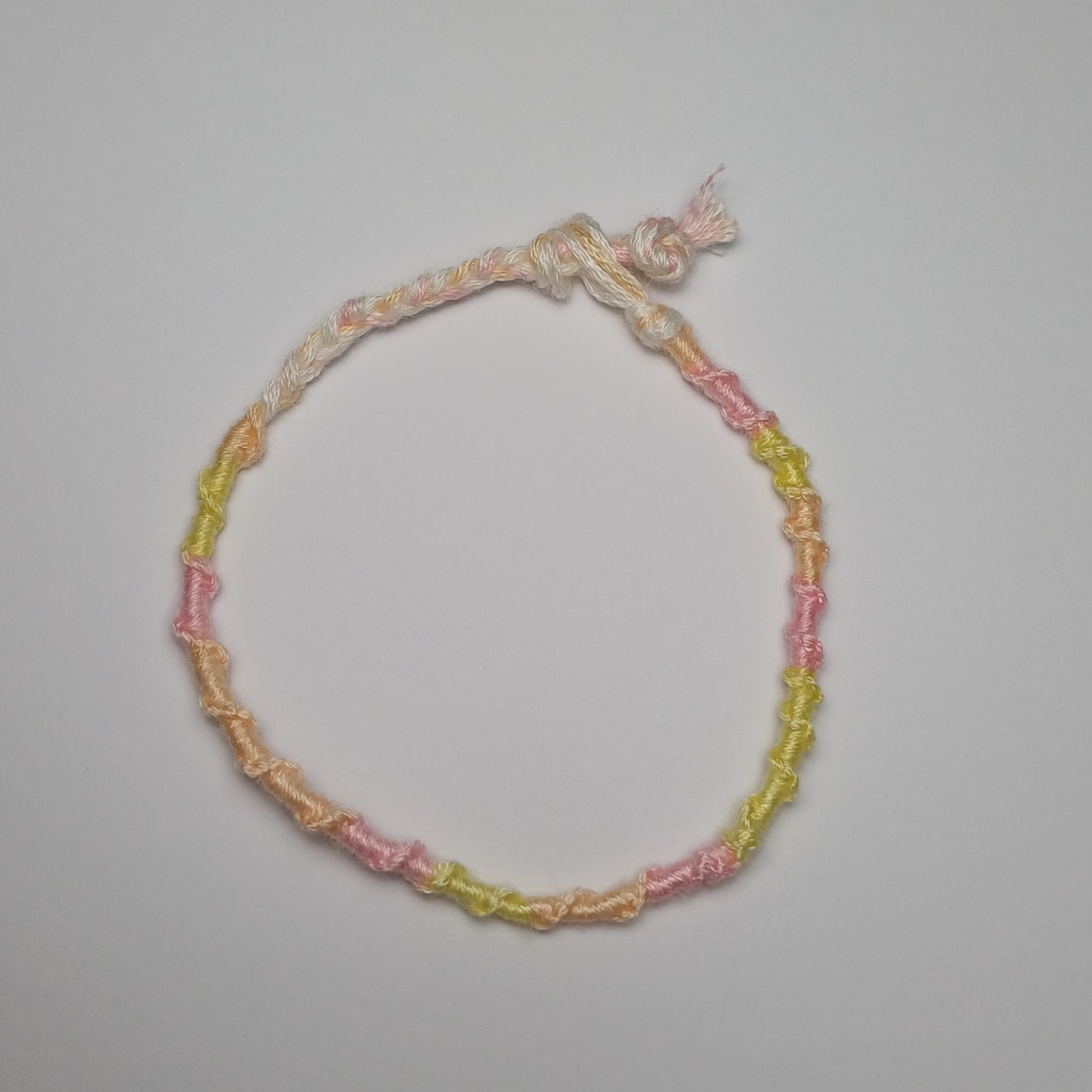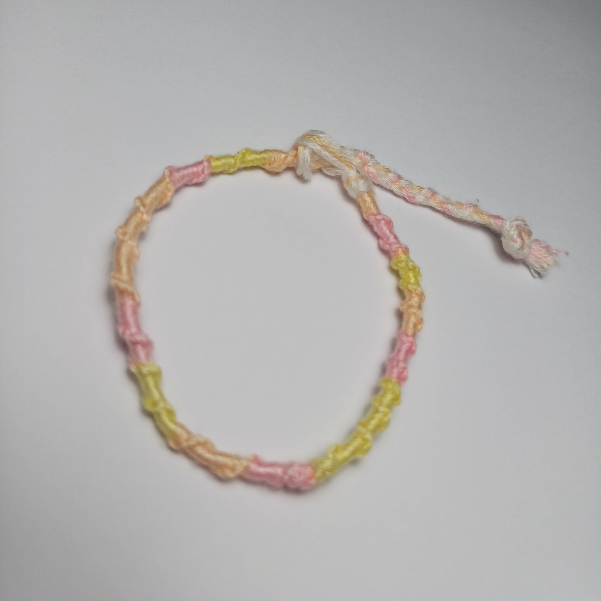 Dit is een handgemaakt touw armbandje. Doordat het een schuifknoop heeft past hij voor (bijna) iedereen omdat je hem zelf kan aanspannen. dit is een kleiner formaat dus past enkel voor kinderen of als je een smalle pols hebt!
