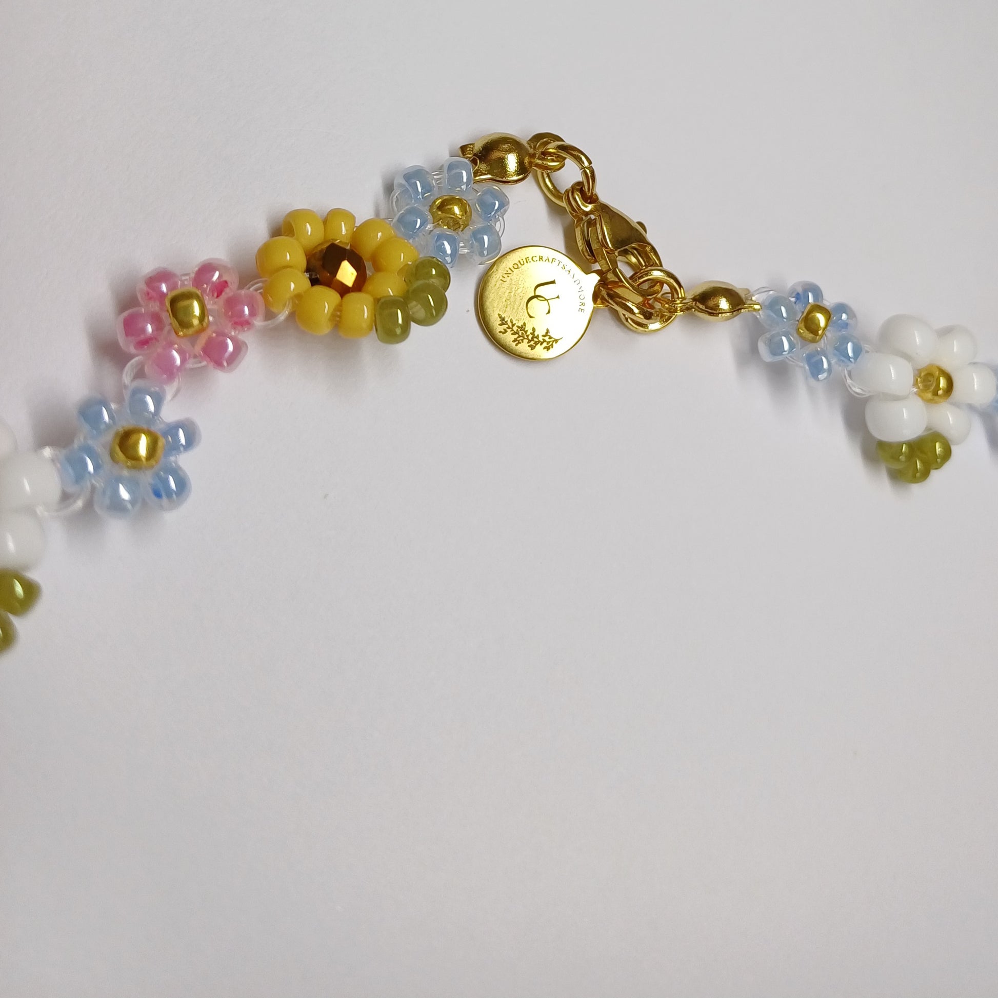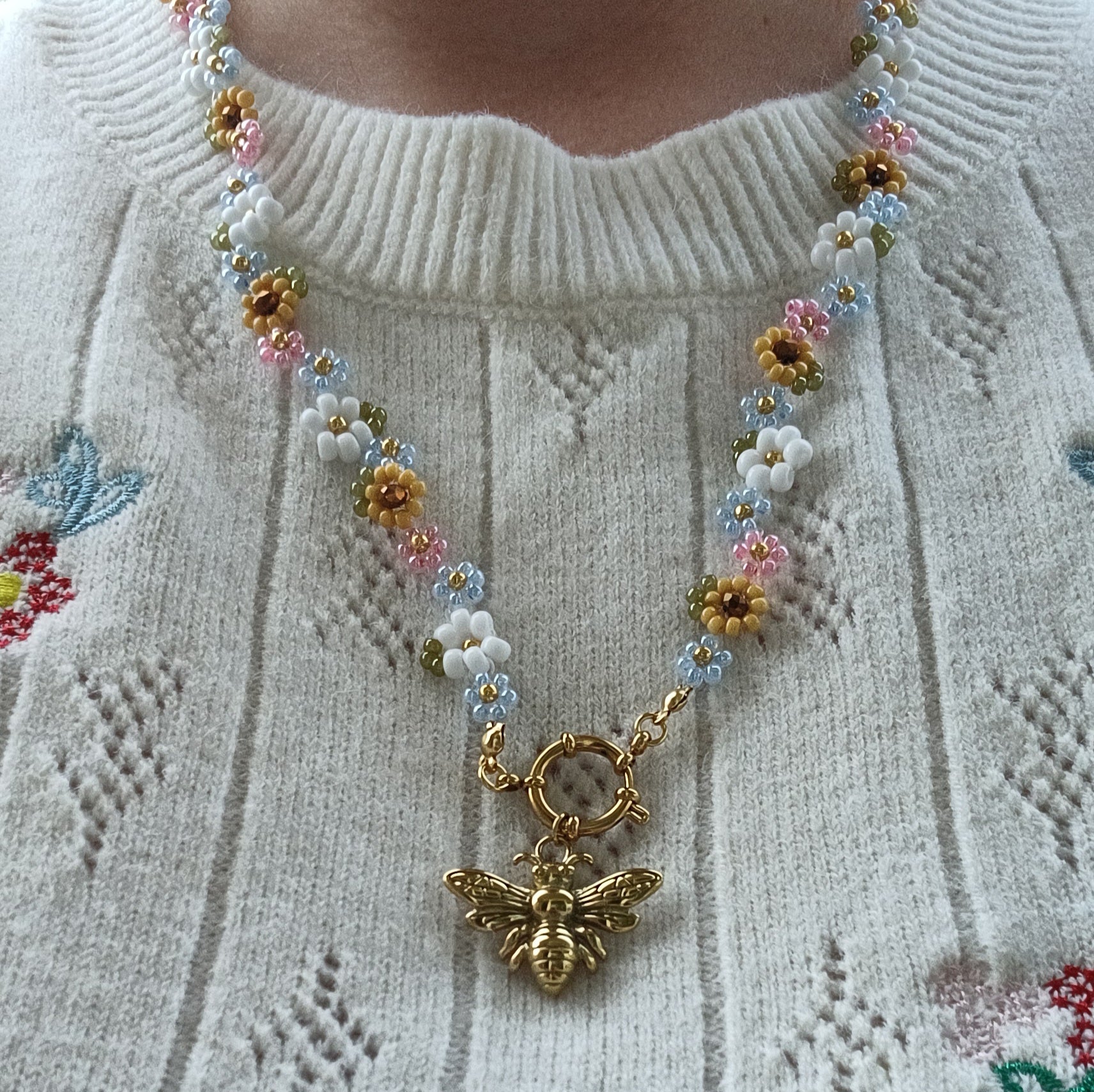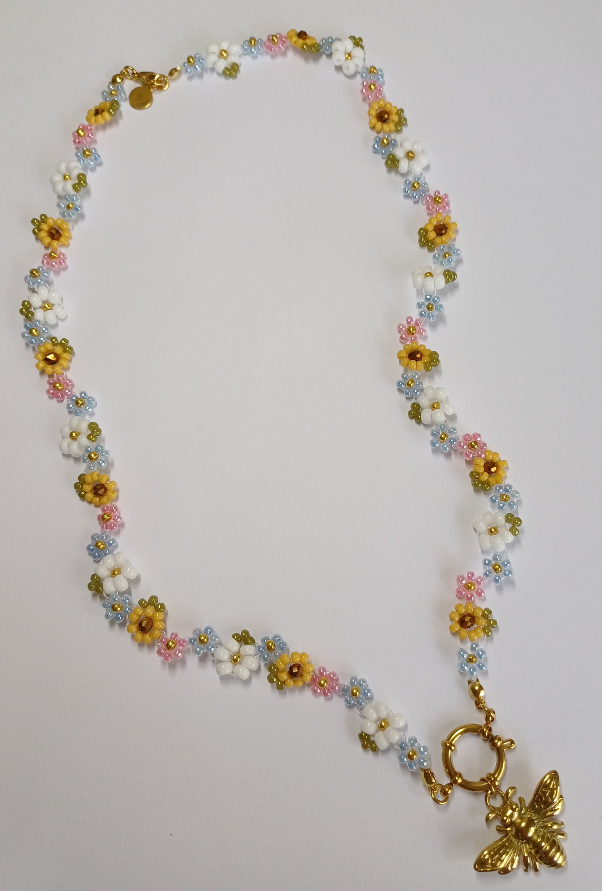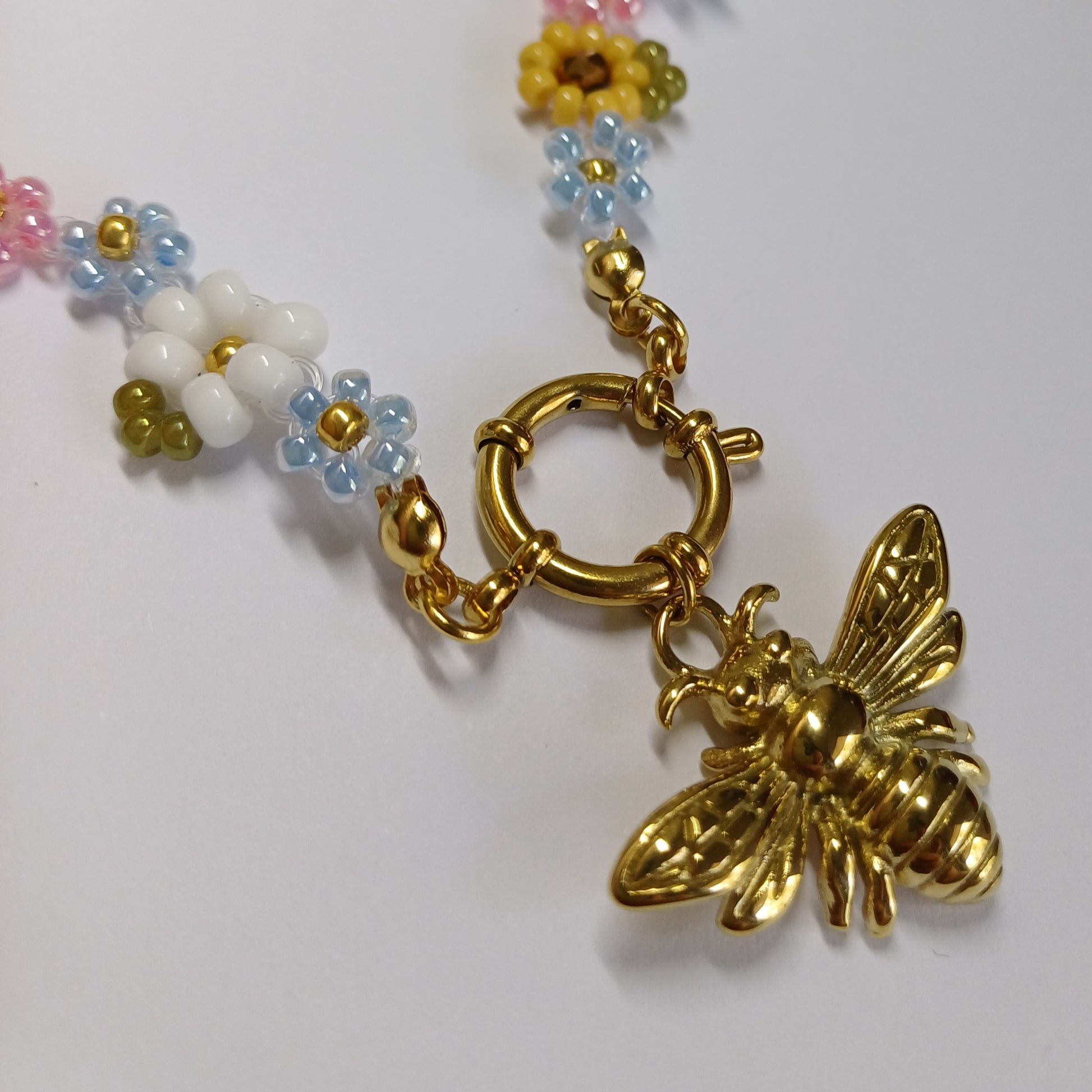 Deze betoverende ketting is een echte blikvanger! Handgemaakt met kleurrijke Miyuki rocailles en gevormd tot schattige bloemetjes die perfect passen bij het goudkleurige RVS bijtje in het midden. De boeisluiting geeft het geheel een stijlvolle en moderne touch.