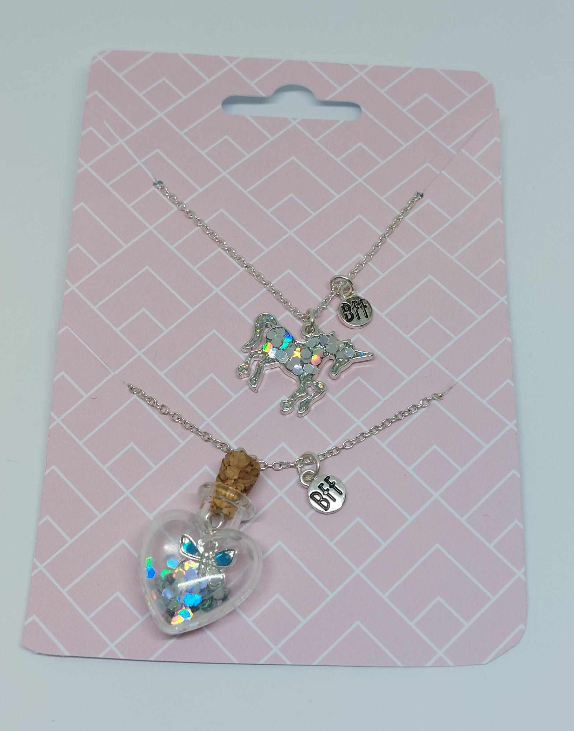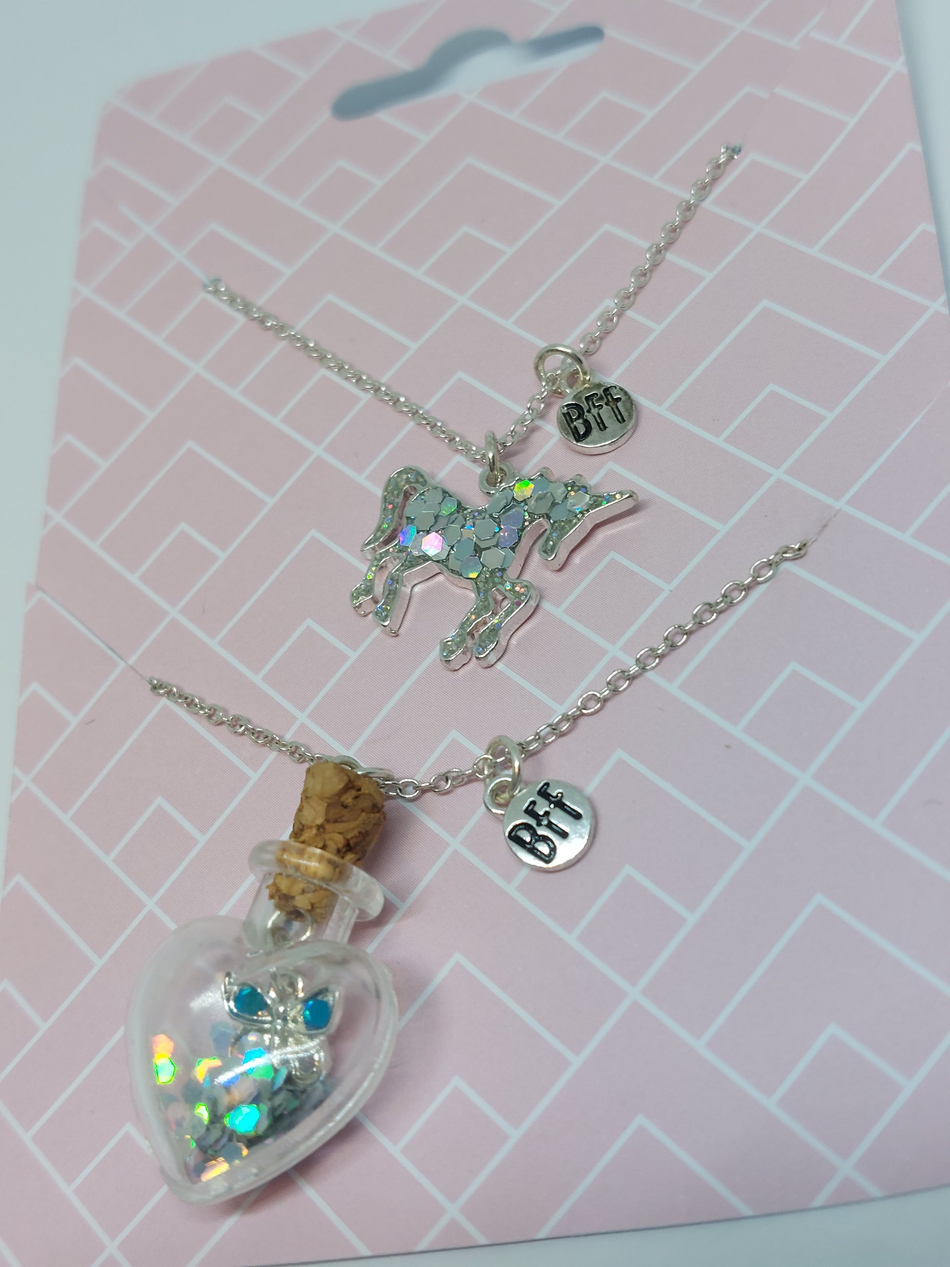 Dit zijn 2 kettingen om samen te dragen met jouw bff. 😊 Aan de ene ketting hangt een eenhoorn en aan de andere een flesje met en vlinder in.