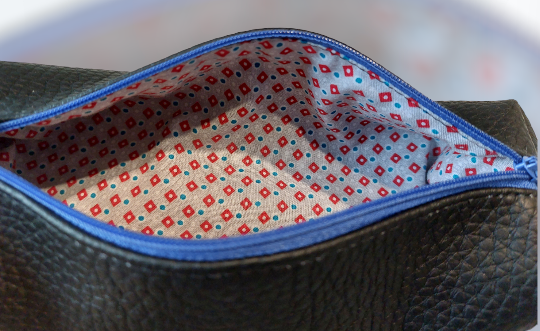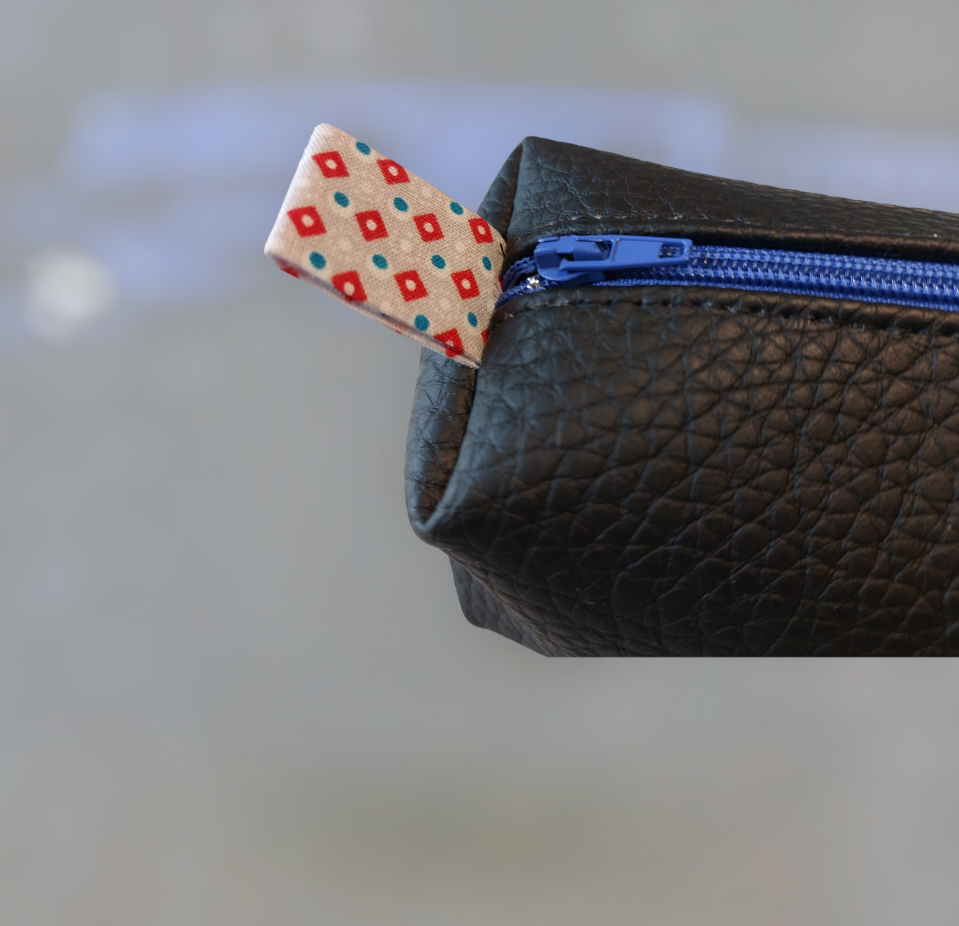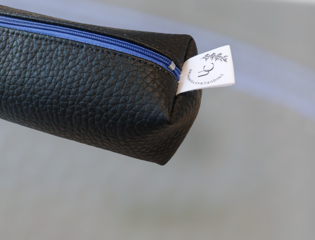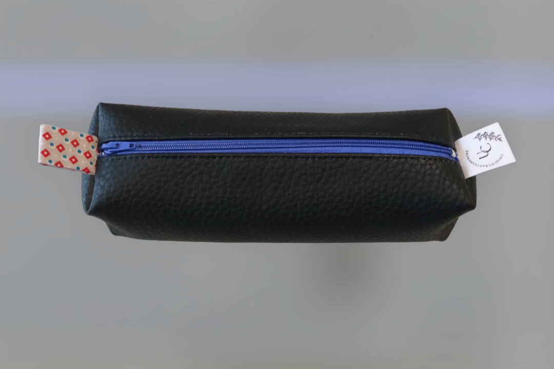 Dit is een handgemaakte pennenzak de buitenkant is gemaakt van skai leer de binnenkant is met een leuke print 😊 deze pennenzak is 21 cm breed en 6 cm hoog .
