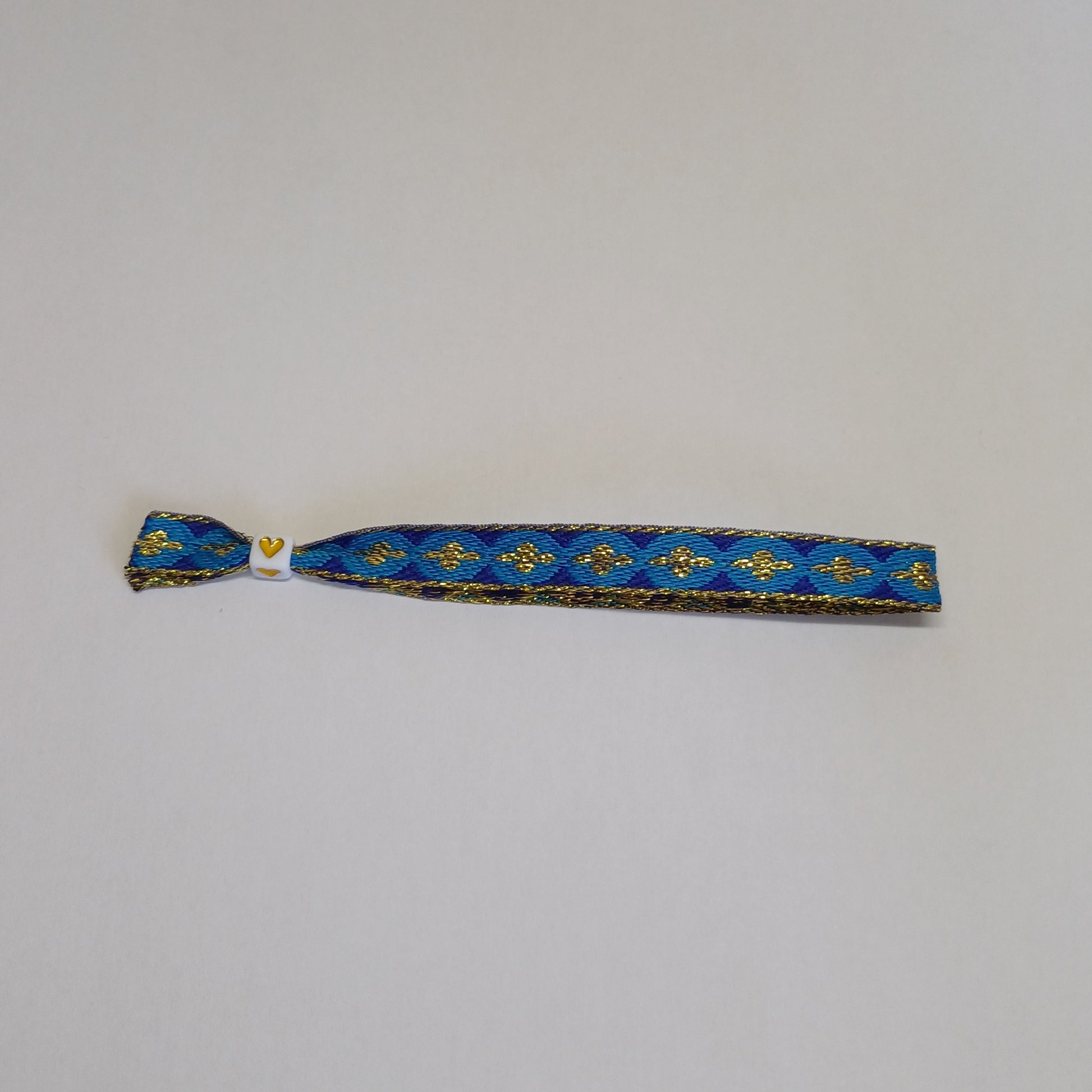 Dit is een stoffen bandjes met een verschuifbaar kraaltje aan zodat het makelijk aan en uit kan en ook voor (bijna) iedereen past. Hou er rekening mee dat de kleur van het hartjes kraaltje anders kan zijn dan op de foto!