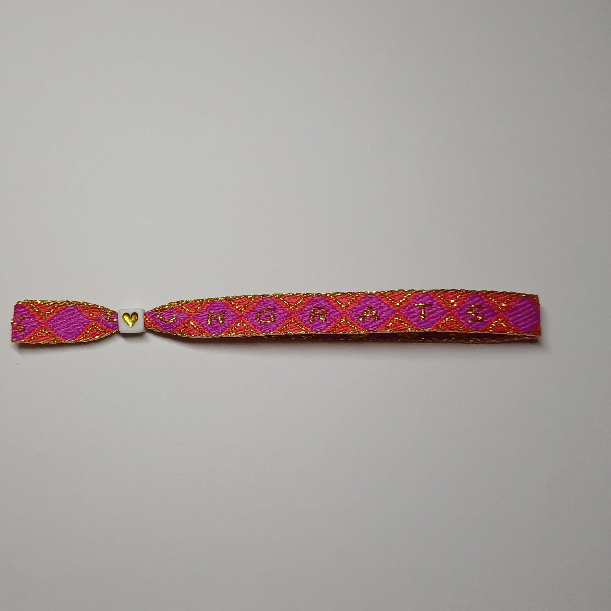 Dit is een stoffen bandjes met een verschuifbaar kraaltje aan zodat het makelijk aan en uit kan en ook voor (bijna) iedereen past. Hou er rekening mee dat de kleur van het hartjes kraaltje anders kan zijn dan op de foto!