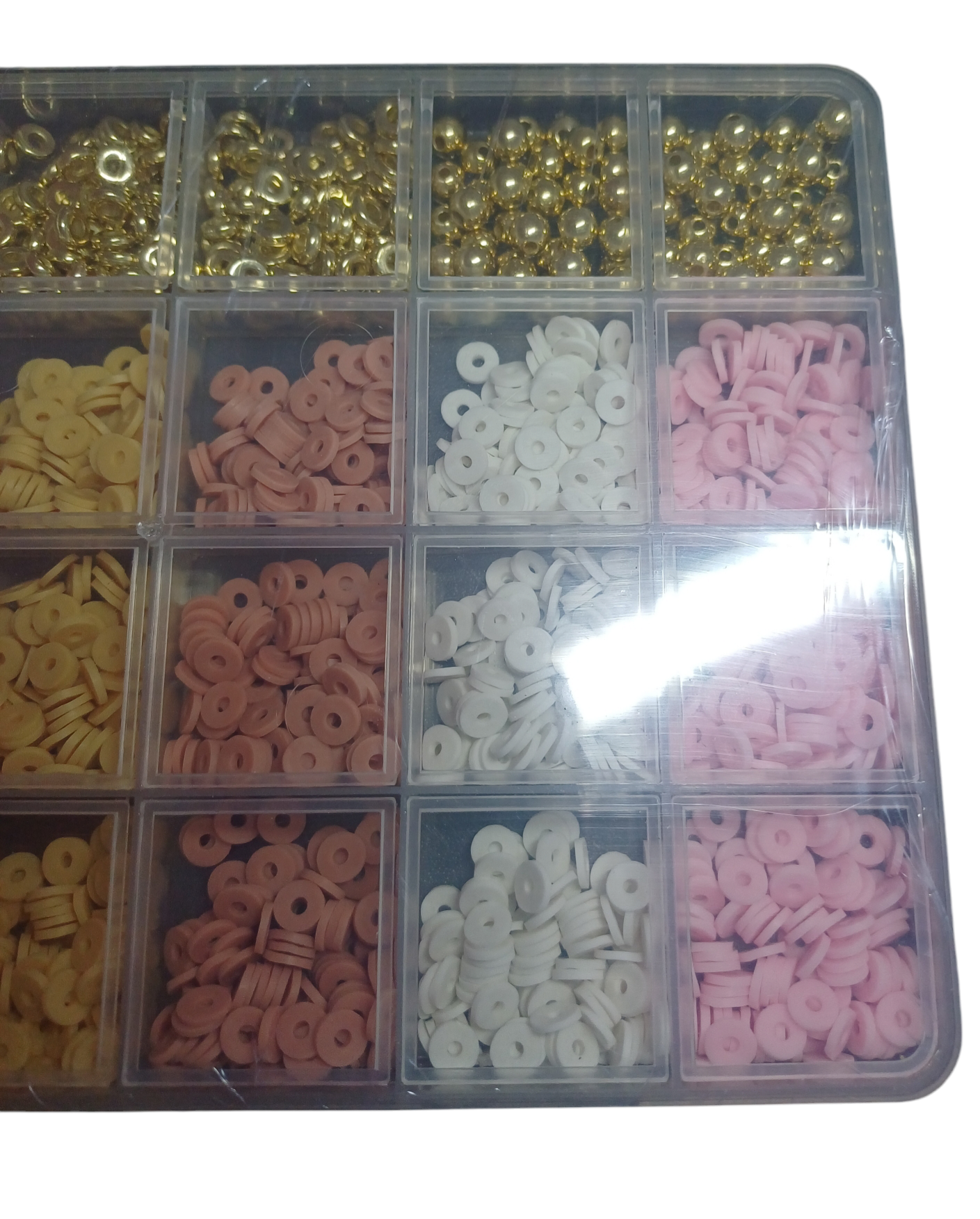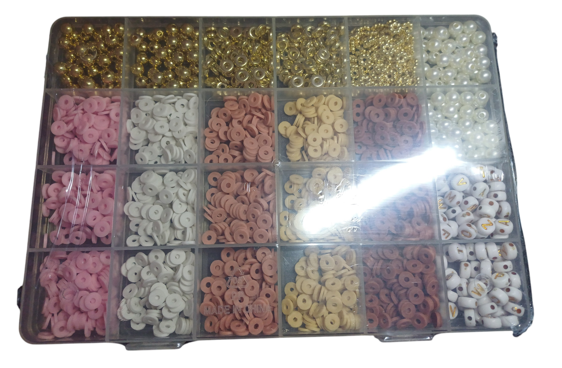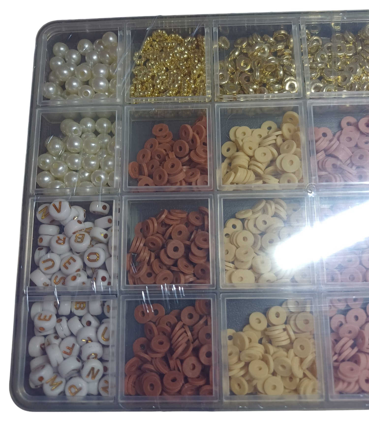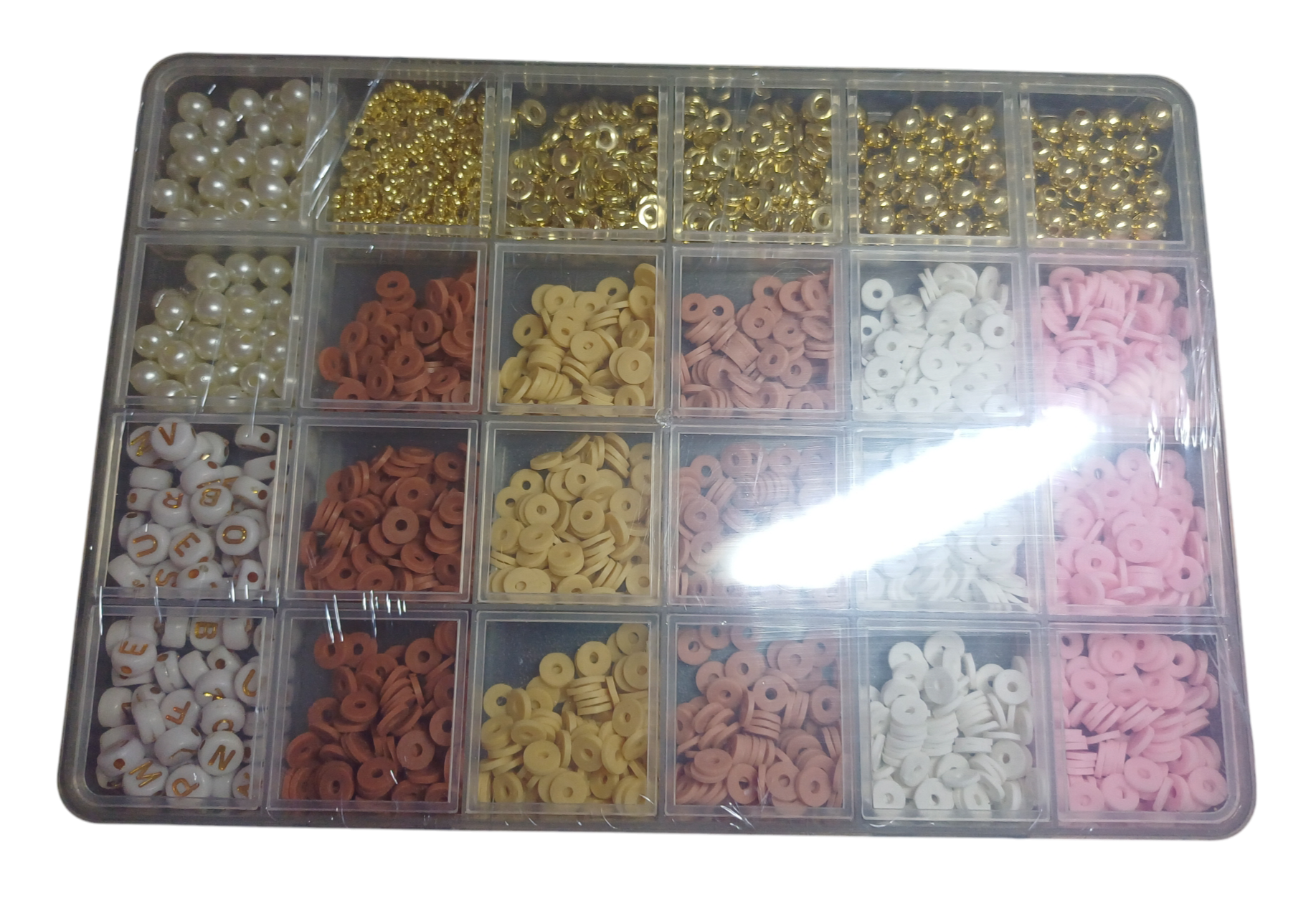 Dit is een kralenbox met afmetingen 19x13x2cm met katsuki kralen : 24 kleuren katsuki kralen ( +-1800stuks) 300+- spacer beads & letter beads