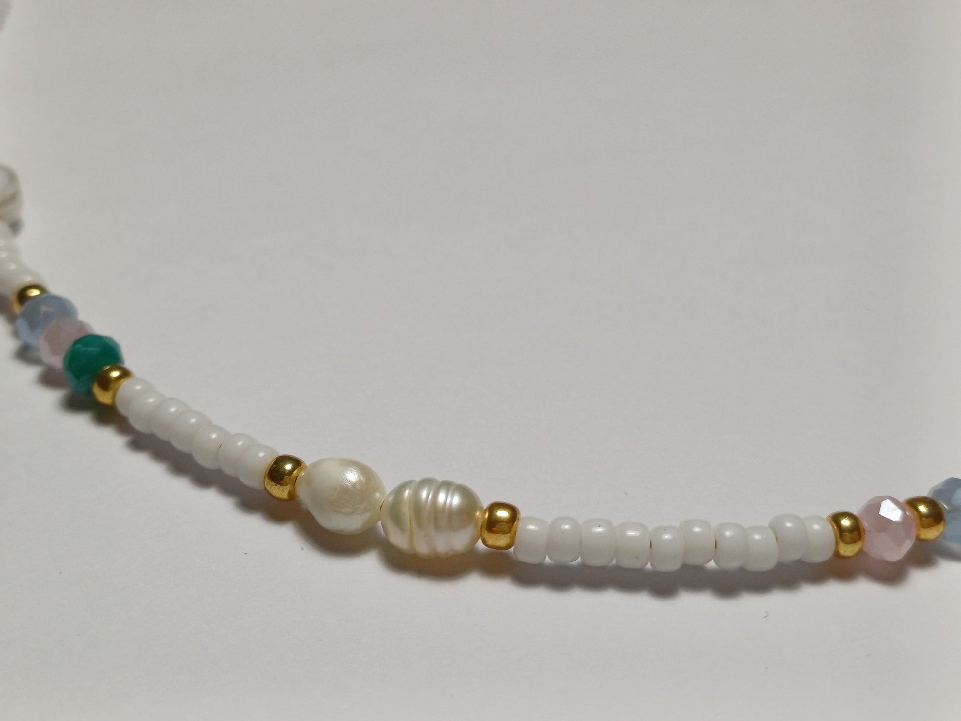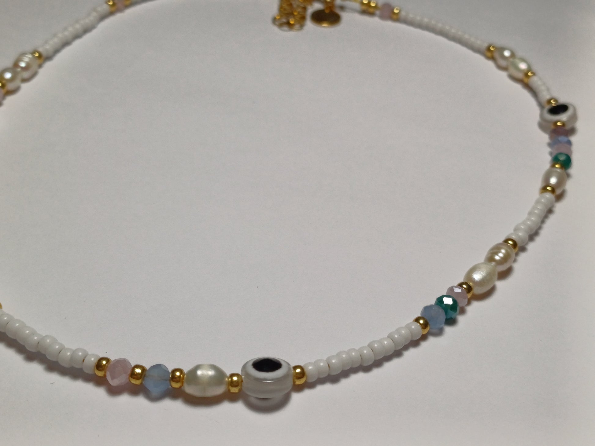 Probeer je ketting van water, parfum, zweet etc uit de buurt te houden. Hij kan hier normaal tegen maar het kan toch altijd zijn dat hij daardoor verkleurd en zo heb je er veel langer plezier van. 😊 (hij is gemaakt van miyuki rocailles, echte zoetwater parels, plastice oog kralen )