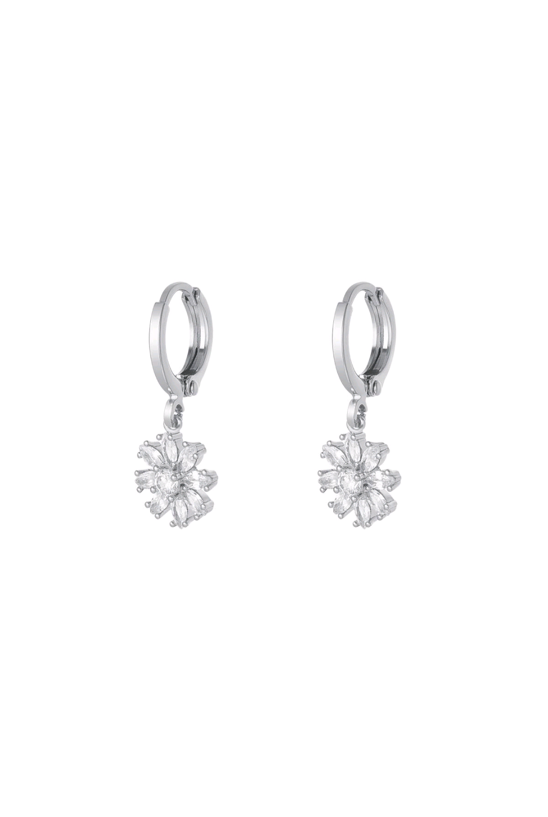 Schattige zilveren oorbellen met een hangertje in de vorm van een bloemetje. De oorbellen zijn gemaakt van met witgoud plated koper. Deze sparkle oorbellen zijn ingelegd met kleine zirkonia steentjes in de kleur wit.
