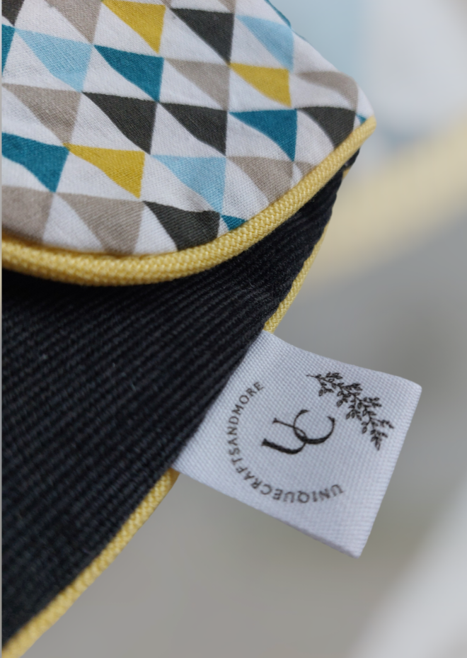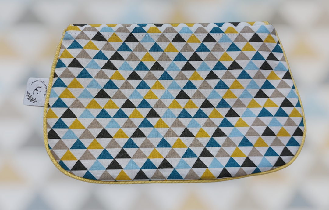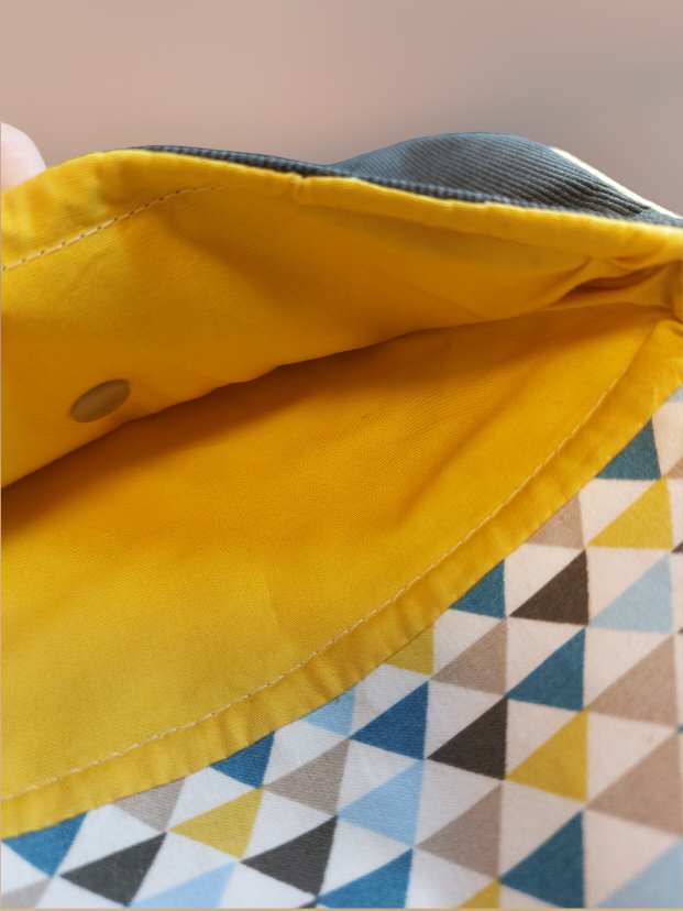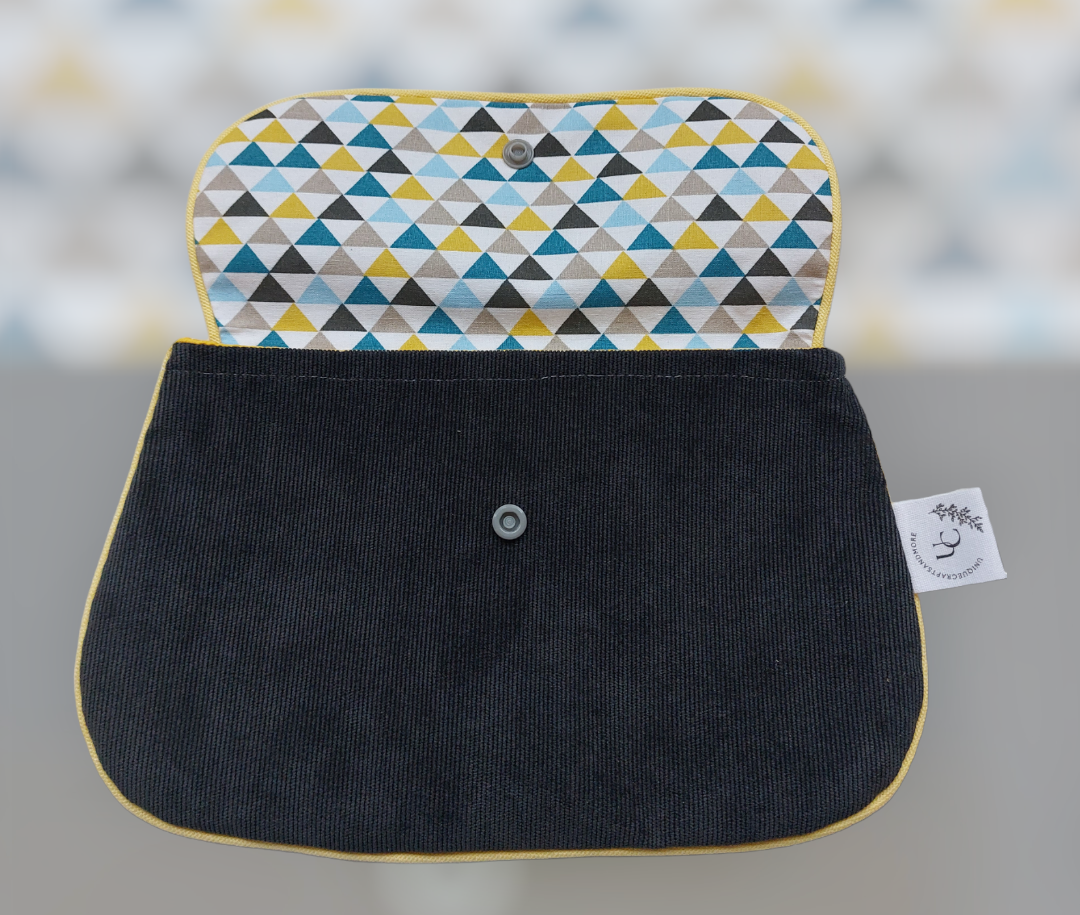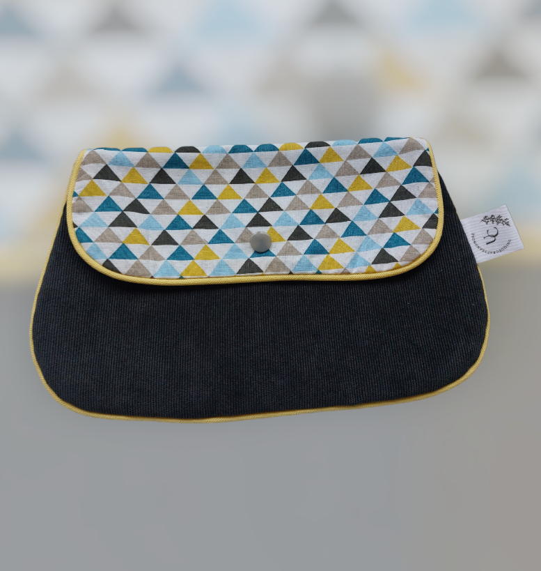Dit is een handgemaakte etui met een leuke print en een druk knopje als sluiting deze is 24 cm breed en 14 cm hoog 😊