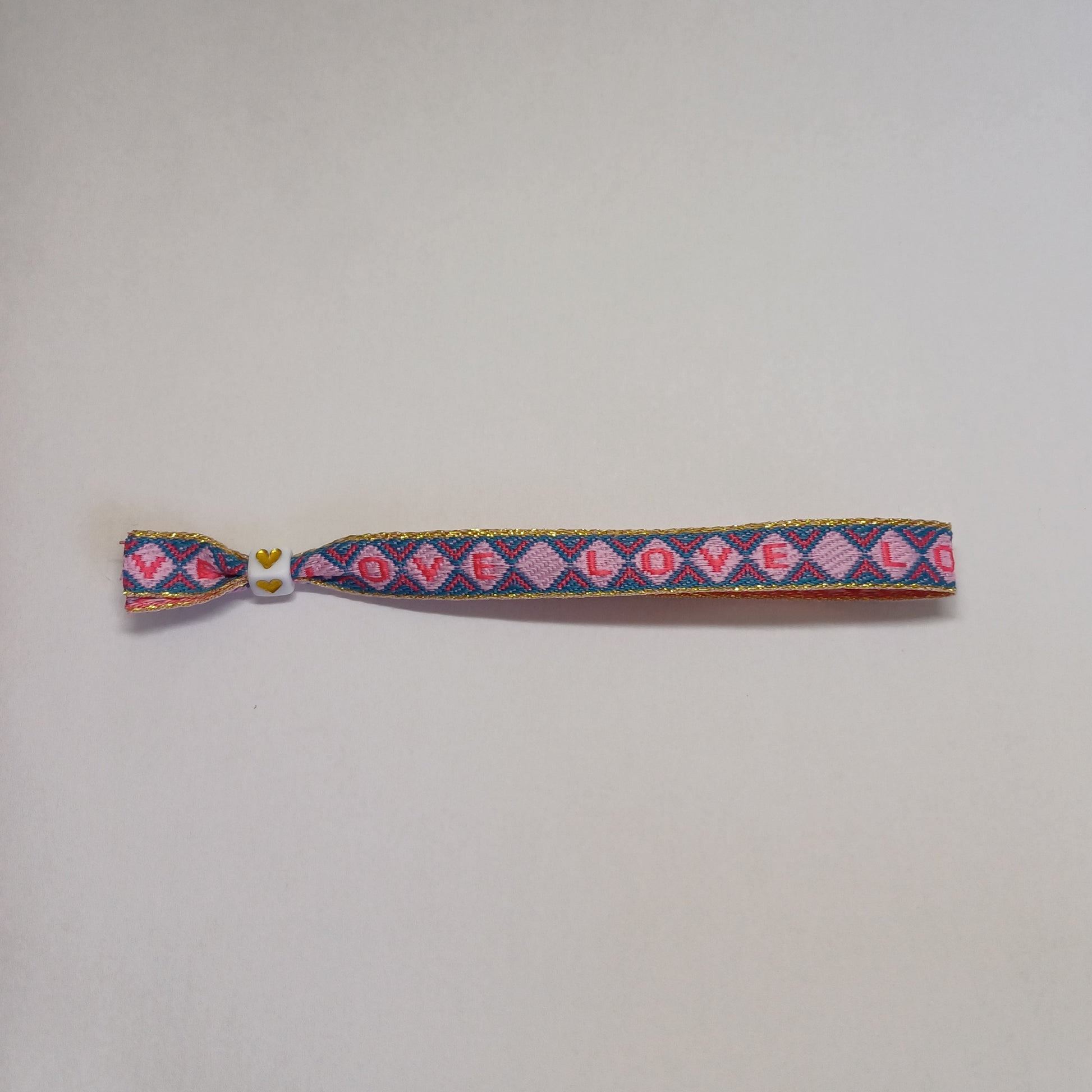 Dit is een stoffen bandjes met een verschuifbaar kraaltje aan zodat het makelijk aan en uit kan en ook voor (bijna) iedereen past. Hou er rekening mee dat de kleur van het hartjes kraaltje anders kan zijn dan op de foto!