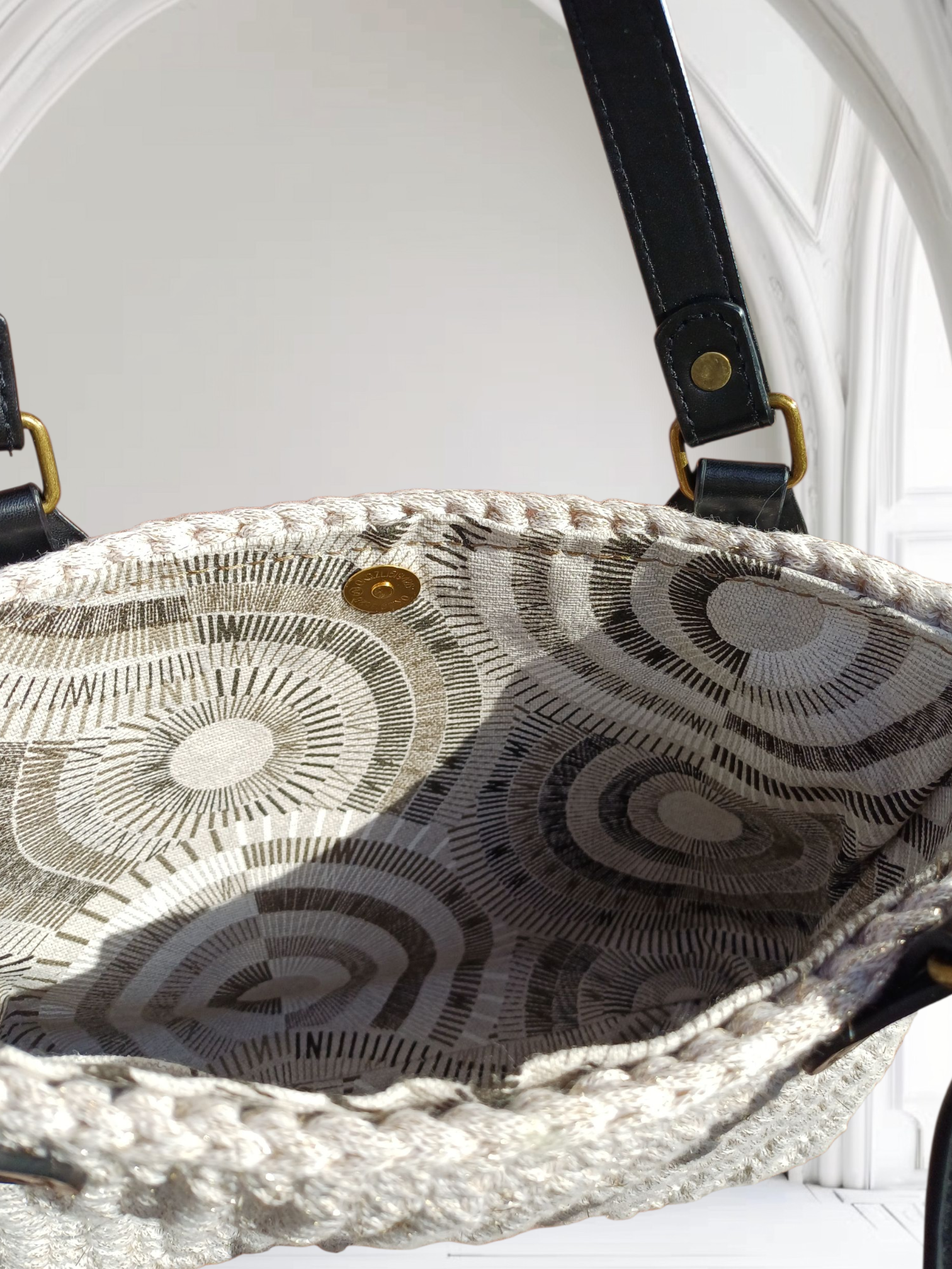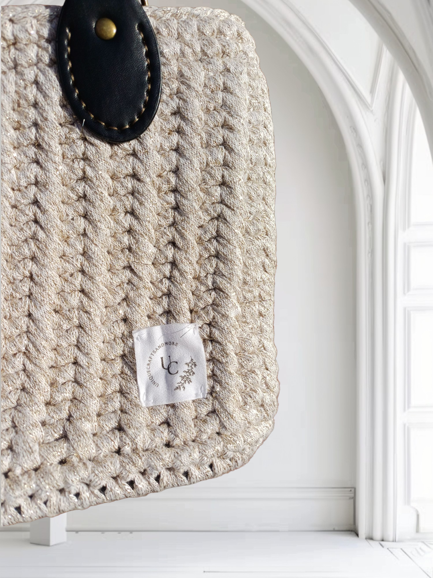 Dit is een zelfgemaakte handtas. De buitenkant van de handtas is gehaakt met 90% katoen en 10% polyester garen met een goud accent en de binnenkant van de tas is genaaid. De tas is afgewerkt met een magnetisch drukknop Er is ook een zakje aan de zijkant genaaid waar je allerlei spulletjes in kan steken!