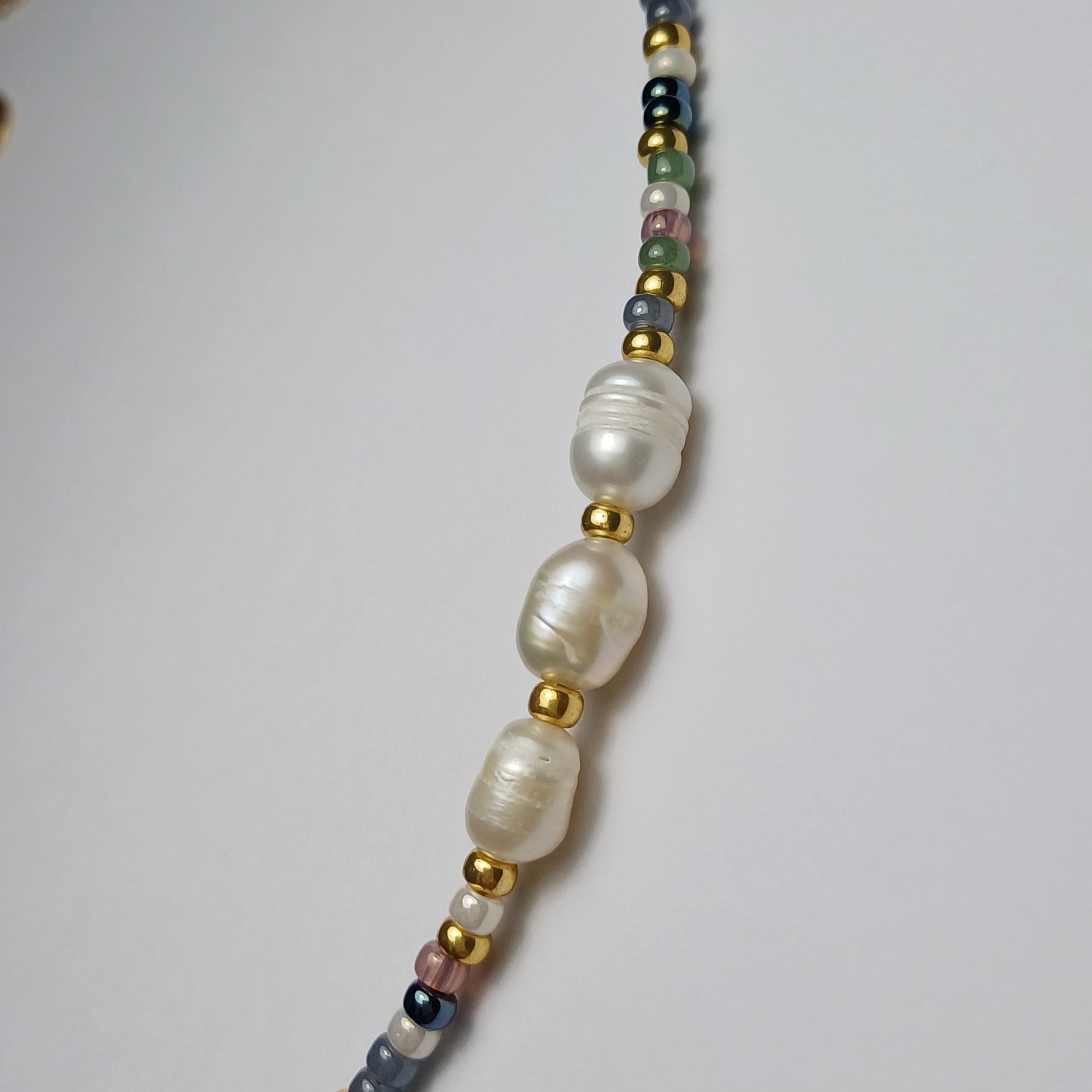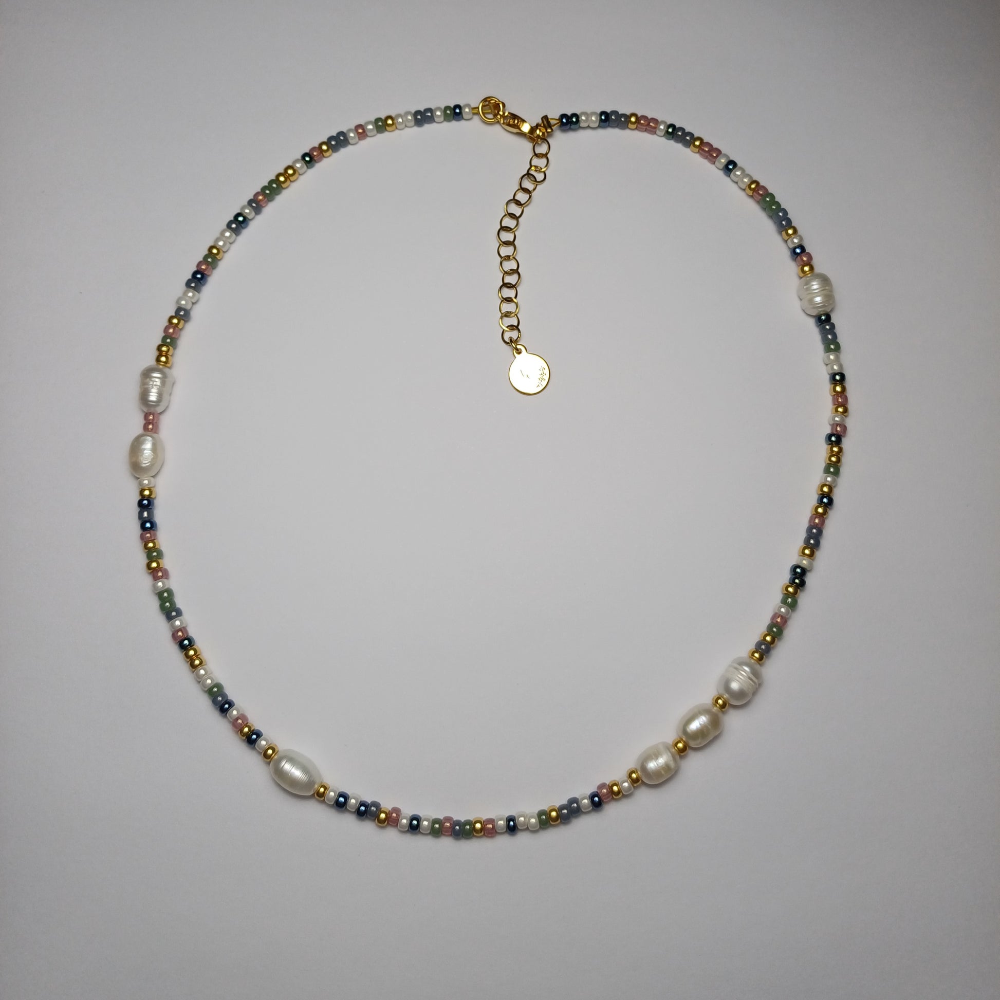 Probeer je ketting van water, parfum, zweet etc uit de buurt te houden. Hij kan hier normaal tegen maar het kan toch altijd zijn dat hij daardoor verkleurd en zo heb je er veel langer plezier van. 😊 (hij is gemaakt van miyuki rocailles & echte zoetwater parels )