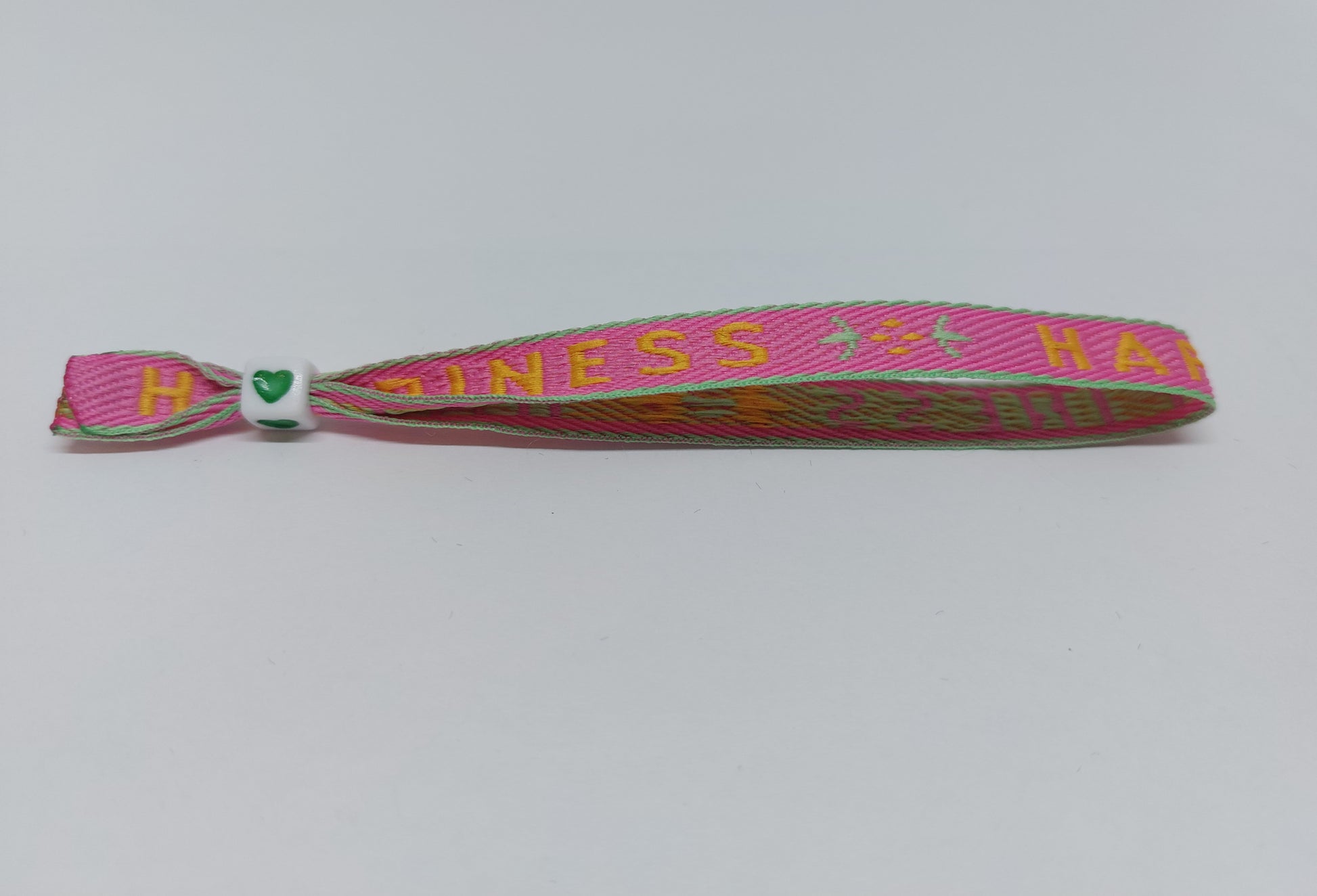 Dit is een stoffen bandjes met een verschuifbaar kraaltje aan zodat het makelijk aan en uit kan en ook voor (bijna) iedereen past. Hou er rekening mee dat de kleur van het hartjes kraaltje anders kan zijn dan op de foto!