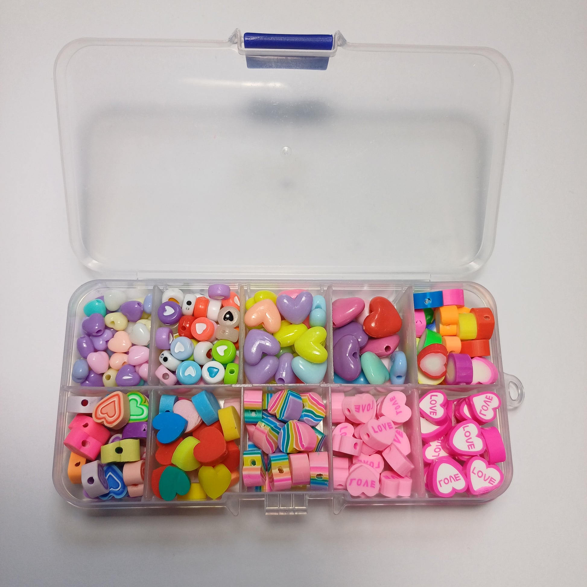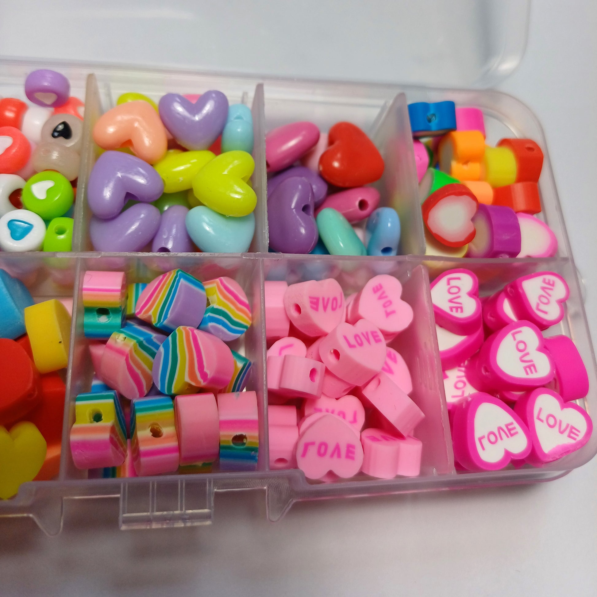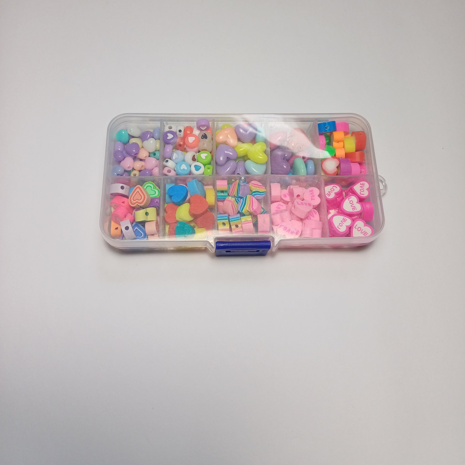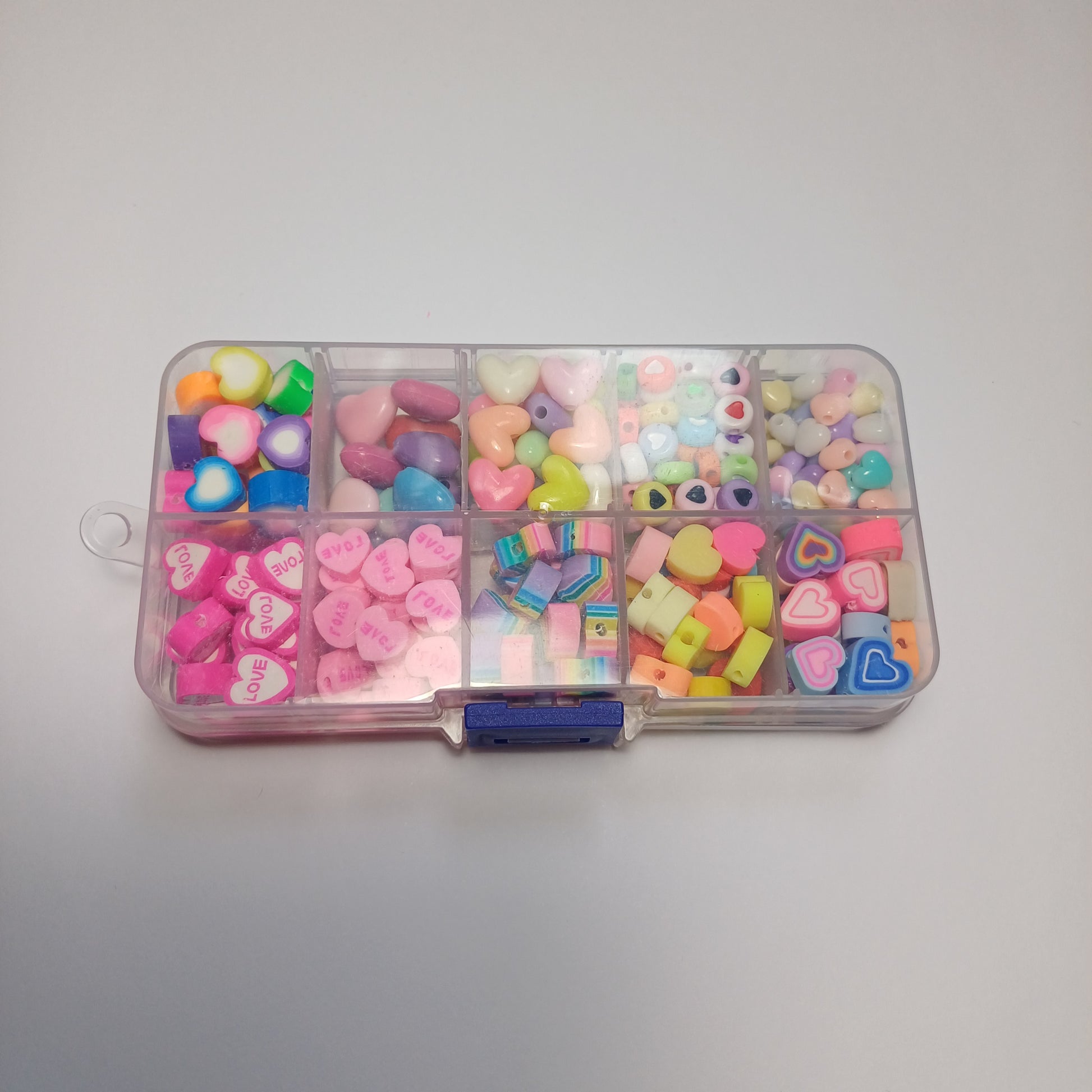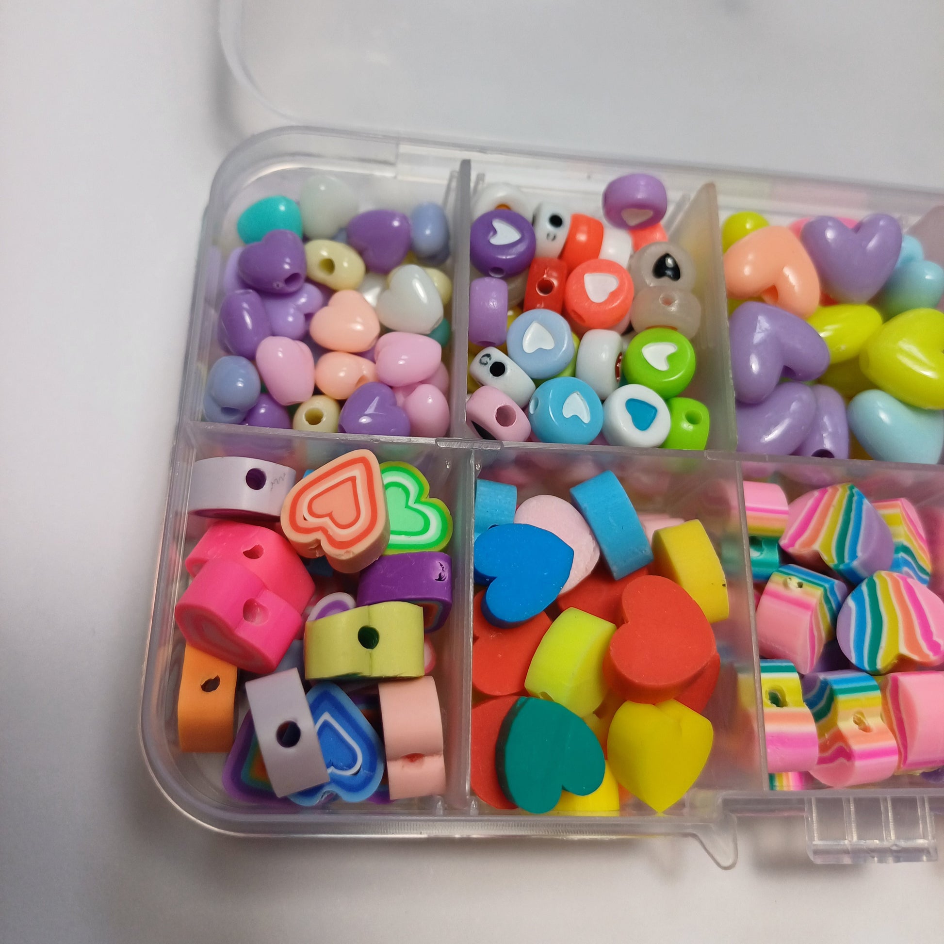 Dit is een kralen bakje (er staan wat krasjes op het bakje ) met allerlei verschillende soorten hartjes kralen wat zit er in? : 50x hartjes acryl pastel kralen , 65x hartjes acryl mix , 25x hartjes acryl, 10x hartjes acryl, 24x hartjes polymeer, 22x hartjes polymeer, 25x hartjes polymeer, 19x hartjes polymeer, 25x hartjes polymeer, 25x hartjes polymeer.