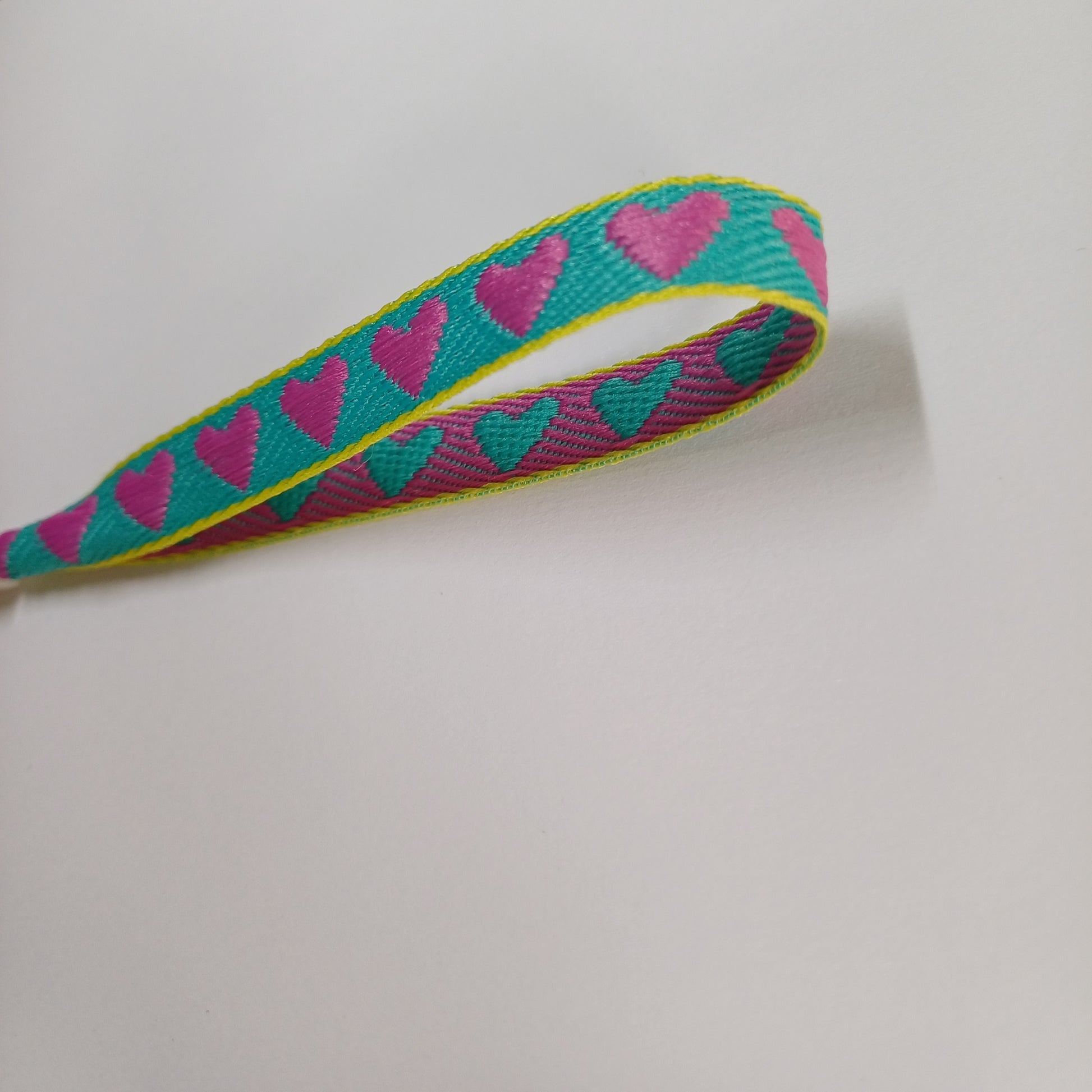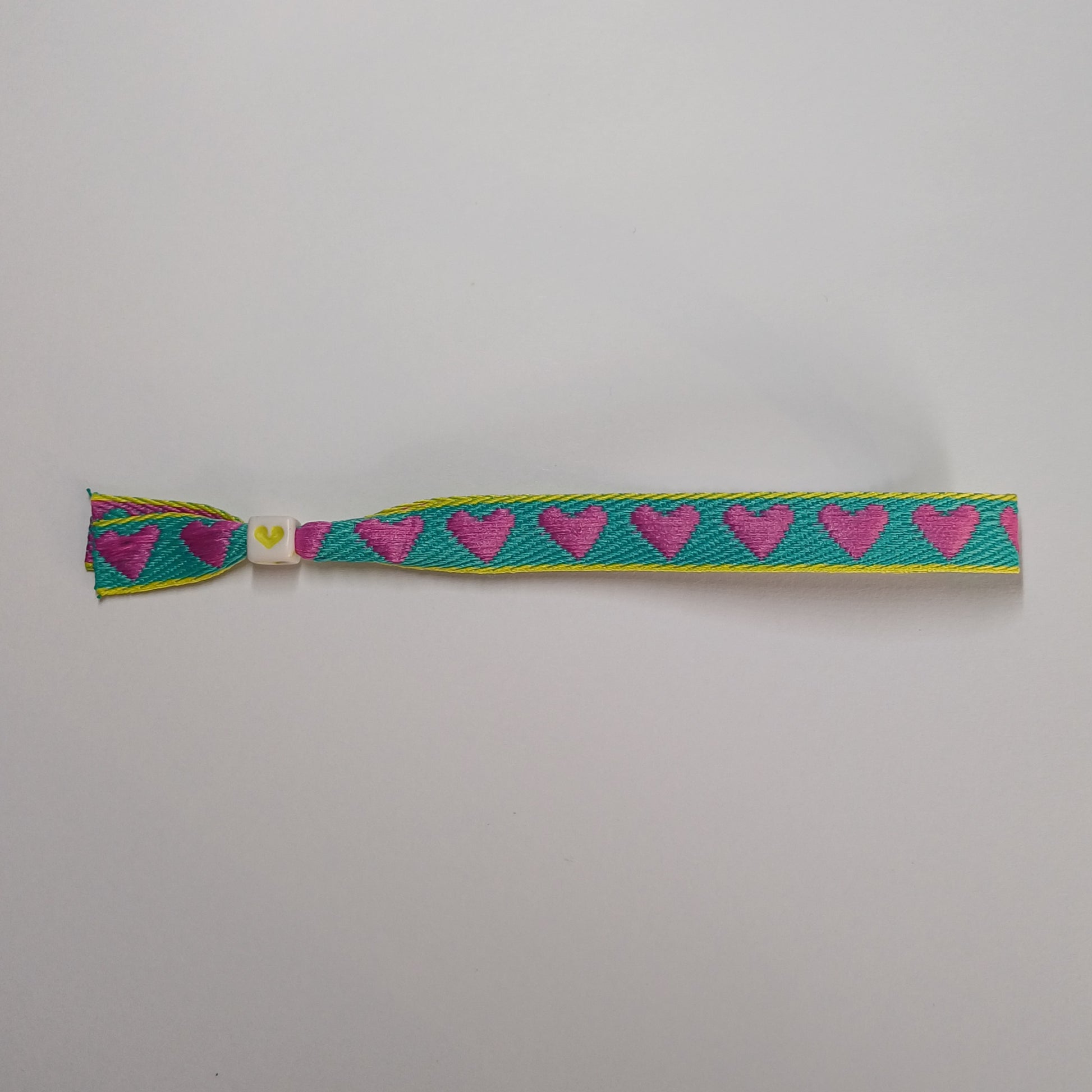 Dit is een stoffen bandjes met een verschuifbaar kraaltje aan zodat het makelijk aan en uit kan en ook voor (bijna) iedereen past. Hou er rekening mee dat de kleur van het hartjes kraaltje anders kan zijn dan op de foto!