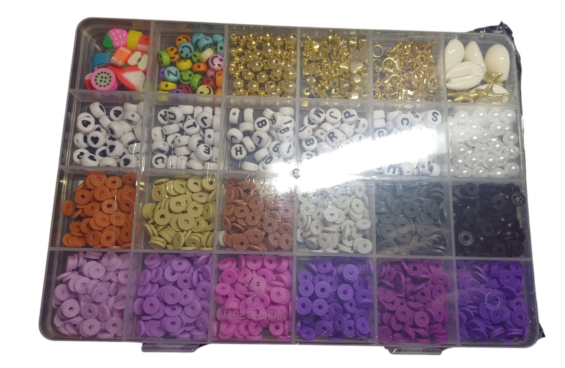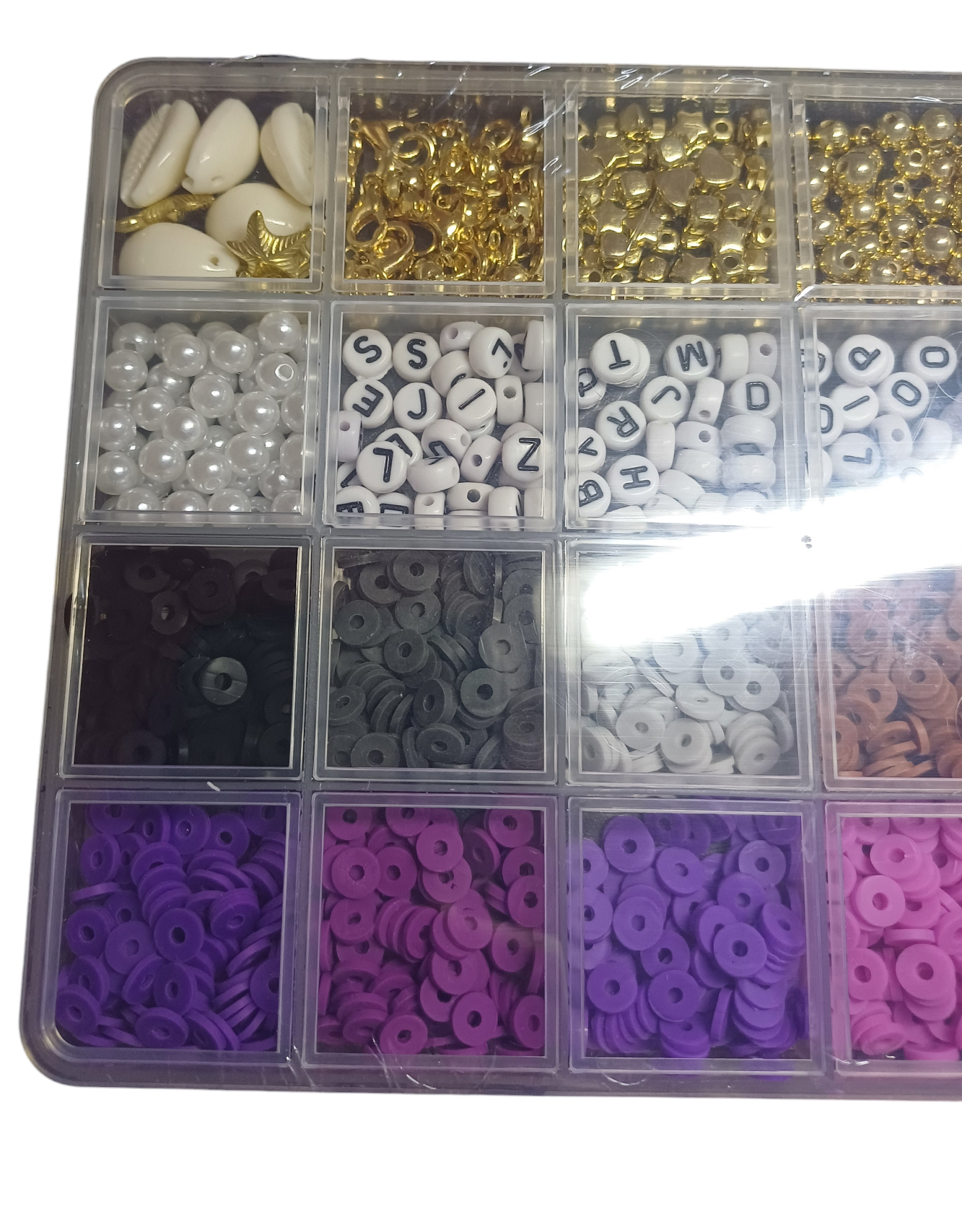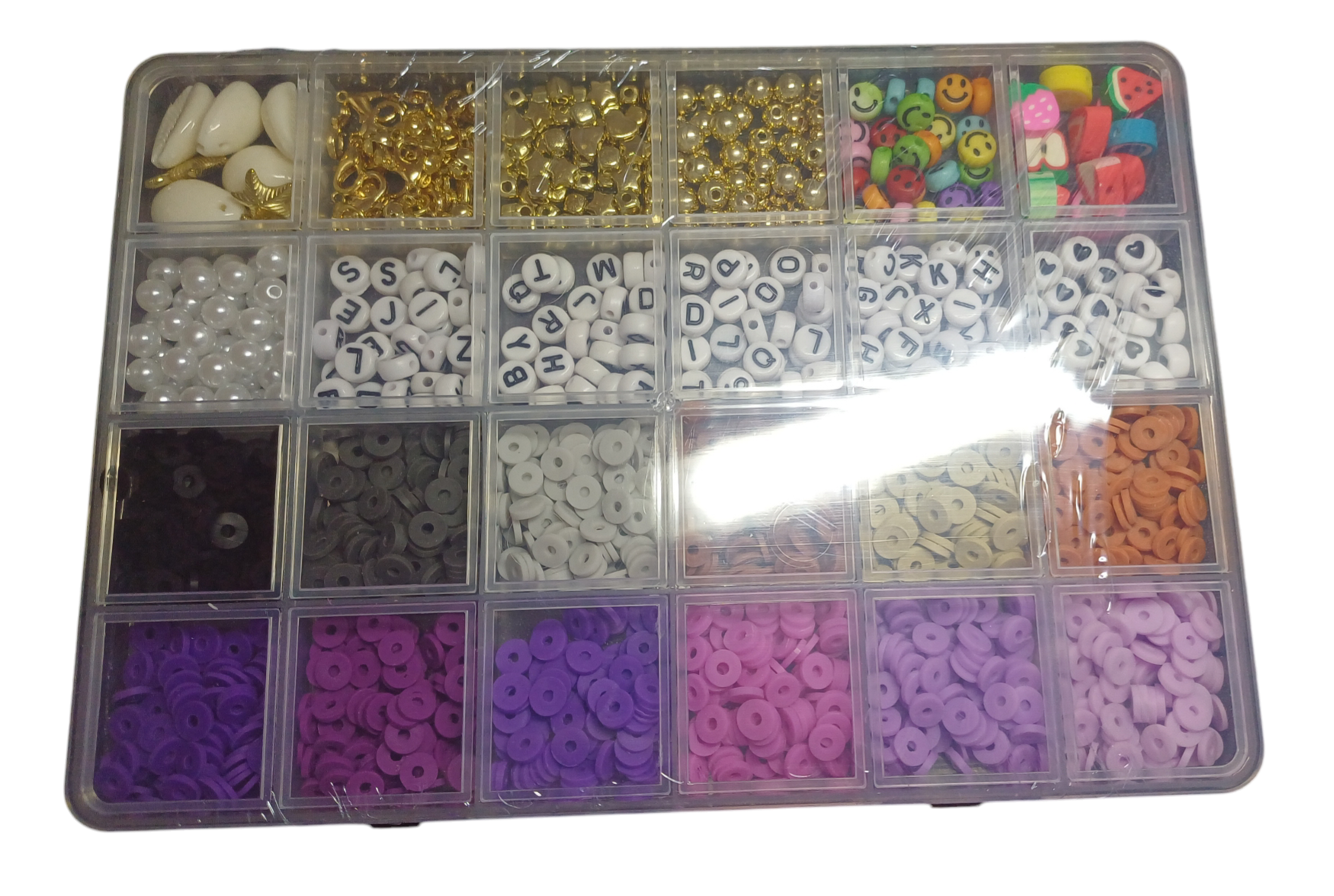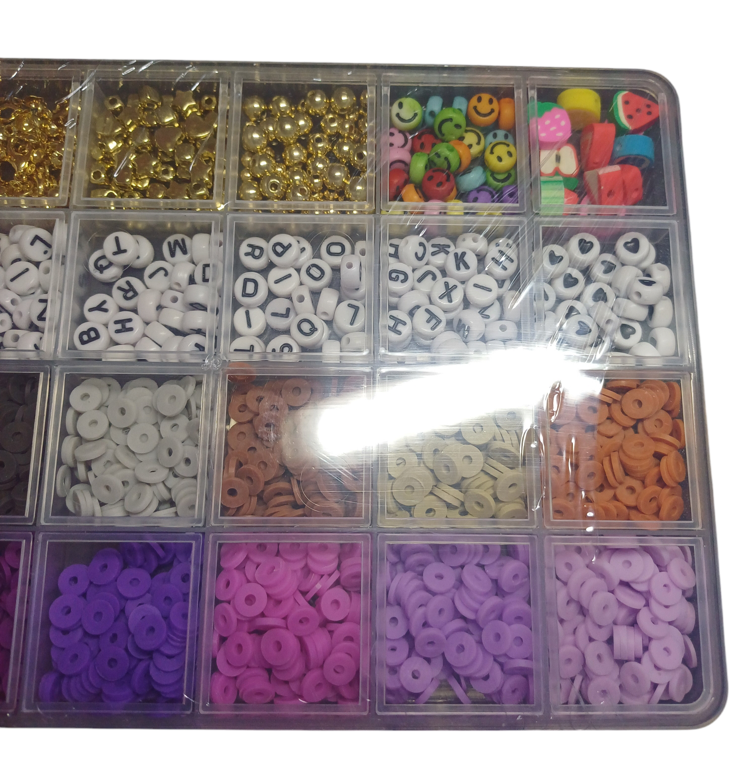 Dit is een kralenbox met afmetingen 19x13x2cm met katsuki kralen, letterkralen, acryl figuur kralen,allerlei gouden kralen, onderdelen, bedels,...( +-2000stuks)