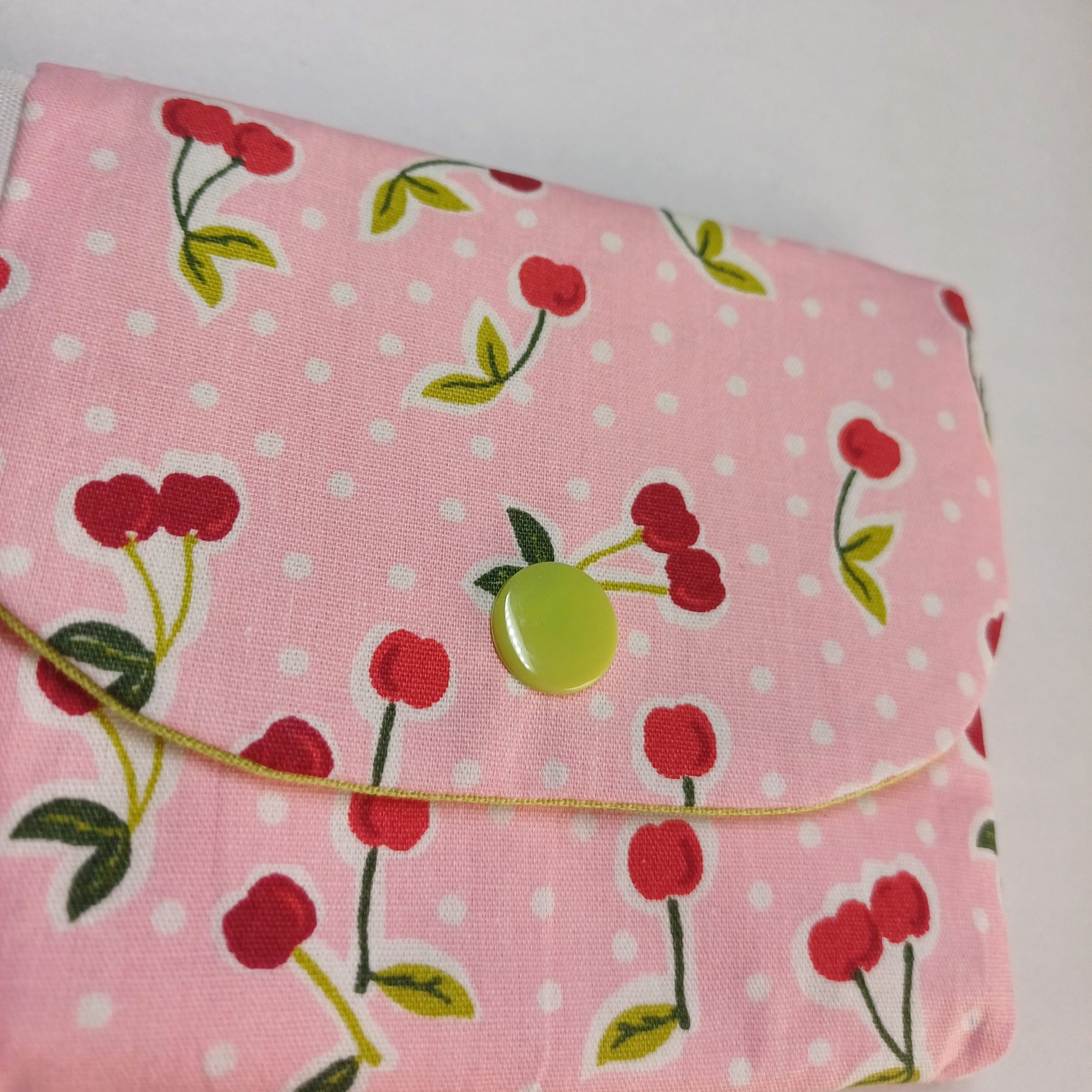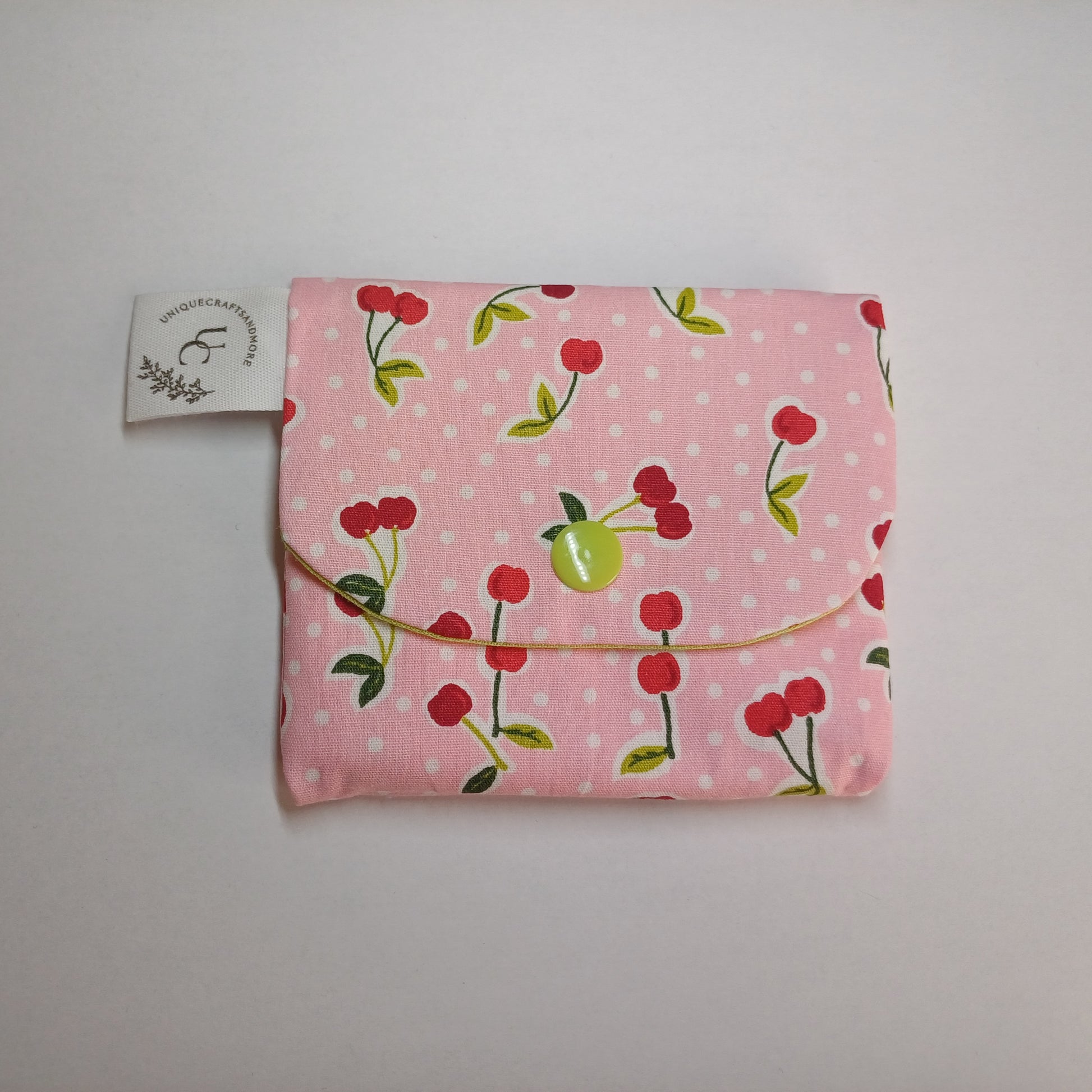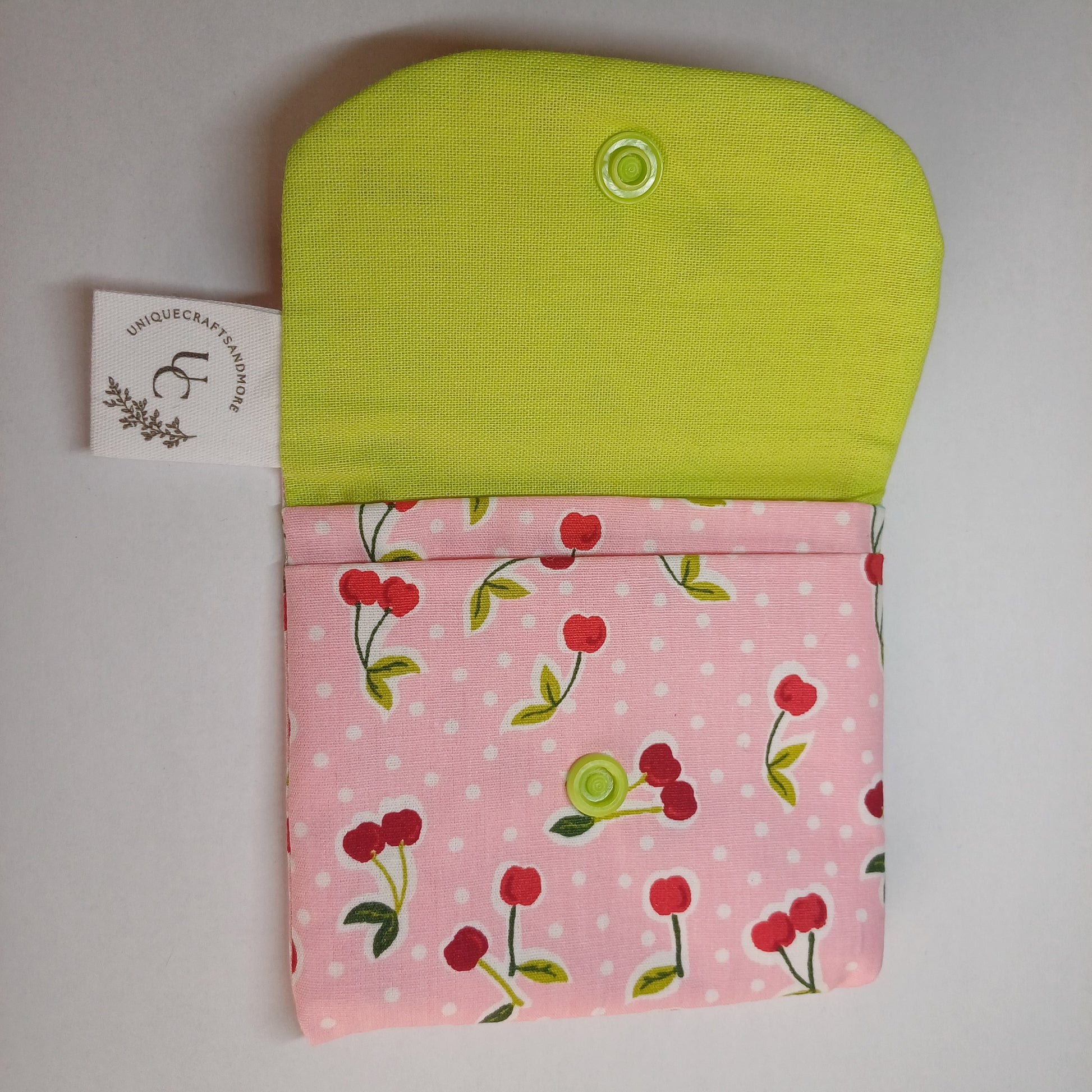 Dit is een handgemaakte portefeuille met een leuke print😊 hij is 11 cm breed en 10 cm hoog.