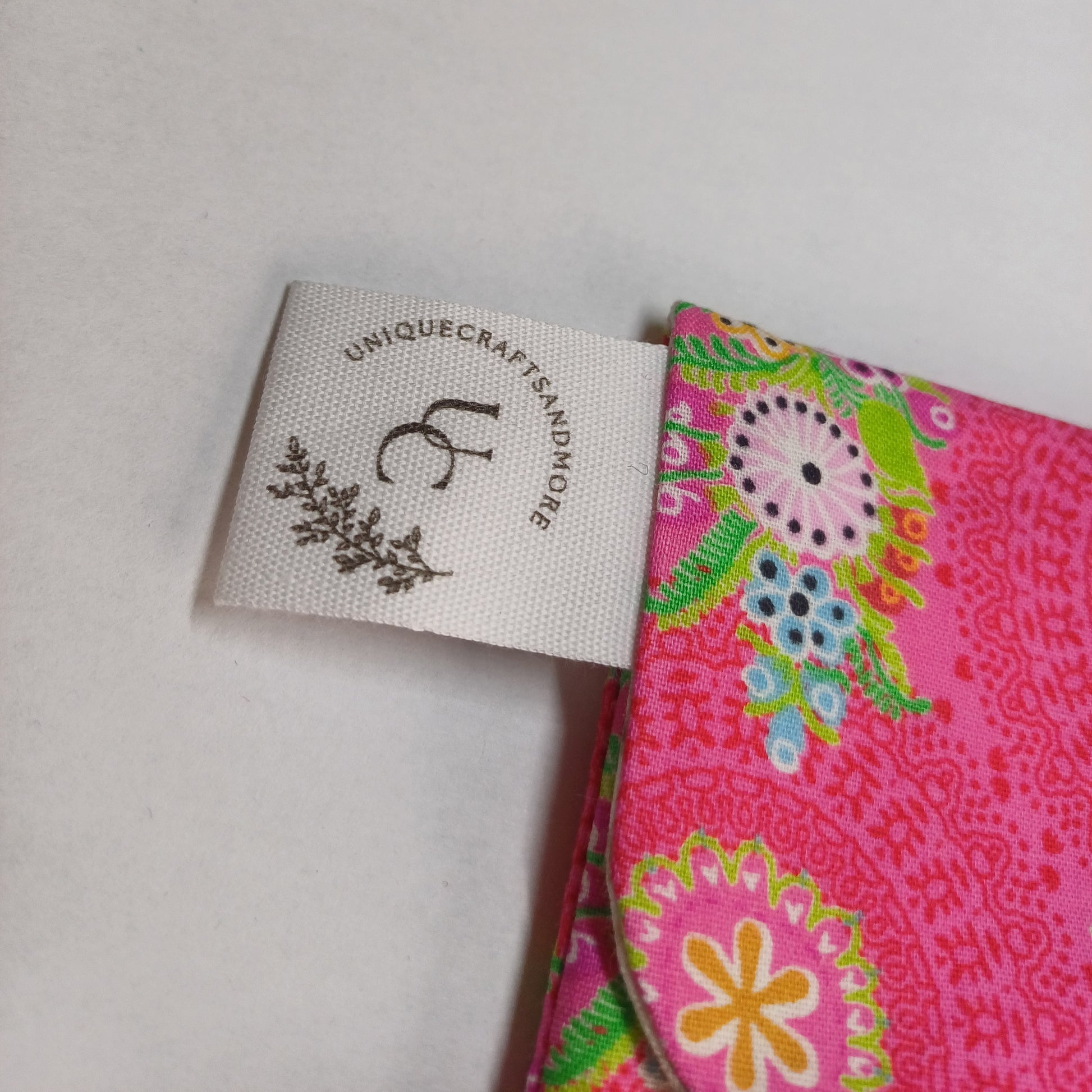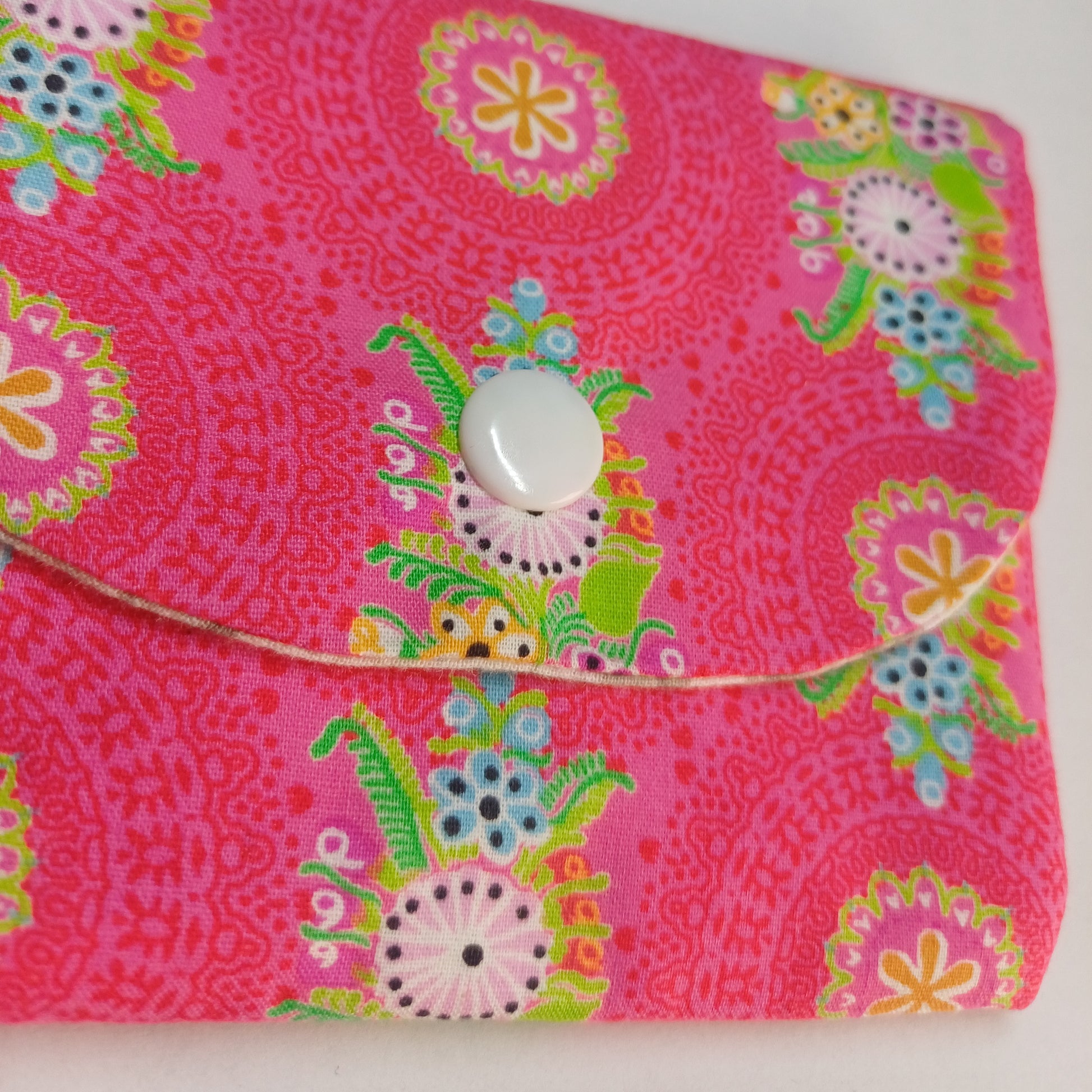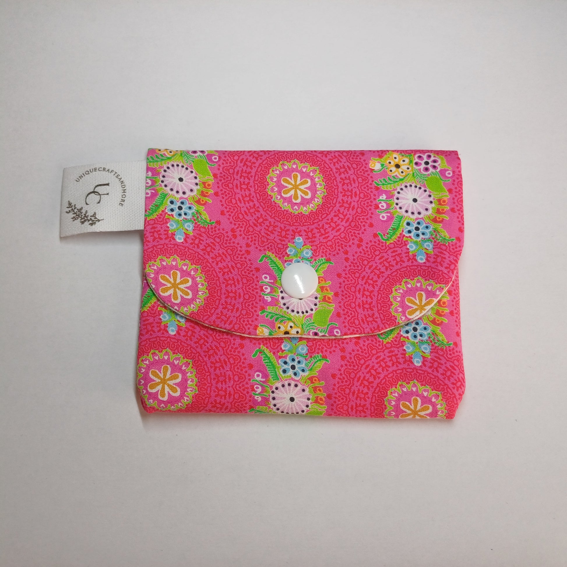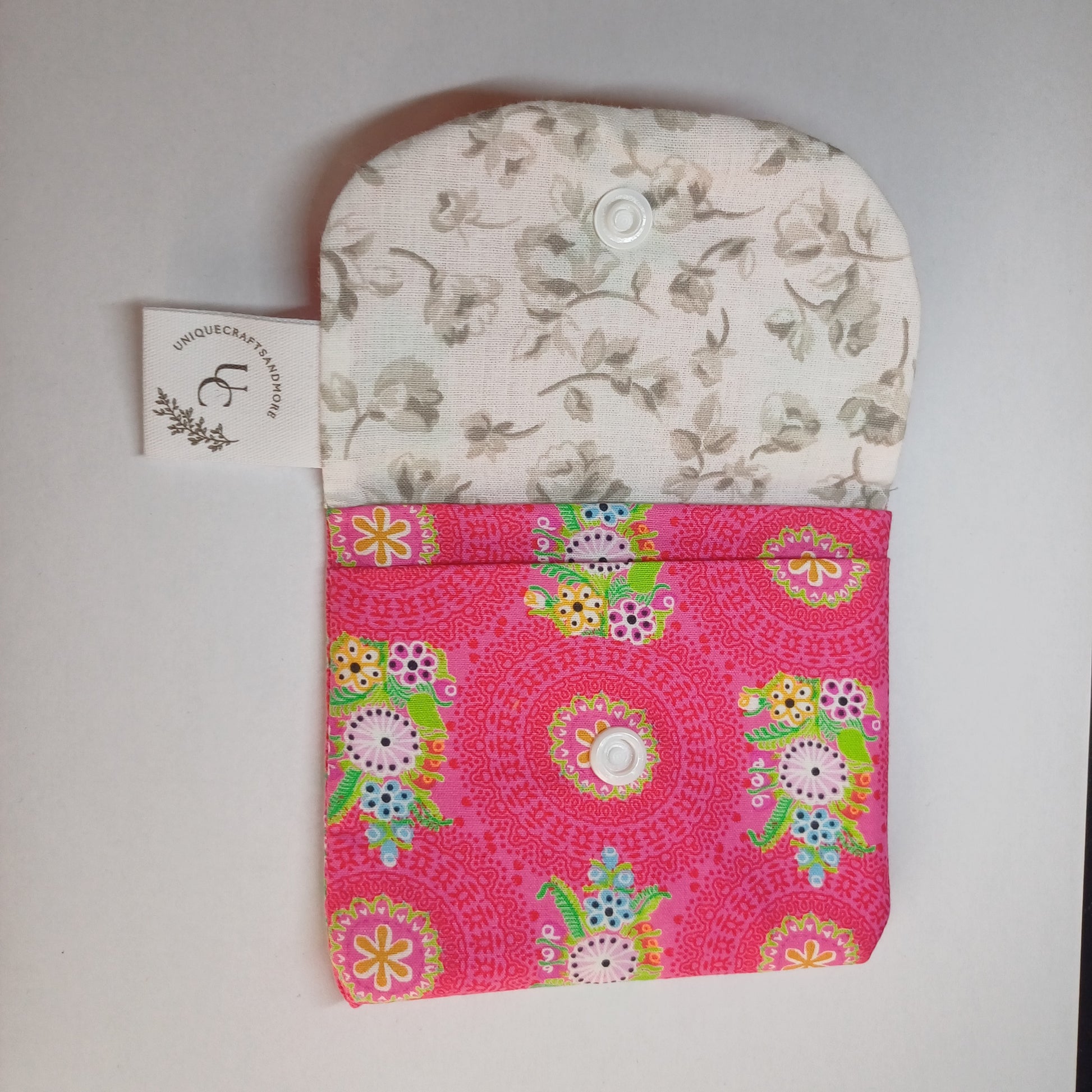Dit is een handgemaakte portefeuille met een leuke print😊 hij is 11 cm breed en 10 cm hoog.