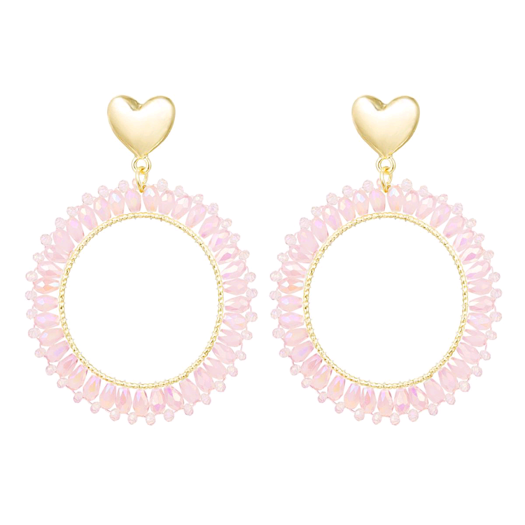 Prachtige ronde oorbellen met lichtroze kristalkralen en een goud hartje. De oorbellen zijn perfect om net wat meer kleur aan jouw outfit te geven! Ook helemaal leuk als je voor een kleurrijke outfit gaat! De oorbellen zijn gemaakt van kristalkralen en alloy. Oorbellen rond kristalkralen hebben een afmeting van 5,9 cm en zijn leuk te combineren met meerdere kleine gouden oorbellen. Deze zijn ook beschikbaar in andere kleuren!