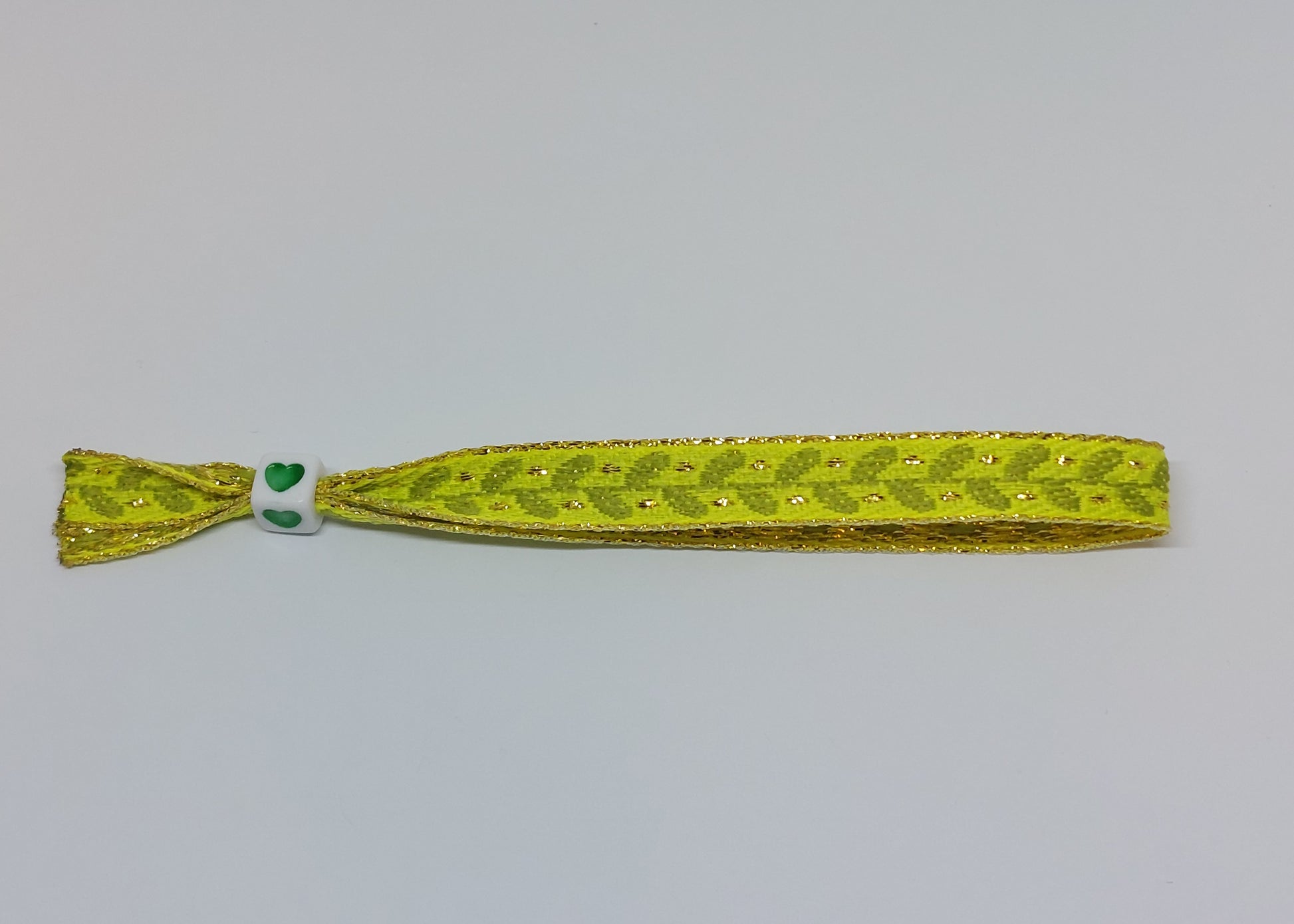 Dit is een stoffen bandjes met een verschuifbaar kraaltje aan zodat het makelijk aan en uit kan en ook voor (bijna) iedereen past. Hou er rekening mee dat de kleur van het hartjes kraaltje anders kan zijn dan op de foto!
