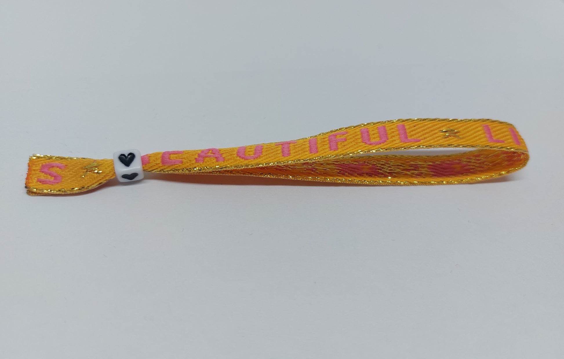 Dit is een stoffen bandjes met een verschuifbaar kraaltje aan zodat het makelijk aan en uit kan en ook voor (bijna) iedereen past. Hou er rekening mee dat de kleur van het hartjes kraaltje anders kan zijn dan op de foto!