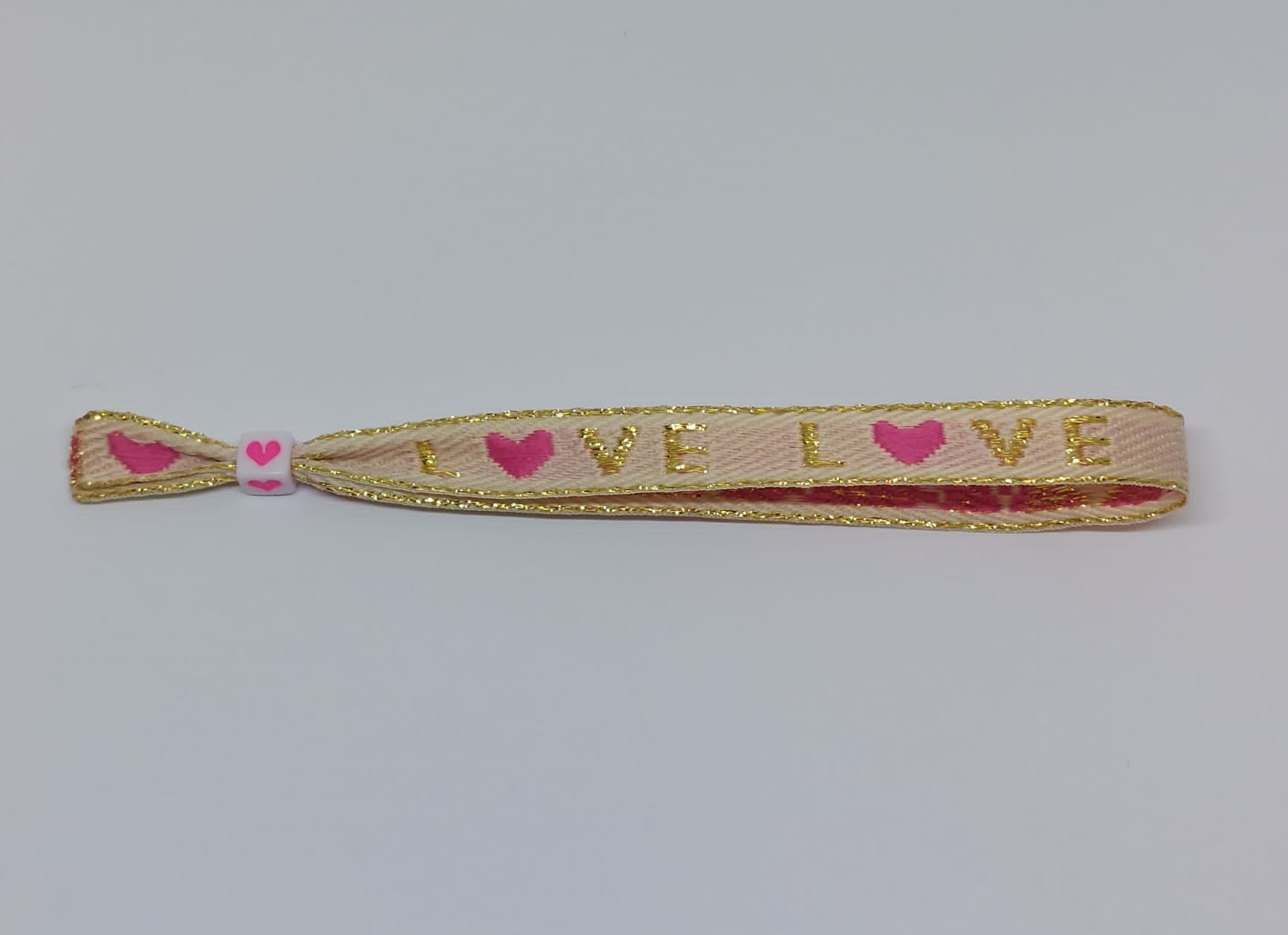 Dit is een stoffen bandjes met een verschuifbaar kraaltje aan zodat het makelijk aan en uit kan en ook voor (bijna) iedereen past. Hou er rekening mee dat de kleur van het hartjes kraaltje anders kan zijn dan op de foto!