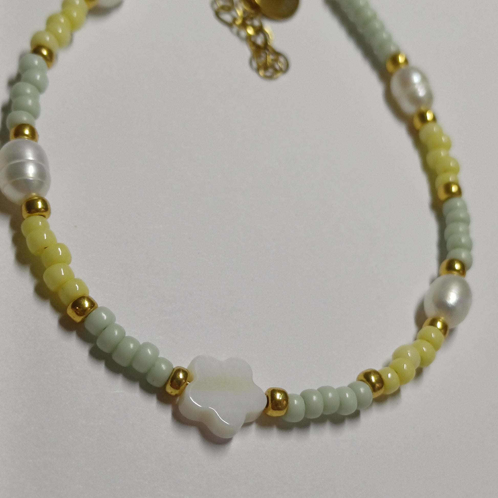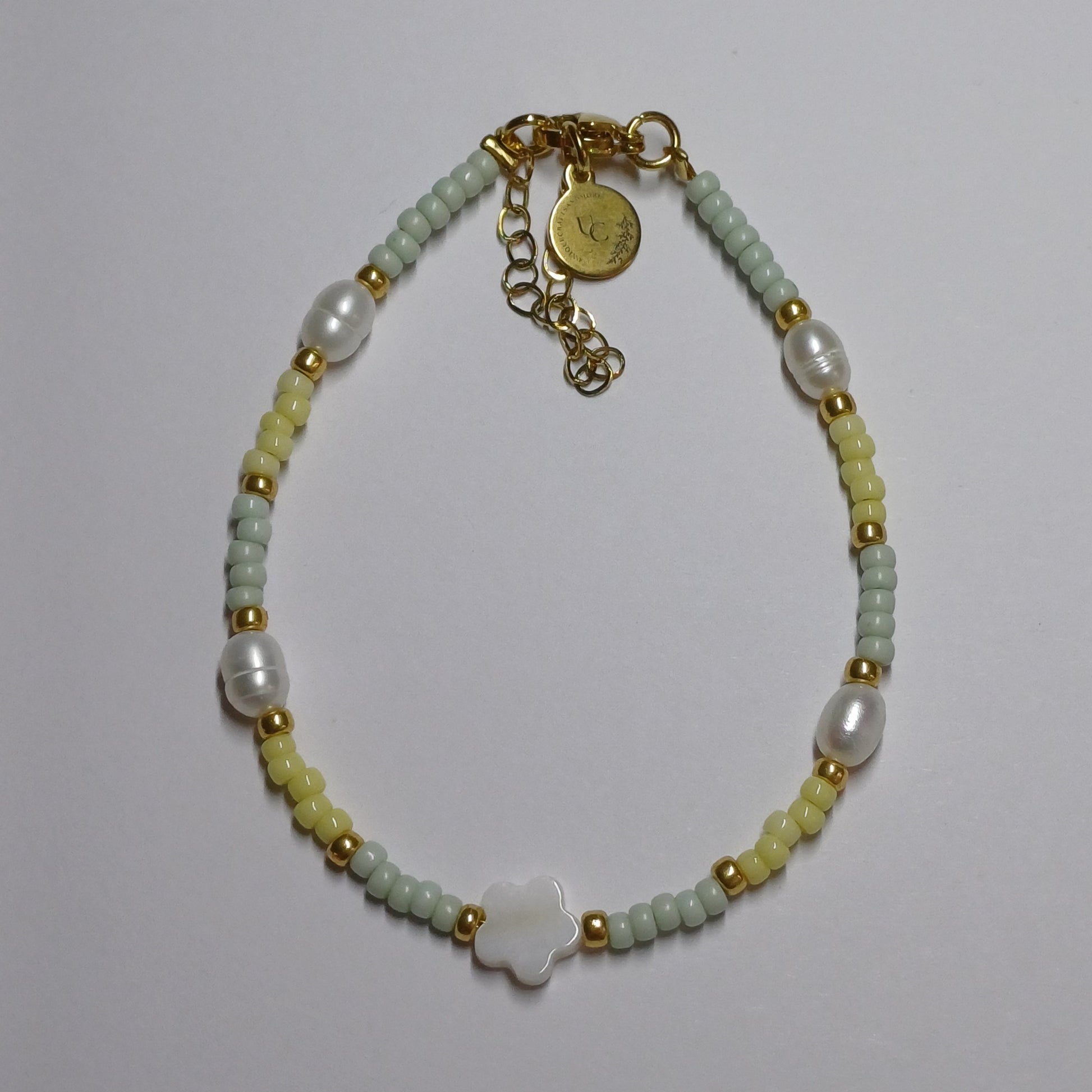 Probeer je armbandje van water, parfum, zweet etc uit de buurt te houden. Hij kan hier normaal tegen maar het kan toch altijd zijn dat hij daardoor verkleurd en zo heb je er veel langer plezier van. 😊 (hij is gemaakt van miyuki rocailles , schelpen bloemtje & zoetwaterparels )
