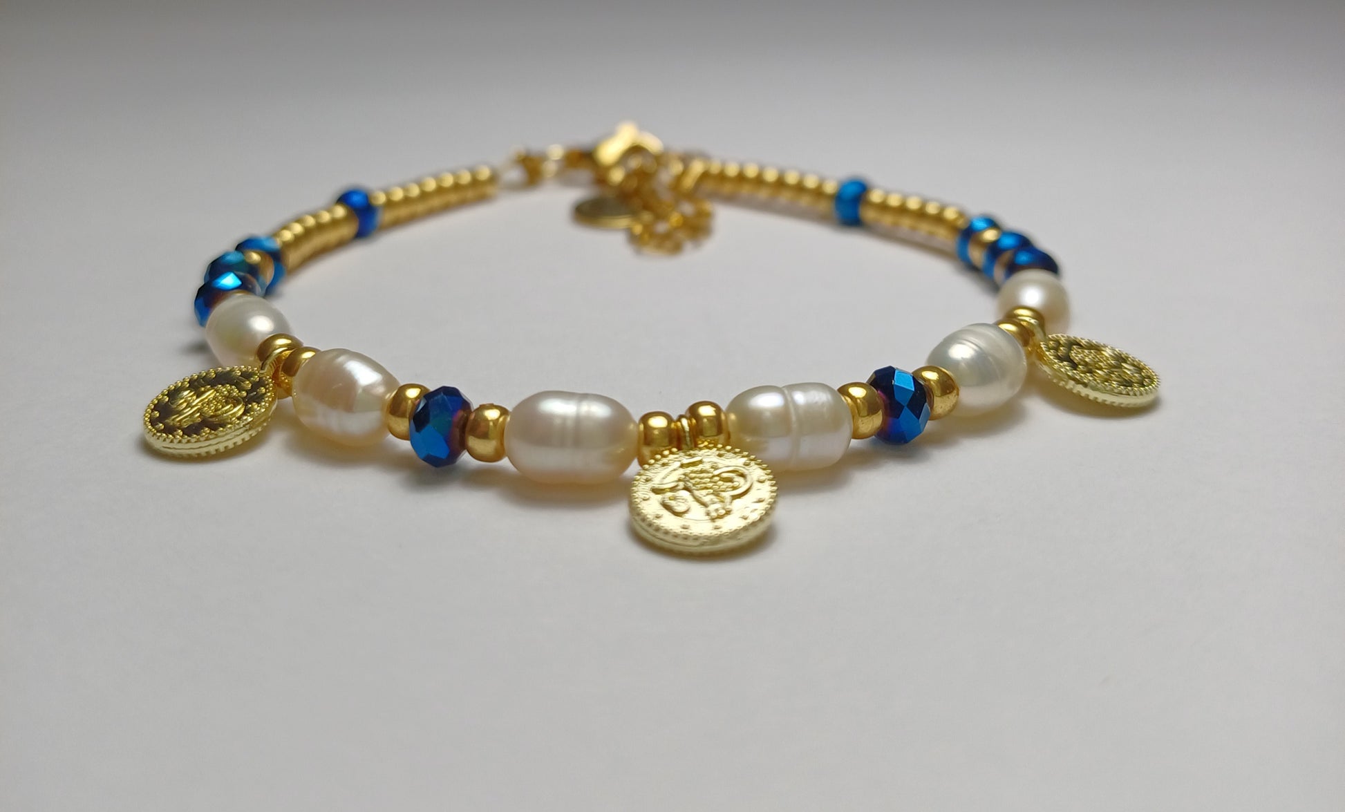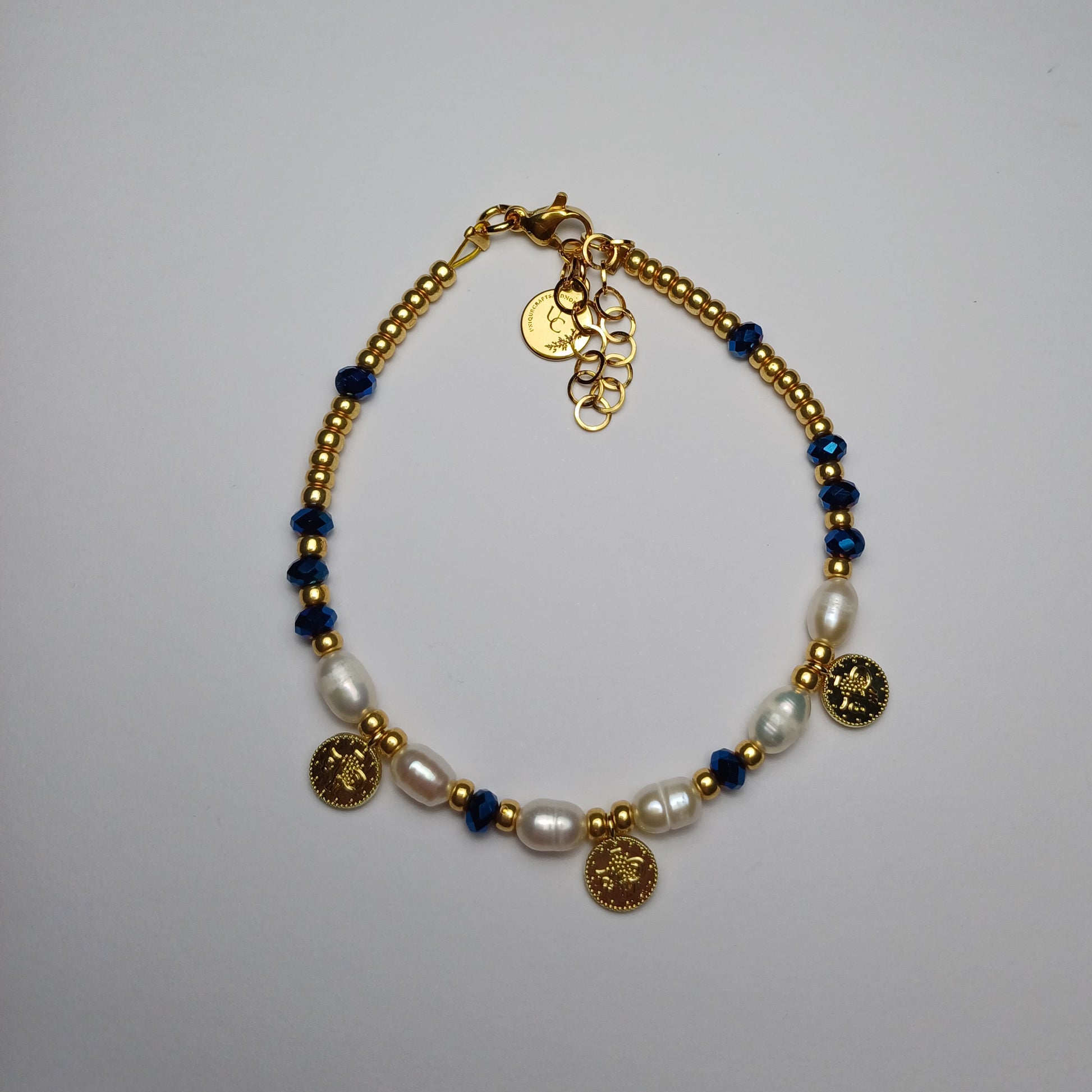 Probeer je armbandje van water, parfum, zweet etc uit de buurt te houden. Hij kan hier normaal tegen maar het kan toch altijd zijn dat hij daardoor verkleurd en zo heb je er veel langer plezier van. 😊 (hij is gemaakt van miyuki rocailles(goude), dq bedels en echte zoetwaterparels)(de blauwe kraaltjes kunnen ook verkleuren!)
