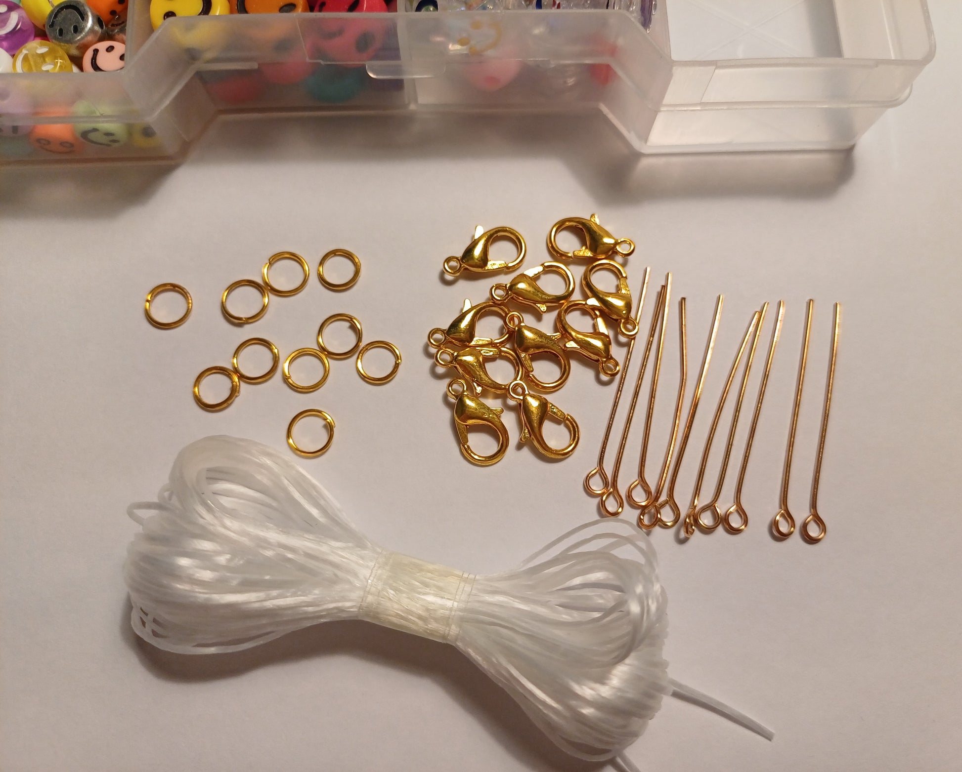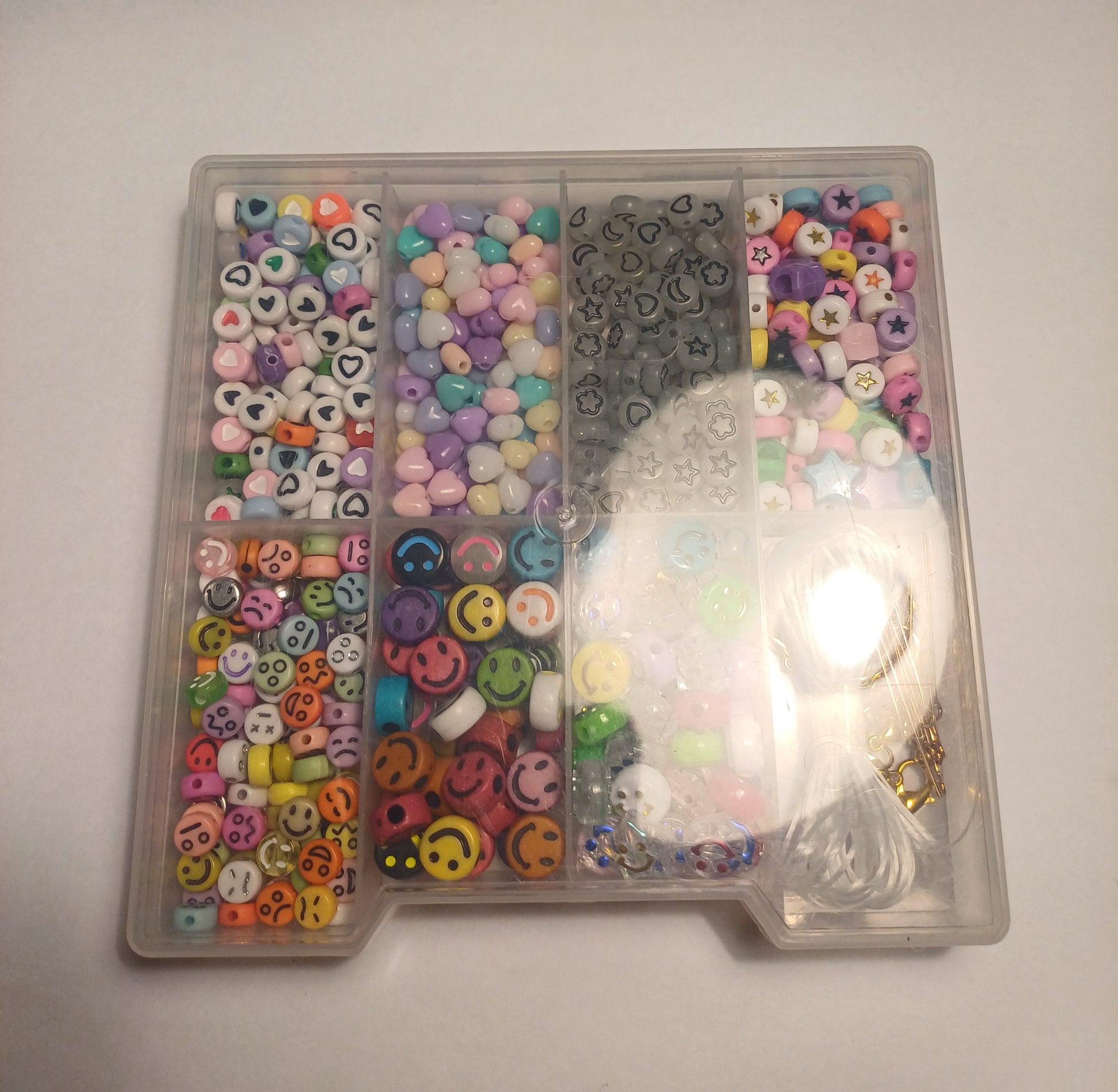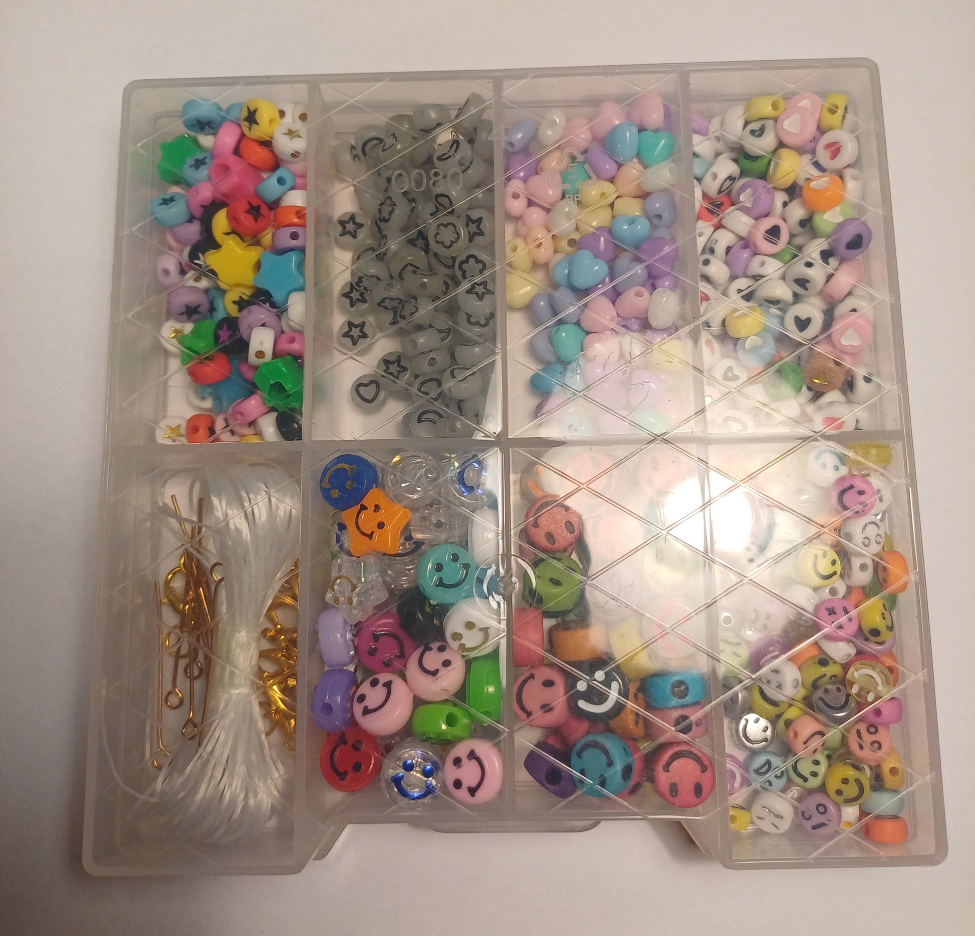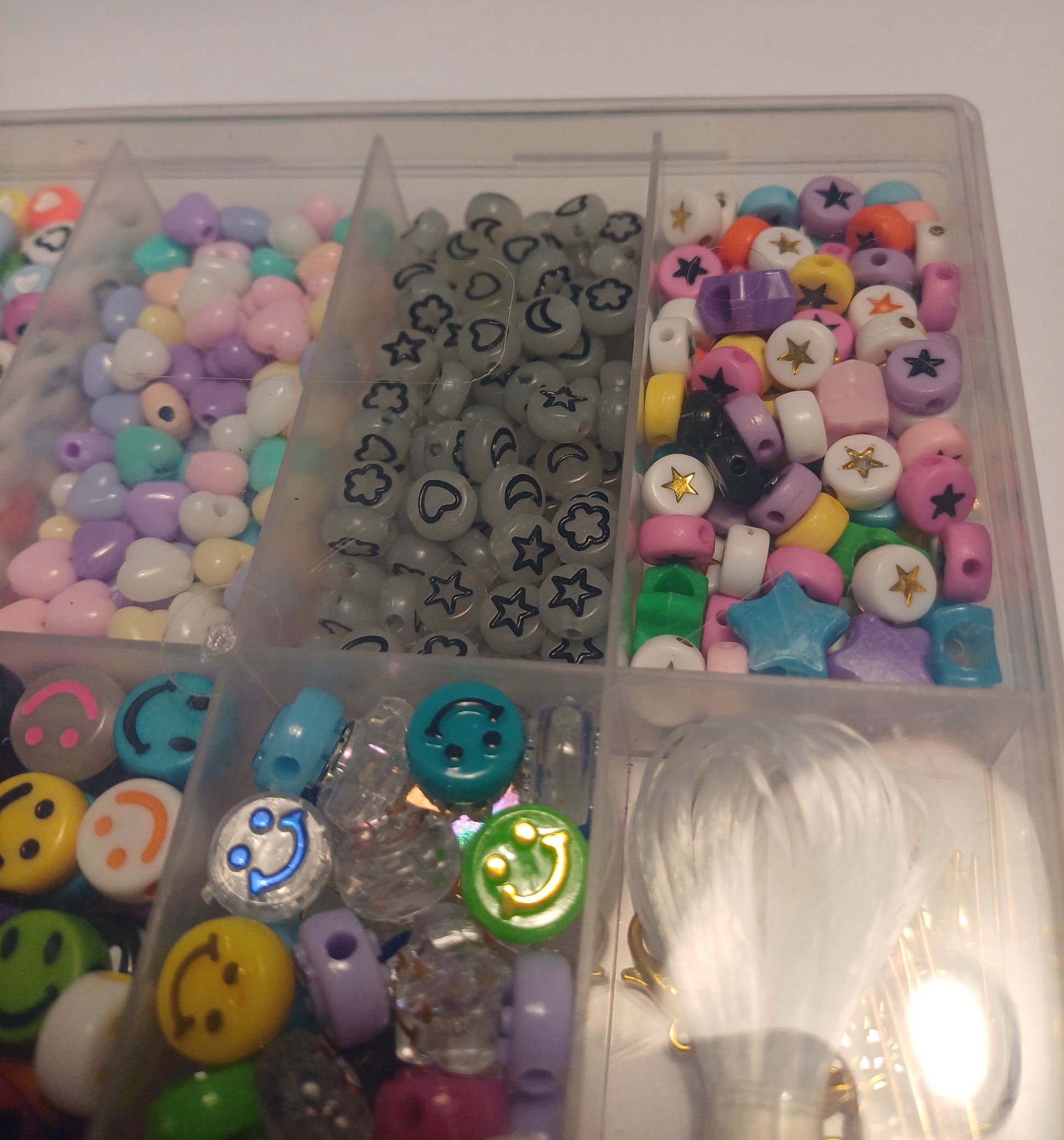 Dit is een kralen bakje (er staan wat krasjes op het bakje ) met allerlei verschillende soorten acryl kralen en onderdelen wat zit er in? : 100x hartjes acryl kralen , 100x hartjes acryl pastel kralen , 100x figuren mix acryl kralen , 100x ster acryl kralen , 100x smiley acryl kralen , 50x grote smiley acryl kralen , 50x grote 3d smiley acryl kralen, 1x stukje draad , 10x goudkleurige slotjes , 10x goudkleurige buigringen , 10x goudkleurige staafjes.