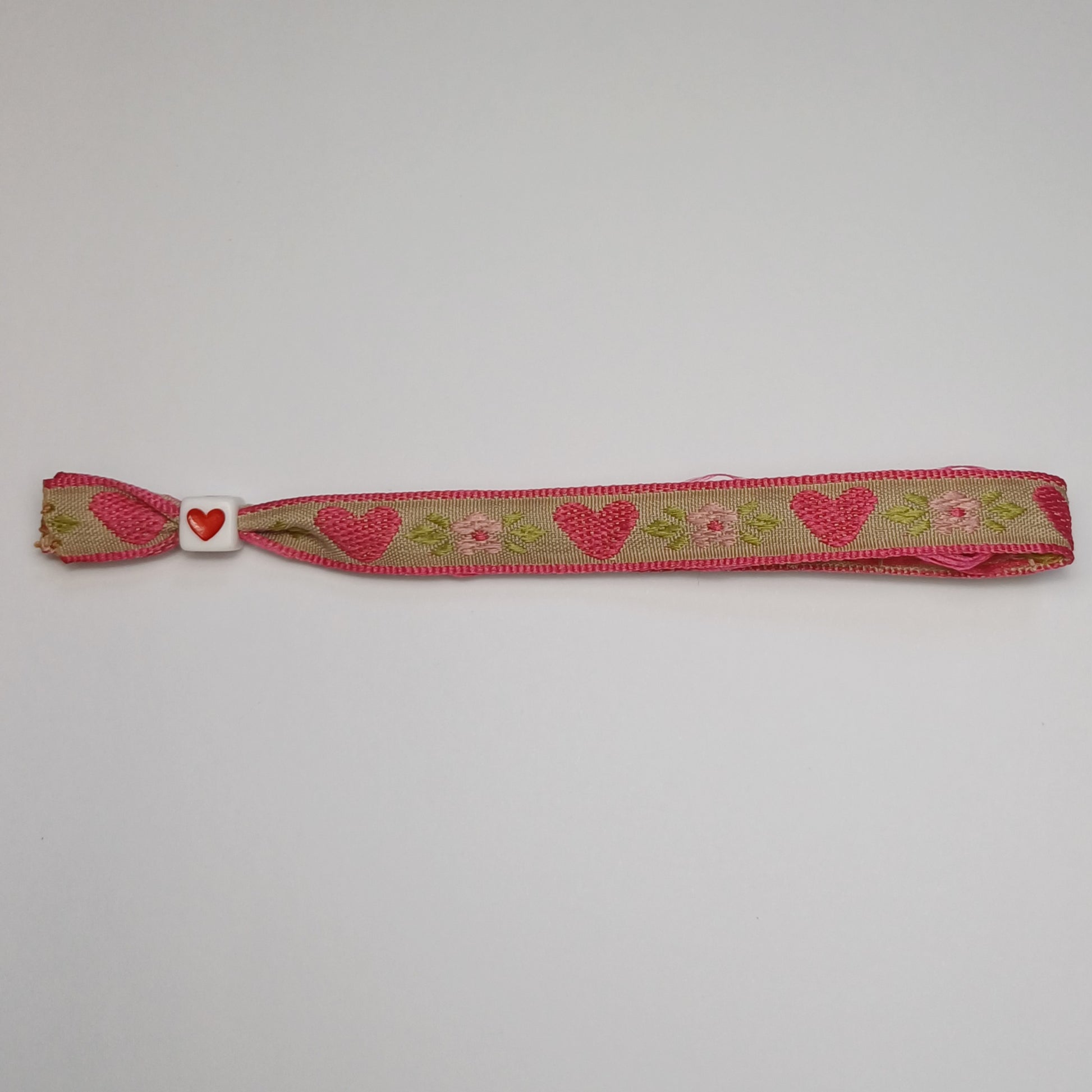 Dit is een stoffen bandjes met een verschuifbaar kraaltje aan zodat het makelijk aan en uit kan en ook voor (bijna) iedereen past. Hou er rekening mee dat de kleur van het hartjes kraaltje anders kan zijn dan op de foto!