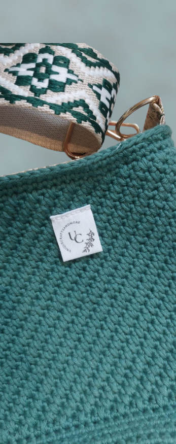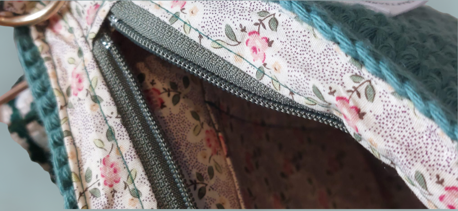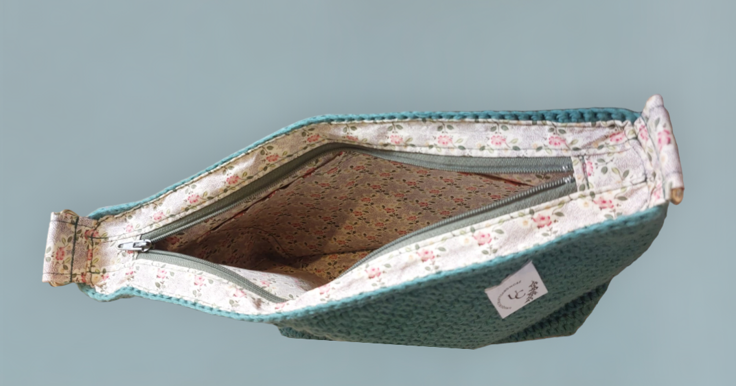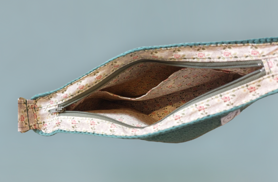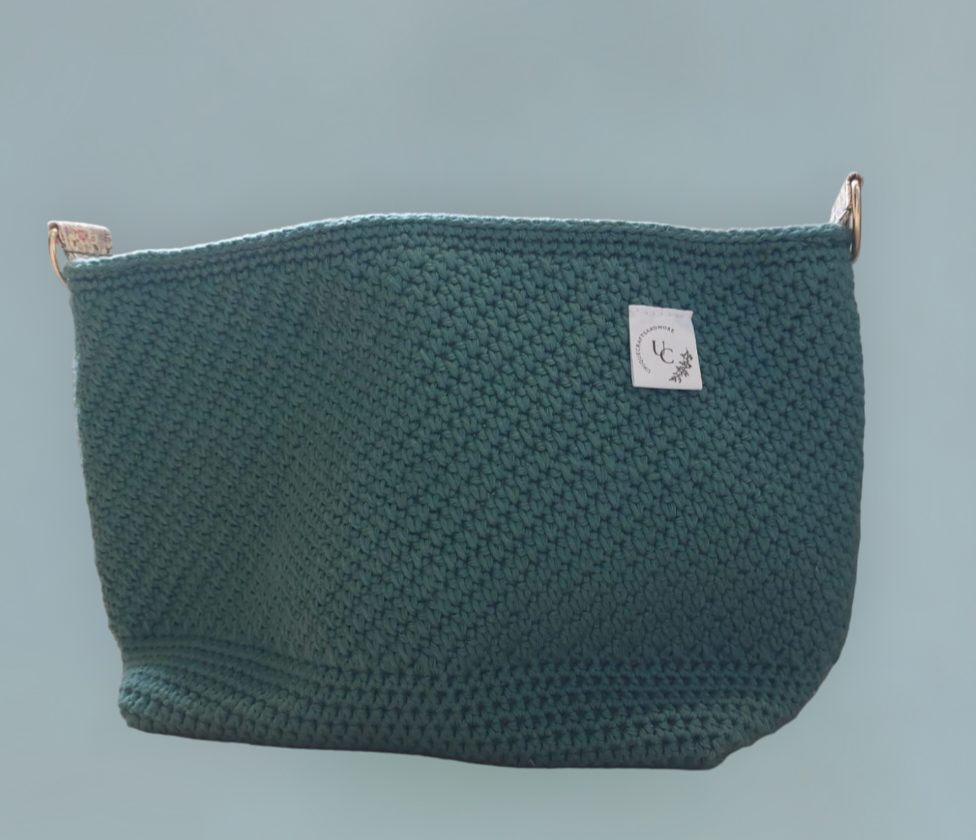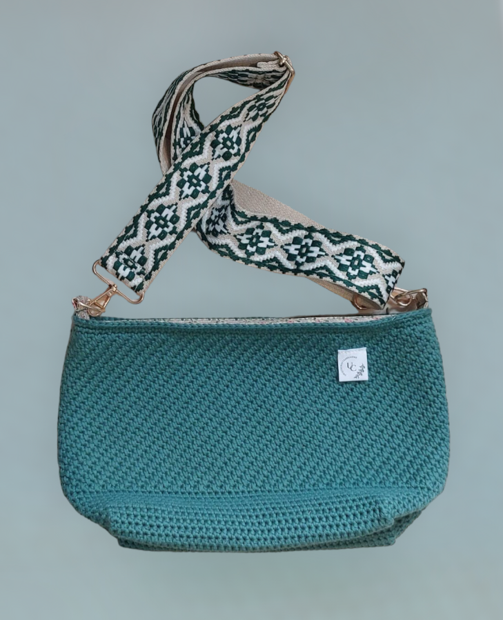 Dit is een zelfgemaakte handtas. De buitenkant van de handtas is gehaakt met 100% katoen garen en de binnenkant van de tas is genaaid. De tas is afgewerkt met een rits. Er is ook een zakje aan de zijkant genaaid waar je allerlei spulletjes in kan steken! Ook zit er een Groen/wit tassenlint bij zodat je hem gemakkelijk over je schouder kan hangen, dit lint is ook verstelbaar 😊