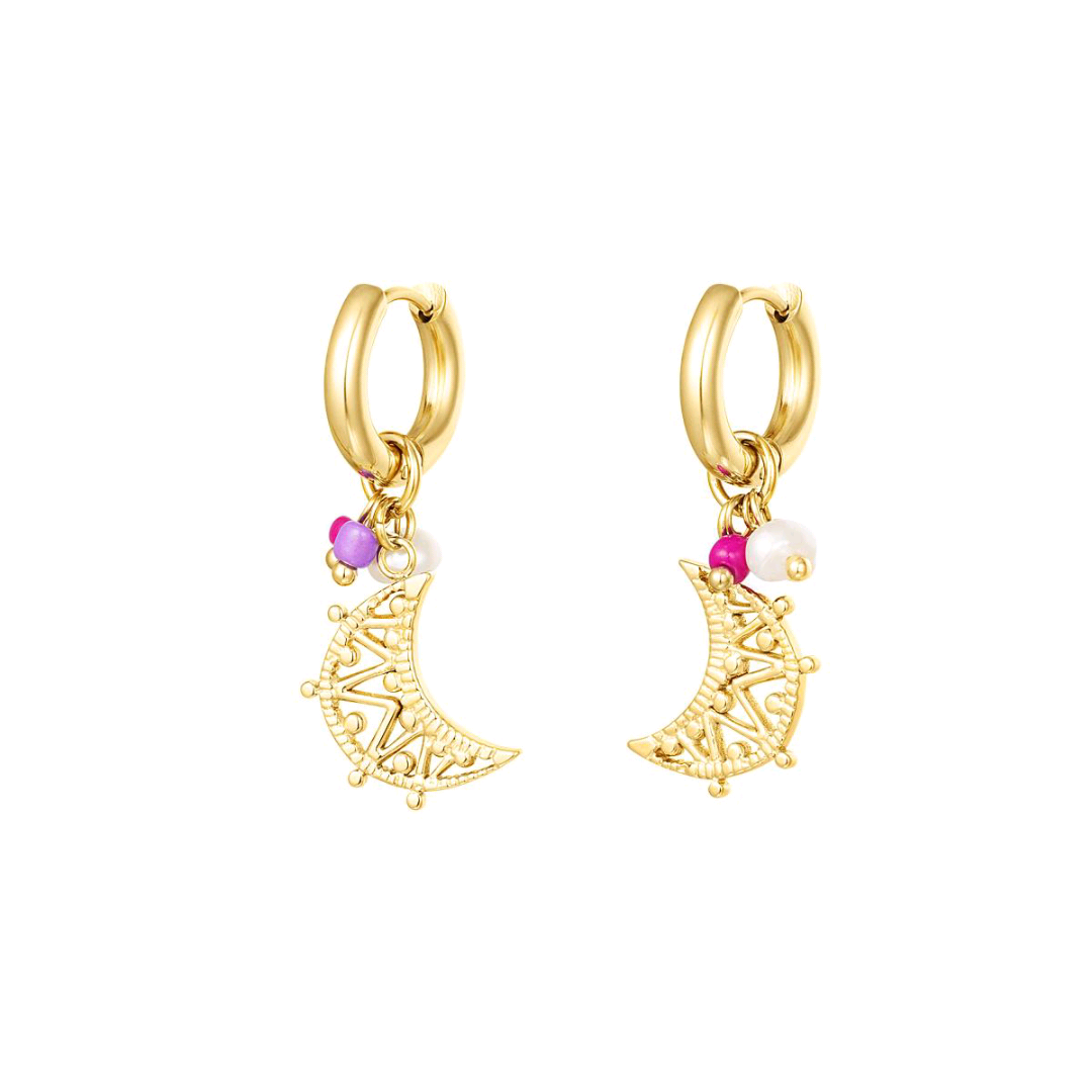 Hoe tof zijn deze gouden oorbellen met een bedel in de vorm van een maan en kraaltjes in de kleur paars en roze. De oorbellen zijn gemaakt van stainless steel in combinatie met glaskralen en een parel. Oorbellen met maan en kraaltjes hebben en afmeting van 3,6 cm en zijn erg leuk te combineren met meerdere gouden oorbellen. Shop deze ook in de zilveren kleur.