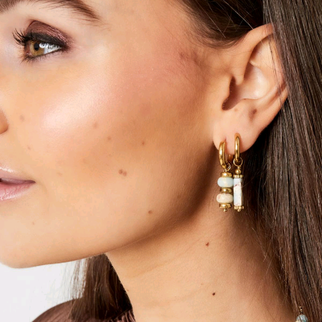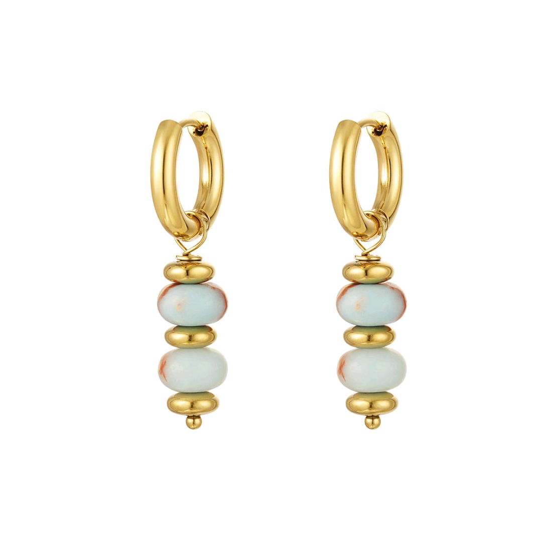 Hoe leuk zijn deze oorbellen met licht blauwe steentjes en gouden bolletjes. Oorbellen met stenen bolletjes zijn perfect voor elke gelegenheid! De oorbellen zijn uitstekend casual te dragen maar kunnen ook zeker geschikt zijn voor een feestje. De oorbellen zijn gemaakt van Stainless Steel en hematiet in combinatie met steen en hebben een afmeting van 3,8 cm. Verkrijgbaar in de kleuren blauw - lichtblauw - blauw - wit - cognac.