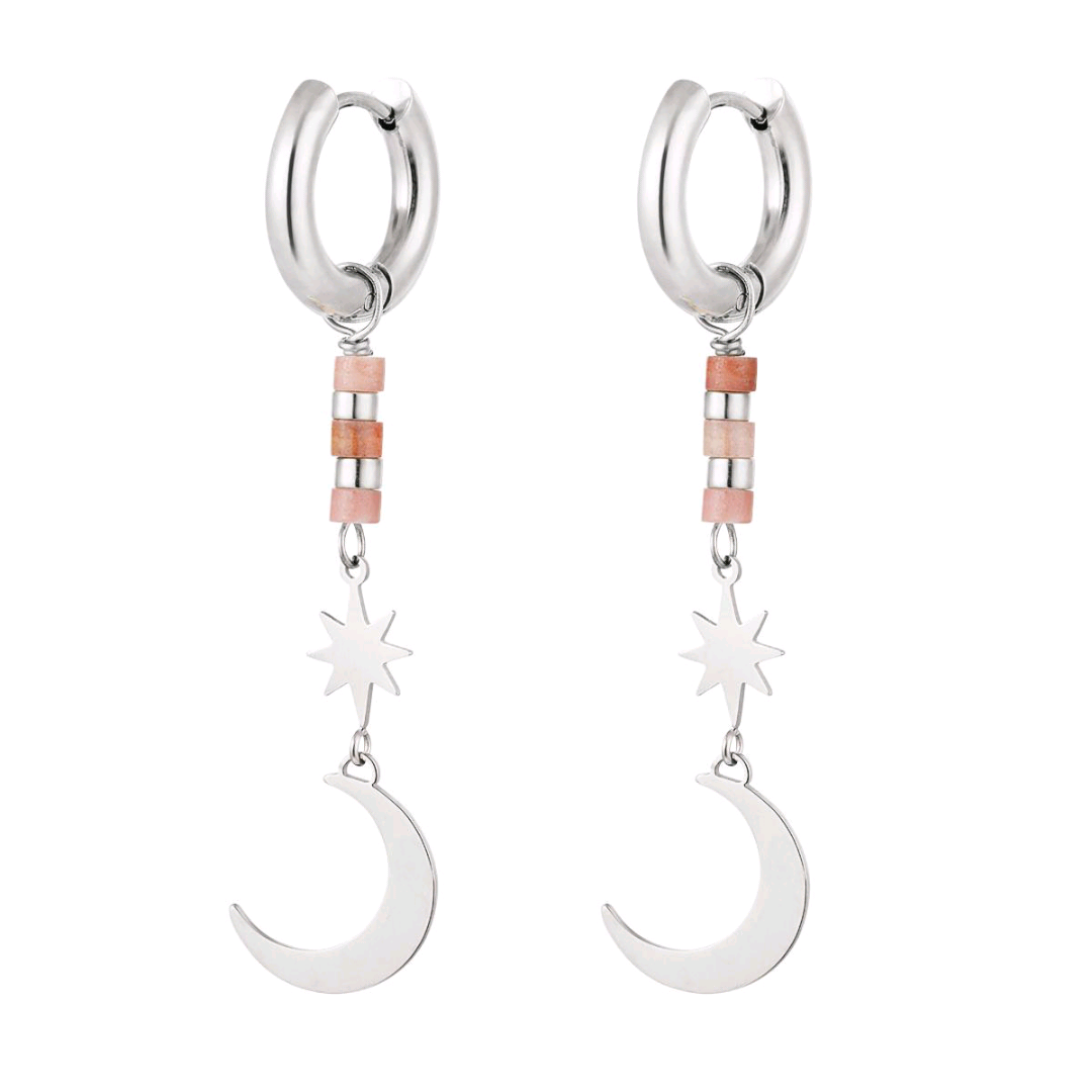 Hoe leuk zijn deze lange oorbellen met kraaltjes en een ster en maan. Deze zilveren statement oorbellen met roze kraaltjes maken jouw outfit helemaal compleet! Leuk om deze oorbellen met meerdere zilveren oorbellen te combineren! Oorbellen ster/maan is gemaakt van stainless steel in combinatie met turquoise en hematiet. De oorbellen hebben een afmeting van 5,5 cm.
