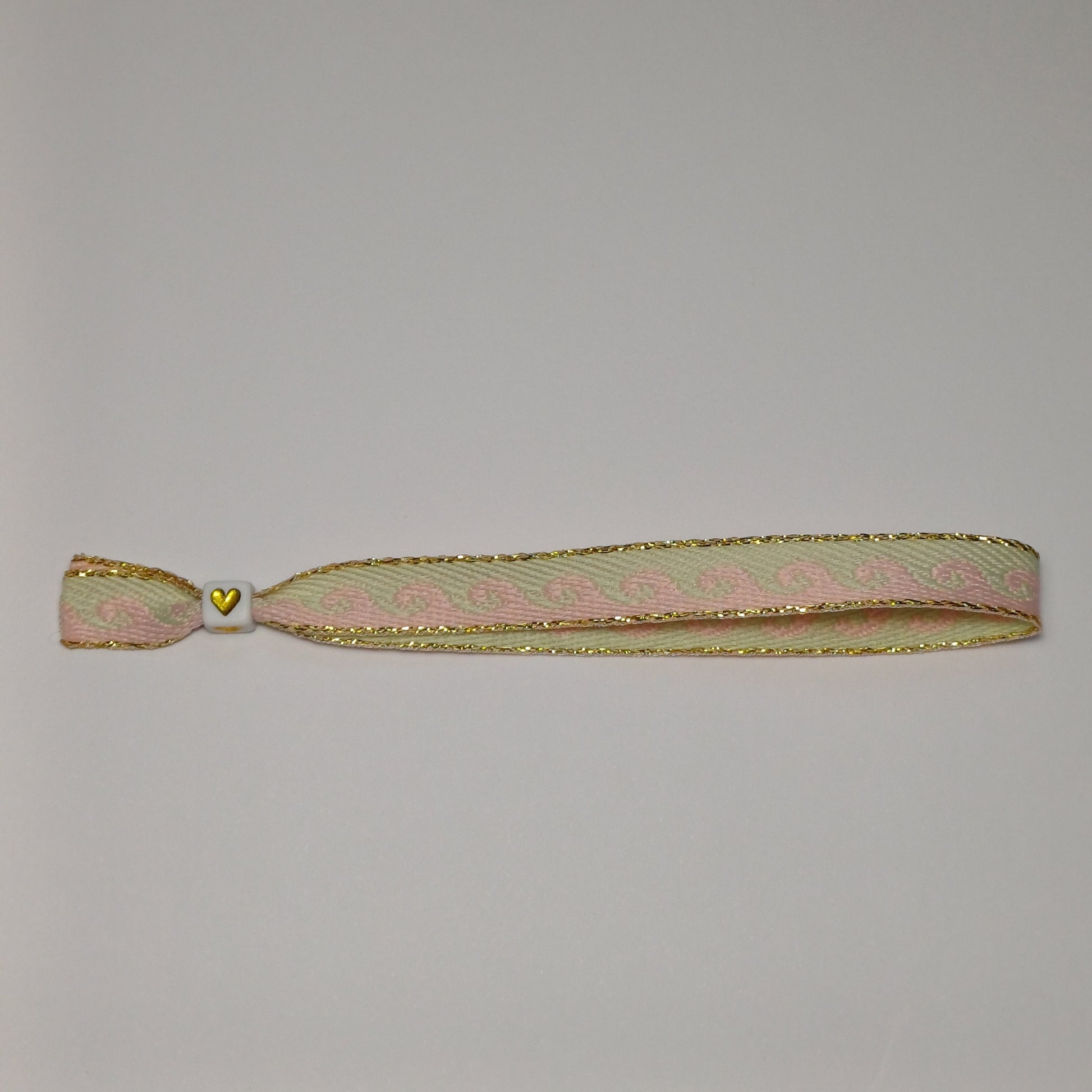 Dit is een stoffen bandjes met een verschuifbaar kraaltje aan zodat het makelijk aan en uit kan en ook voor (bijna) iedereen past. Hou er rekening mee dat de kleur van het hartjes kraaltje anders kan zijn dan op de foto!