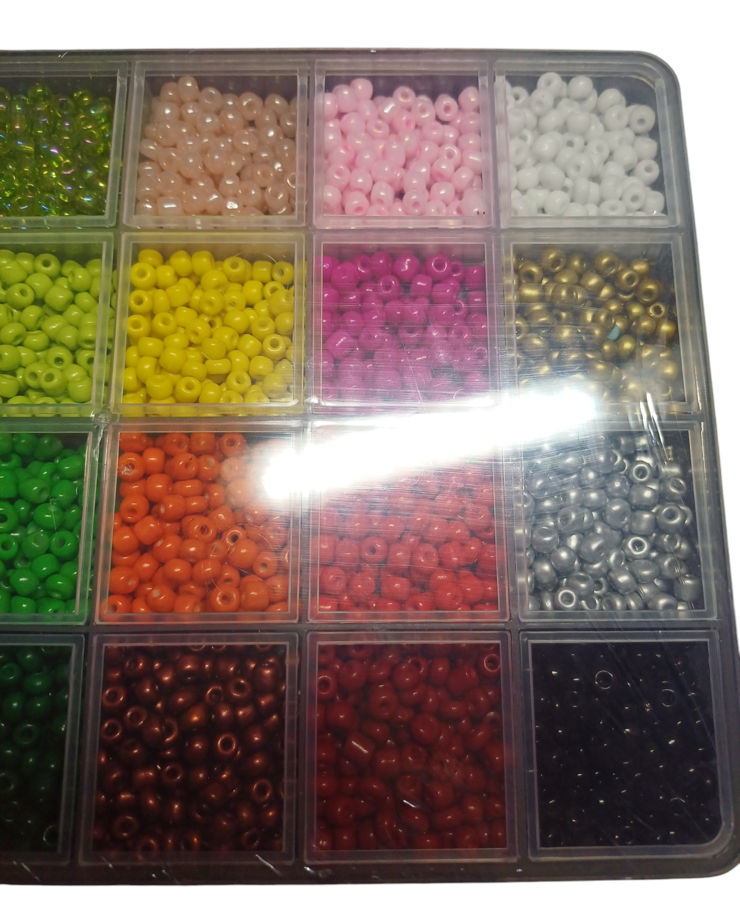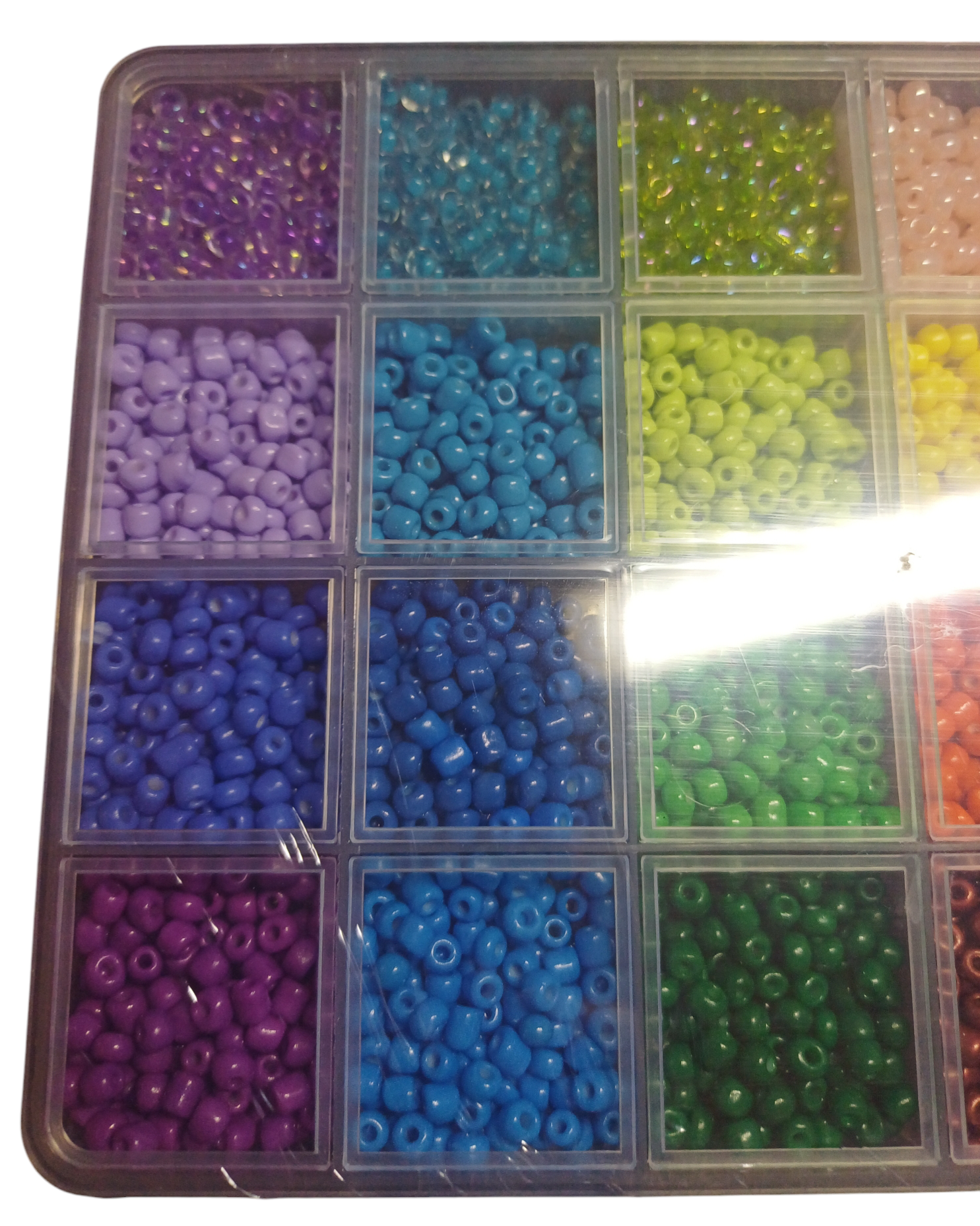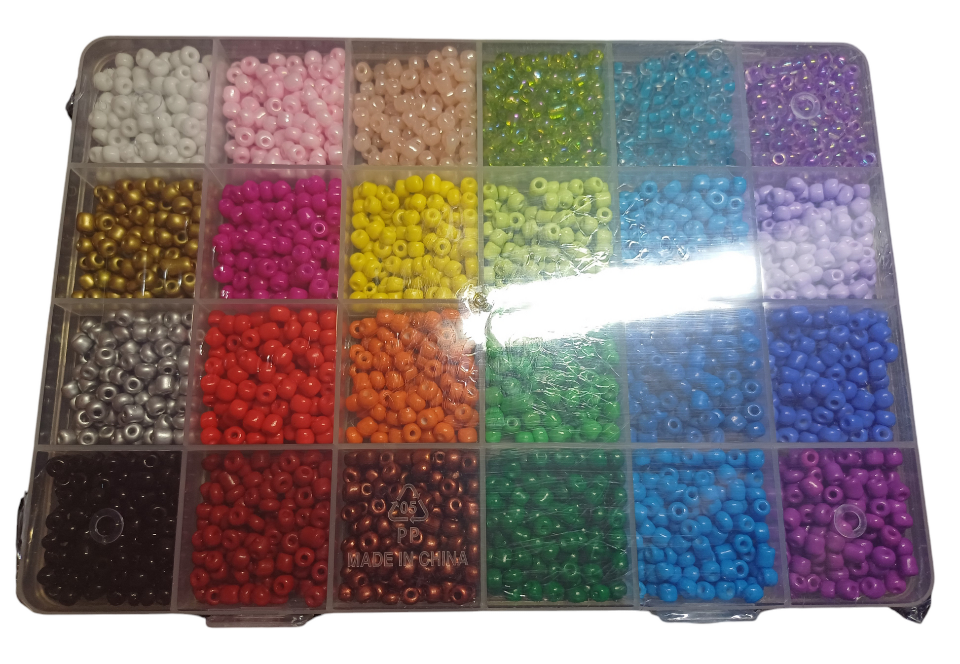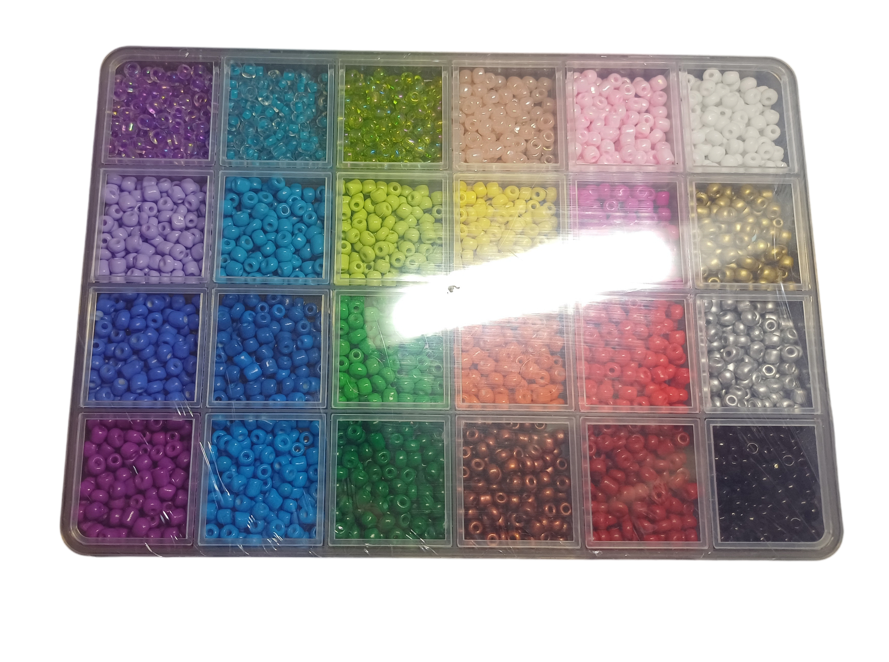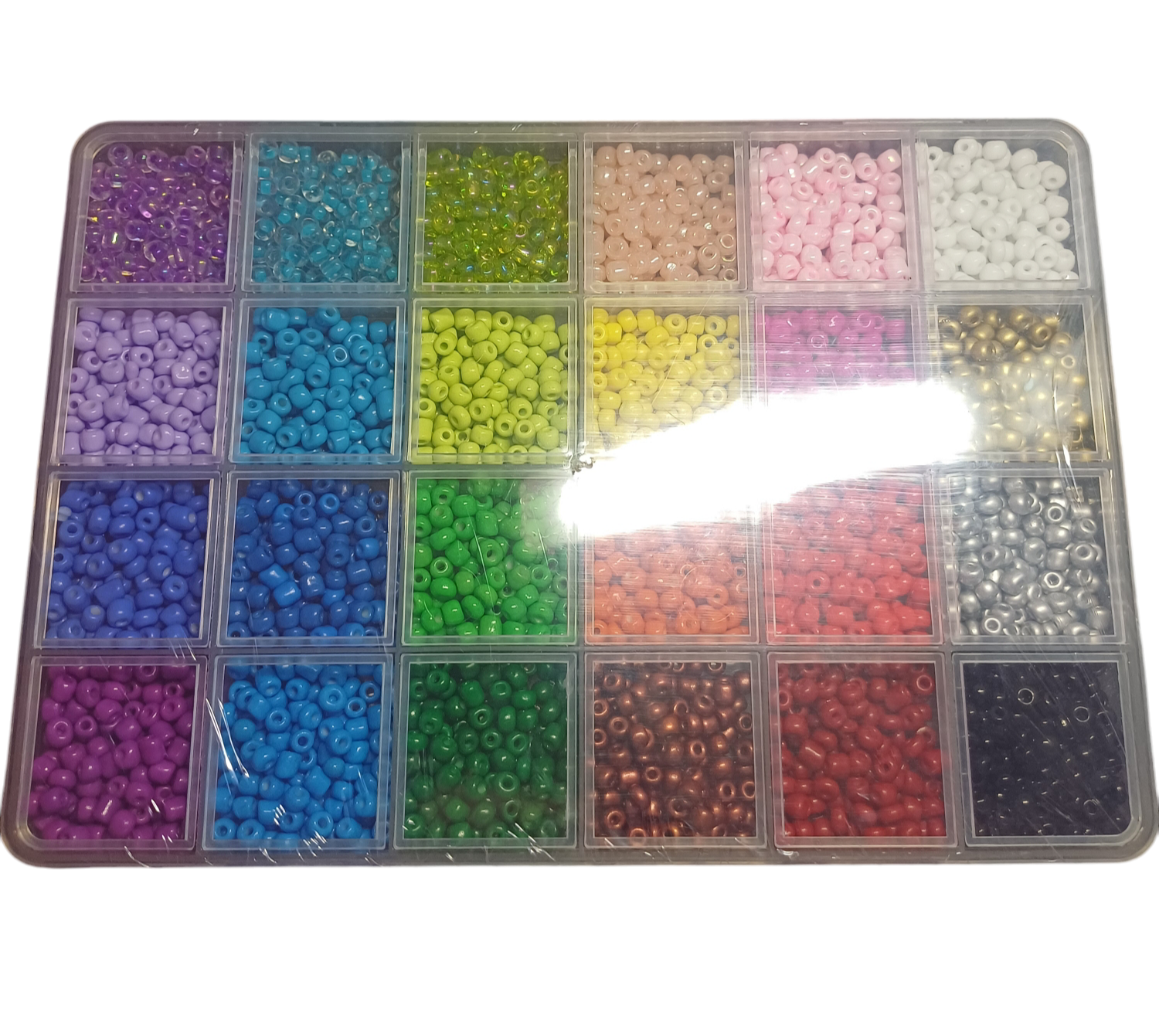 Dit is een kralenbox met afmetingen 19x13x2cm met rocailles kralen : 24 kleuren rocailles kralen ( +-2400stuks)