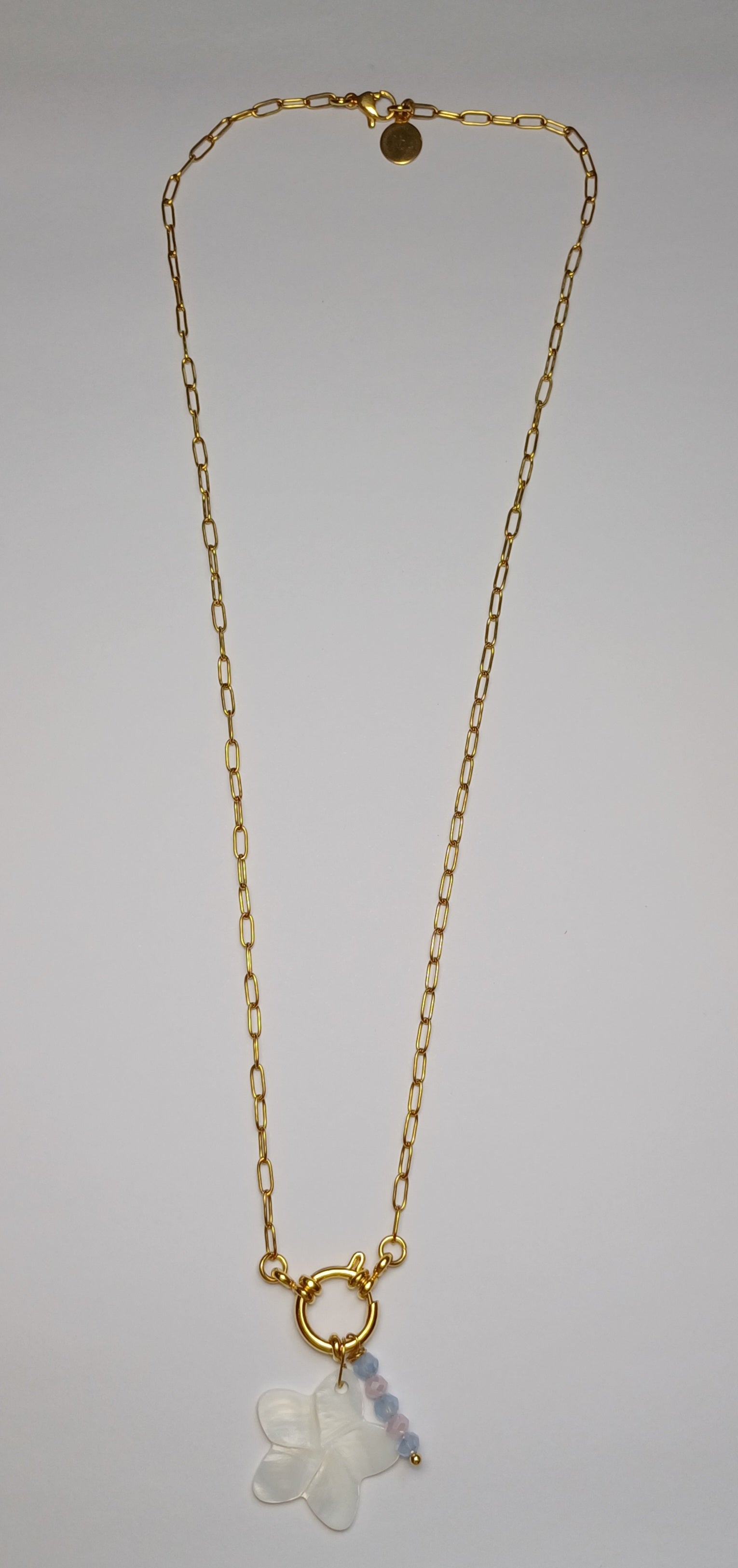 Probeer wel water, zweet, parfum ect uit de buurt te houden van je ketting zodat hij langer mooi blijft en je er langer plezier van hebt 😊 (de bloem bedel is van schelp & de andere van platic)
