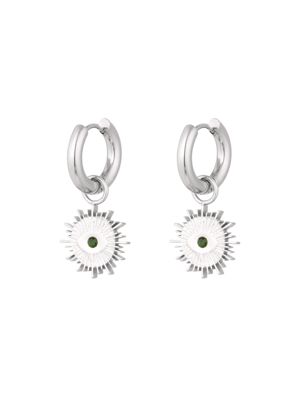 Zilveren oorbellen met leuke bedel in de vorm van een zonnetje met oogje en groene glinster. Deze oorbellen zijn zeer geschikt voor elke gelegenheid en kunnen met elke outfit gecombineerd worden, ideaal! De oorbellen zijn gemaakt van Stainless steel en strass steentjes.
