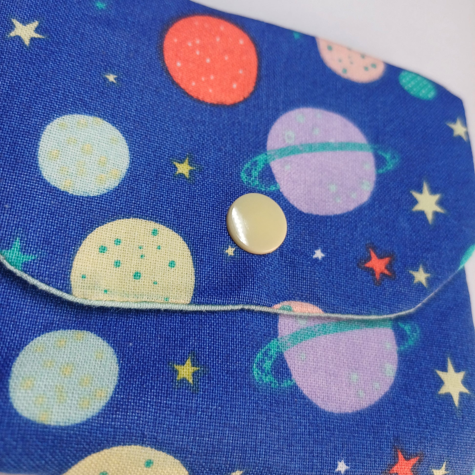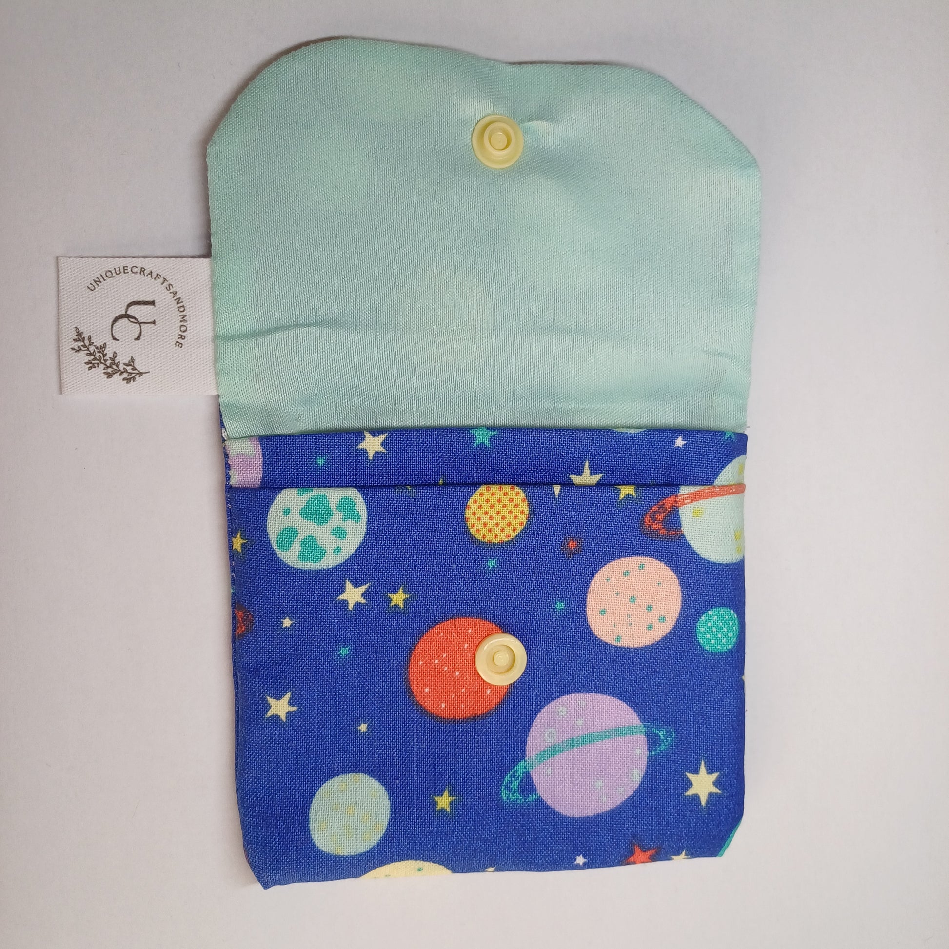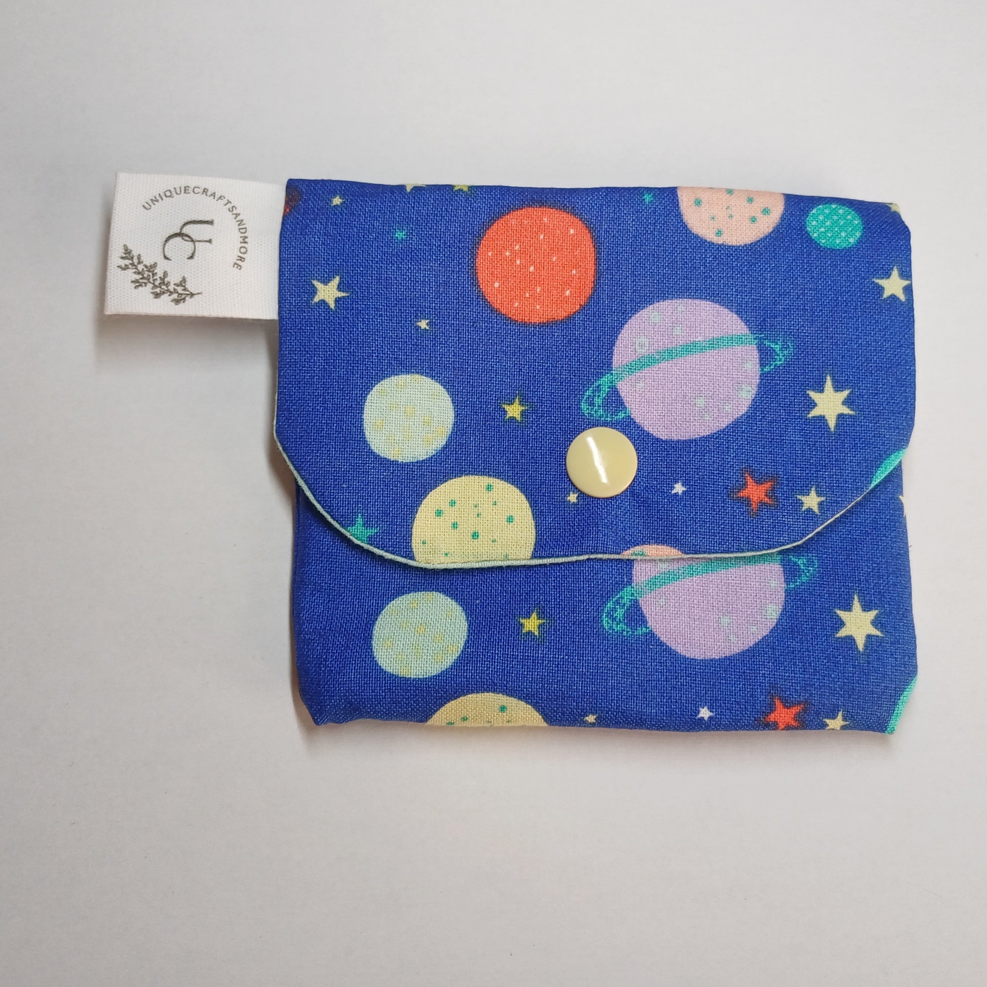 Dit is een handgemaakte portefeuille met een leuke print😊 hij is 11 cm breed en 10 cm hoog.