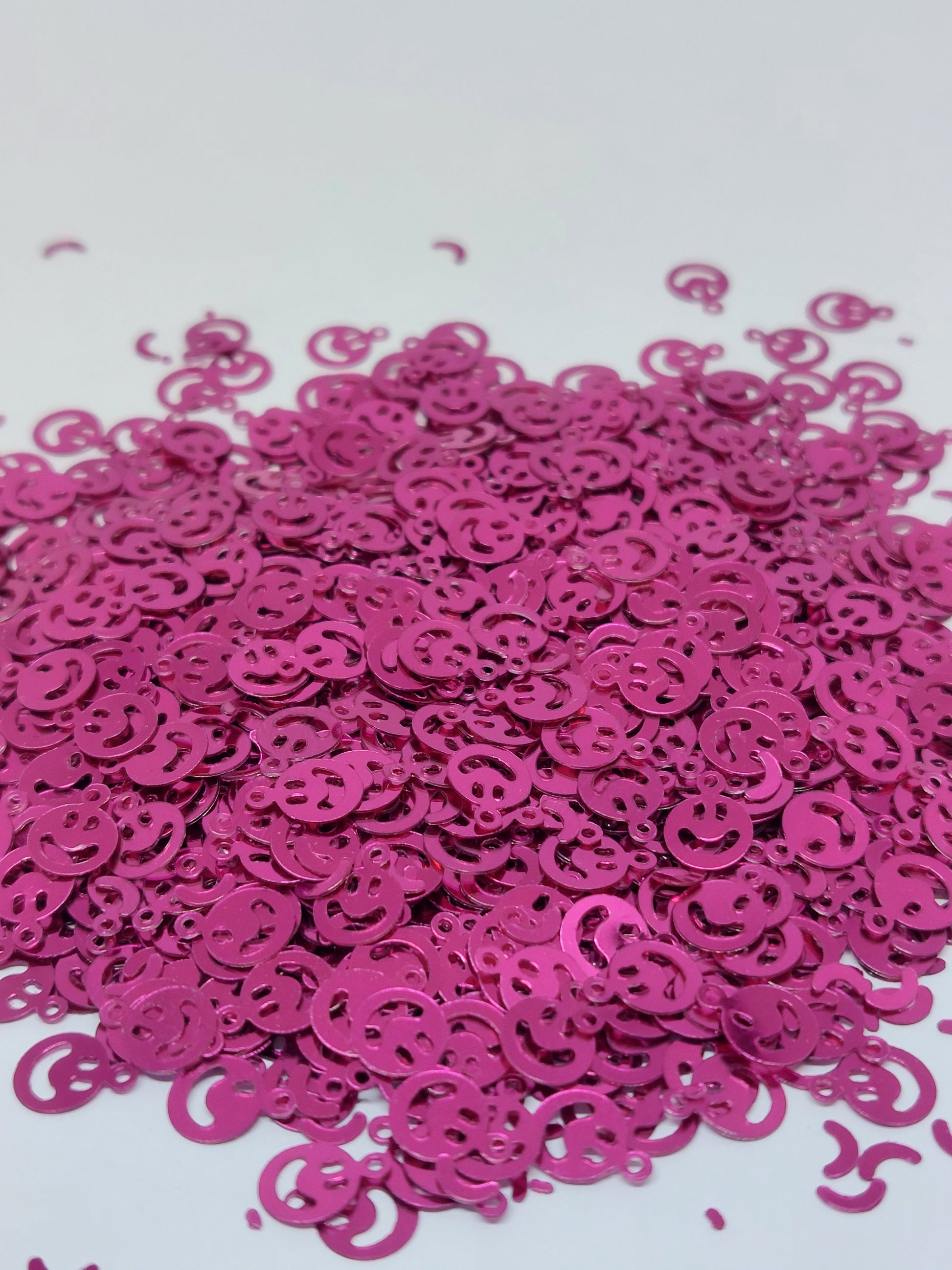 Dit is confettie in de vorm van een smiley in de kleur roos deze zijn heel leuk om in een besteling te doen om de bestelling nog leuker te maken🙃 het word verkocht per +-10 gram.