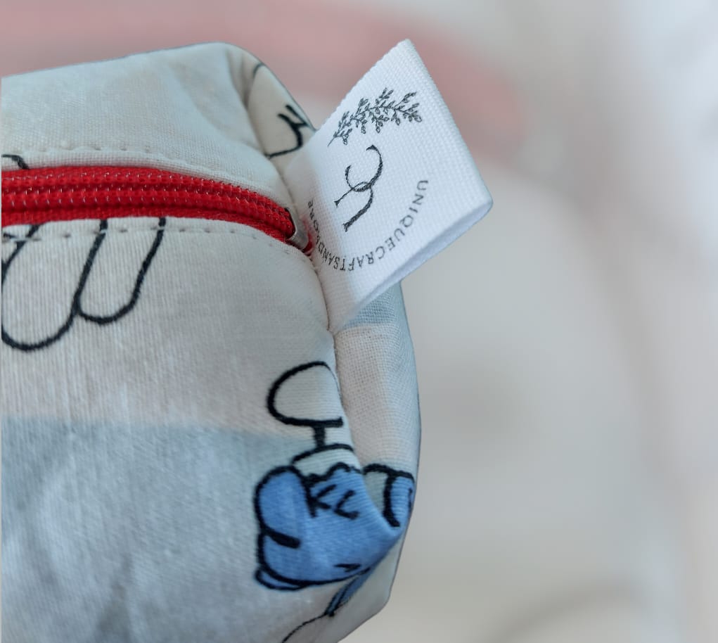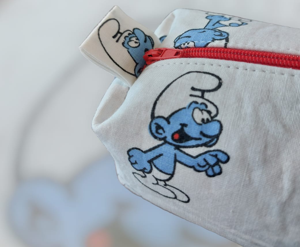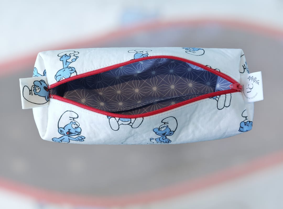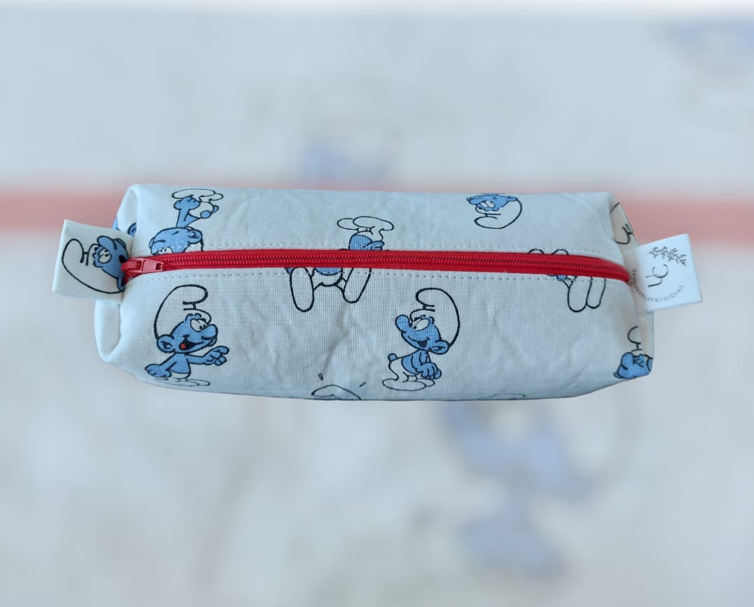 Dit is een handgemaakte pennenzak met een leuke print ๐ deze pennenzak is 21 cm breed en 6 cm hoog .