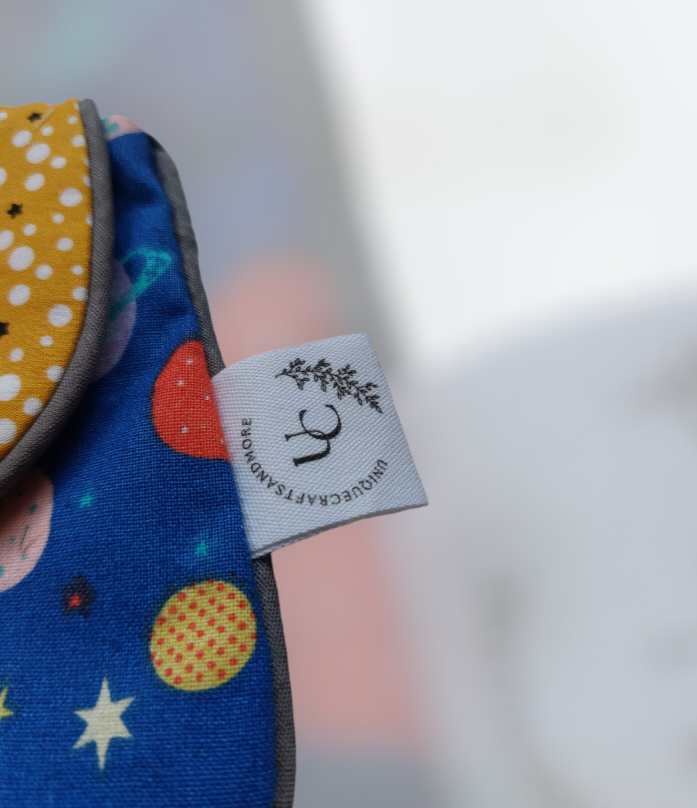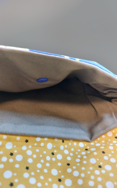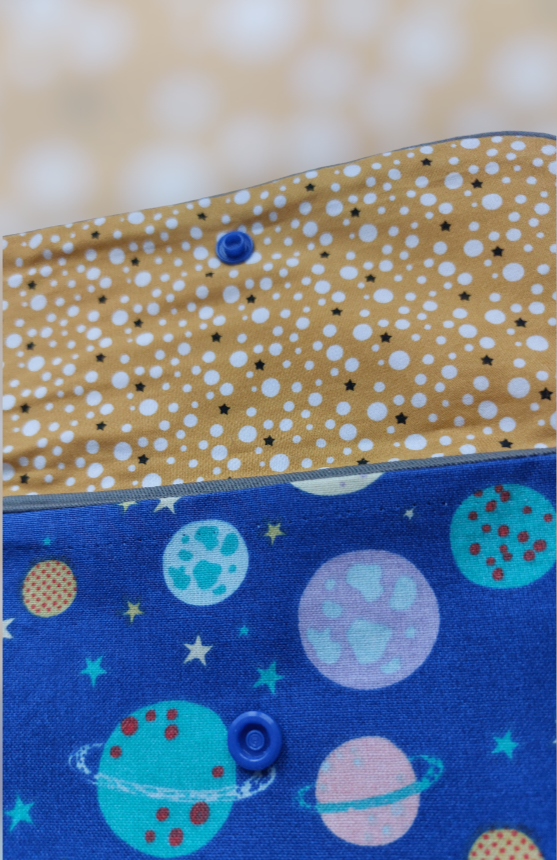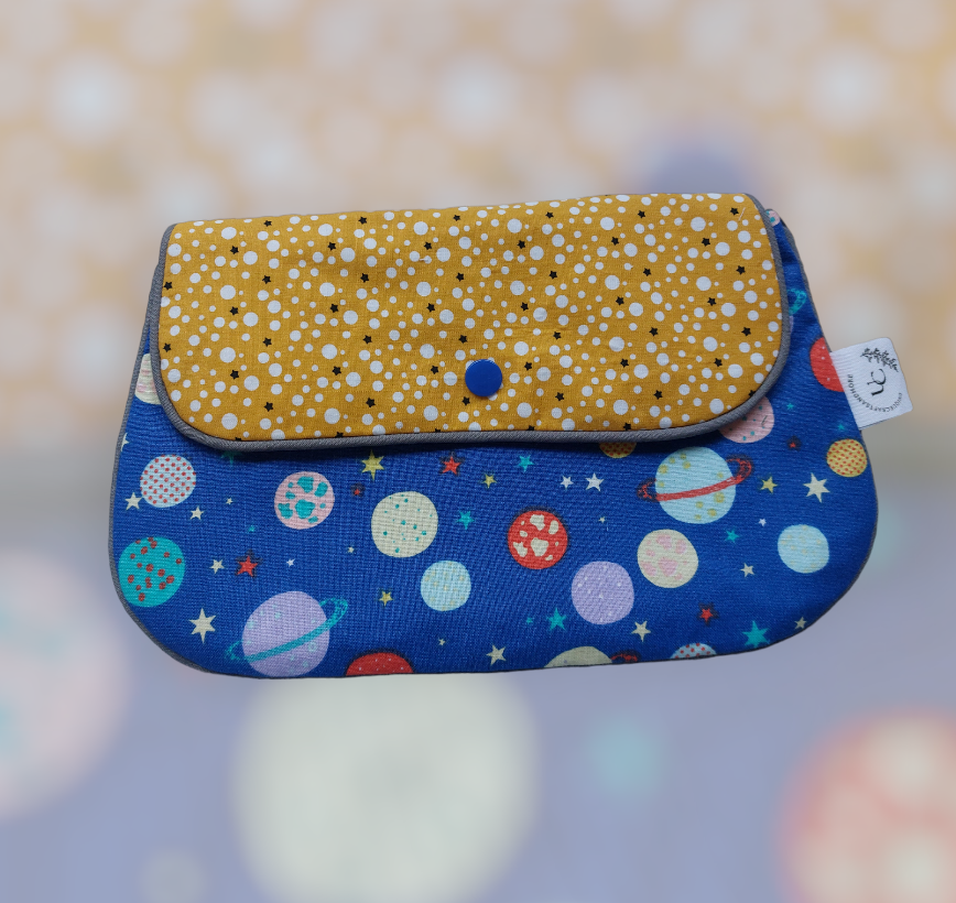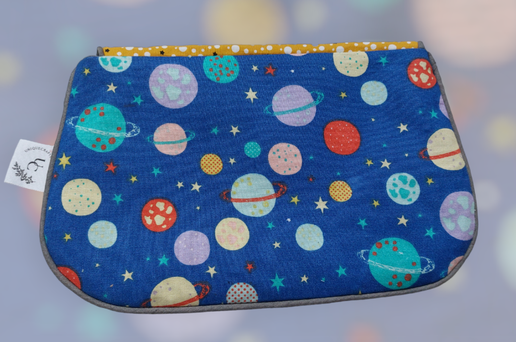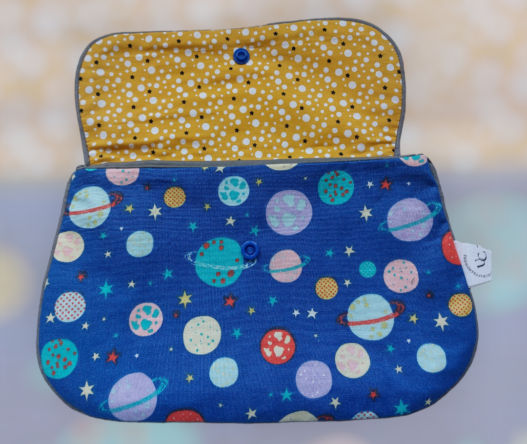 Dit is een handgemaakte etui met een leuke print en een druk knopje als sluiting deze is 24 cm breed en 14 cm hoog 😊