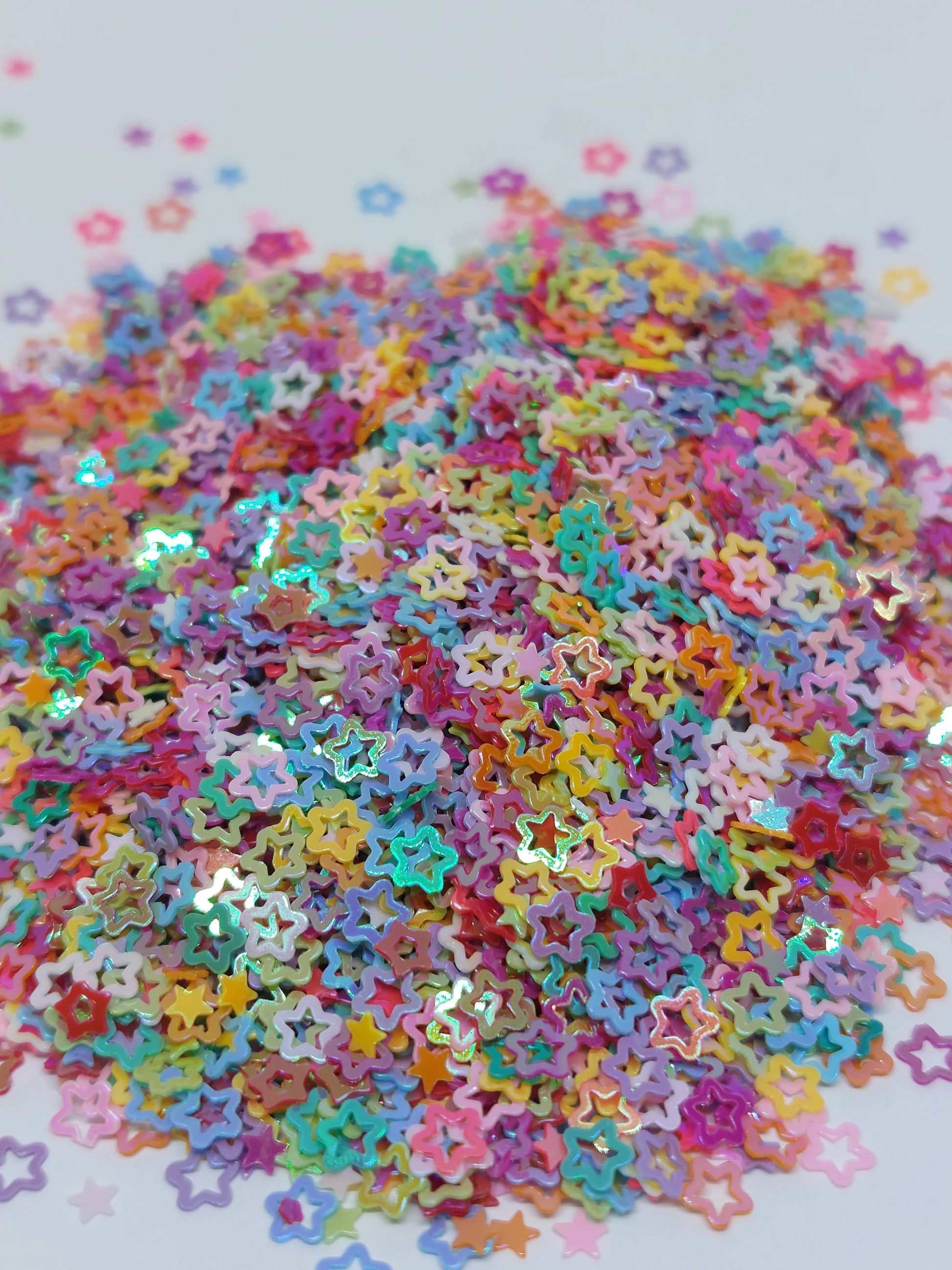Dit is confettie in de vorm van sterretjes in allerlei kleuren deze zijn heel leuk om in een besteling te doen om de bestelling nog leuker te maken🌟 het word verkocht per +-10 gram.
