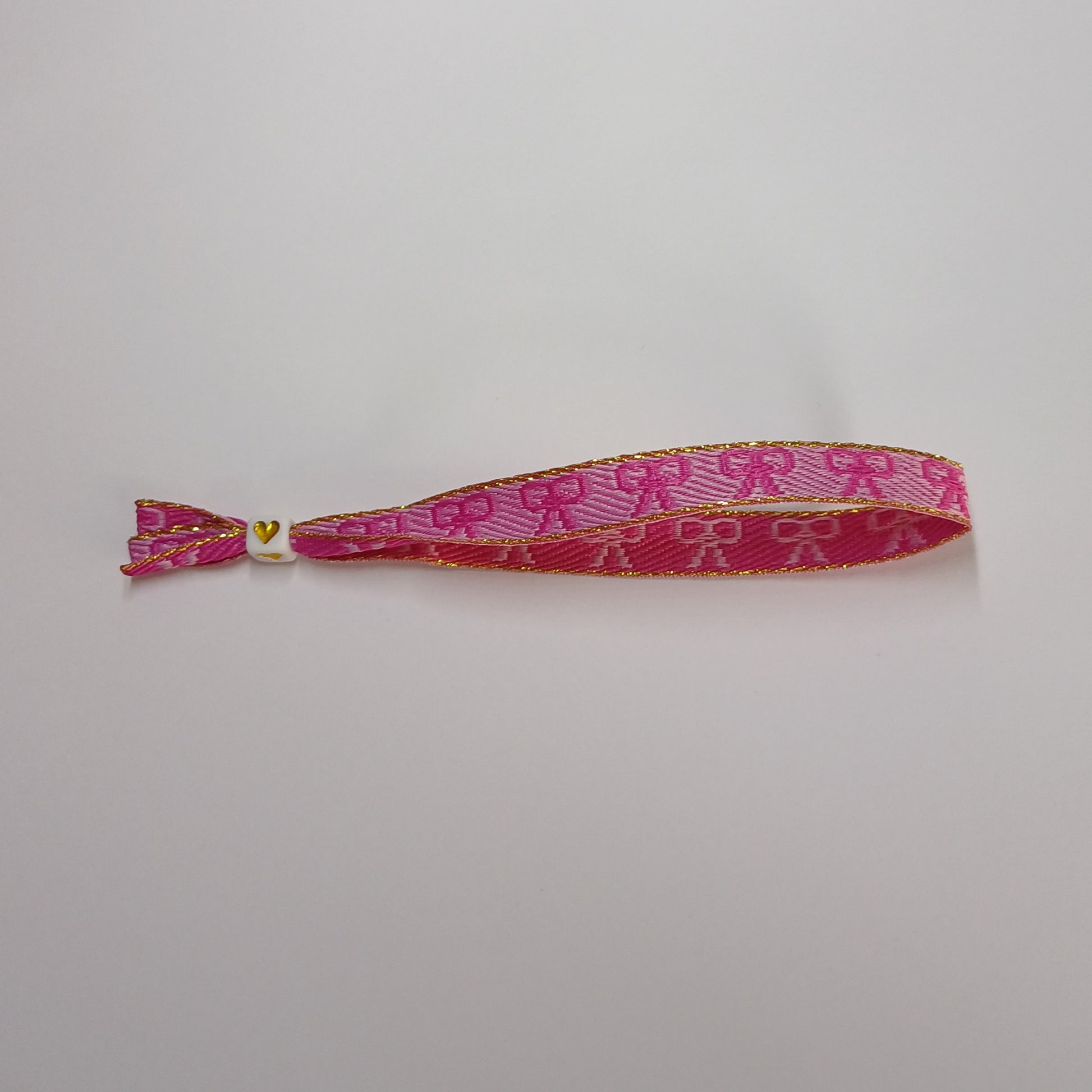 Dit is een stoffen bandjes met een verschuifbaar kraaltje aan zodat het makelijk aan en uit kan en ook voor (bijna) iedereen past. Hou er rekening mee dat de kleur van het hartjes kraaltje anders kan zijn dan op de foto!