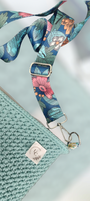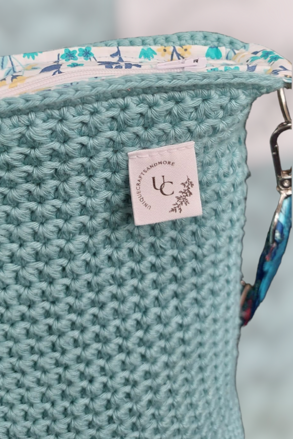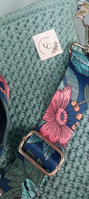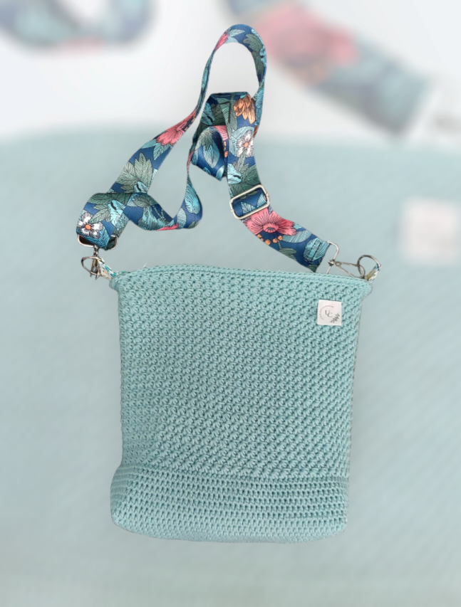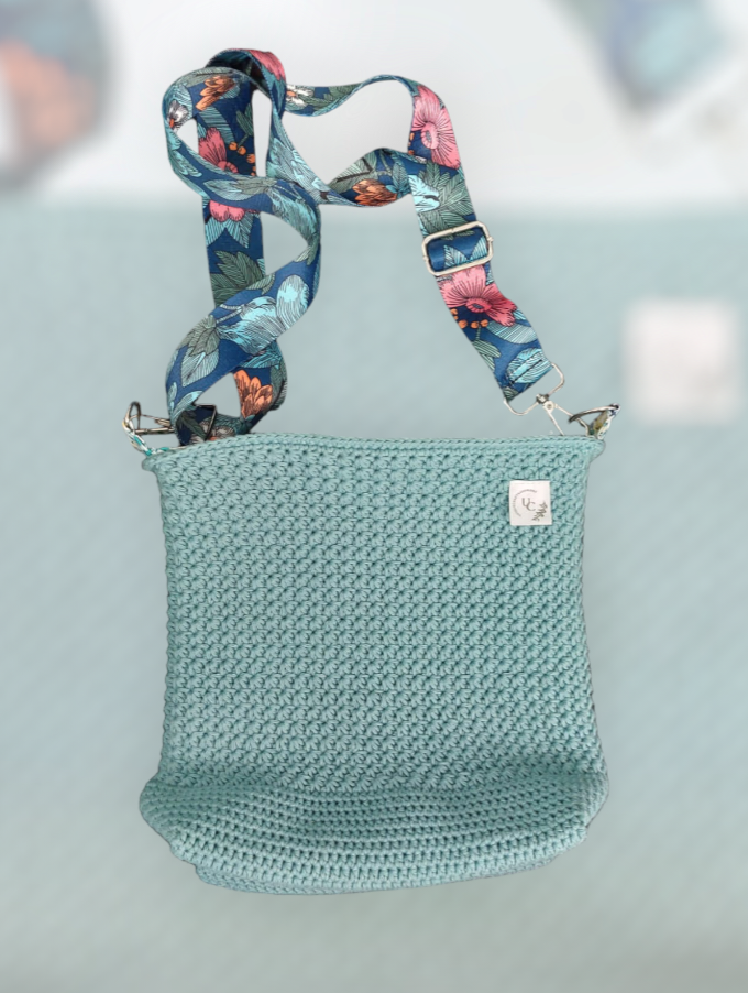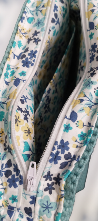 Dit is een zelfgemaakte handtas. De buitenkant van de handtas is gehaakt met 100% katoen garen en de binnenkant van de tas is genaaid. De tas is afgewerkt met een rits. Er is ook een zakje aan de zijkant genaaid waar je allerlei spulletjes in kan steken! Ook zit er een tassenlint bij zodat je hem gemakkelijk over je schouder kan hangen, dit lint is ook verstelbaar 😊