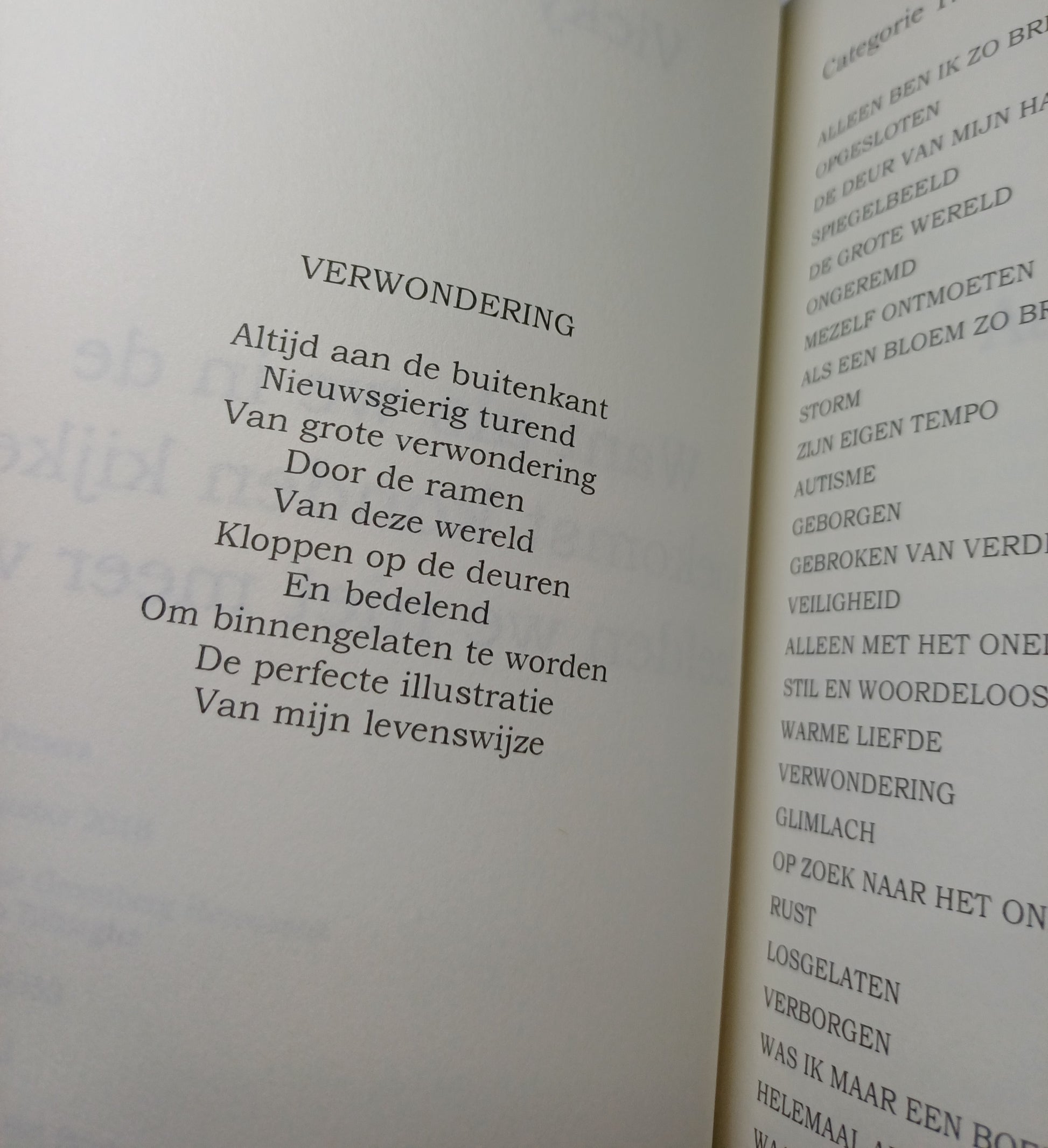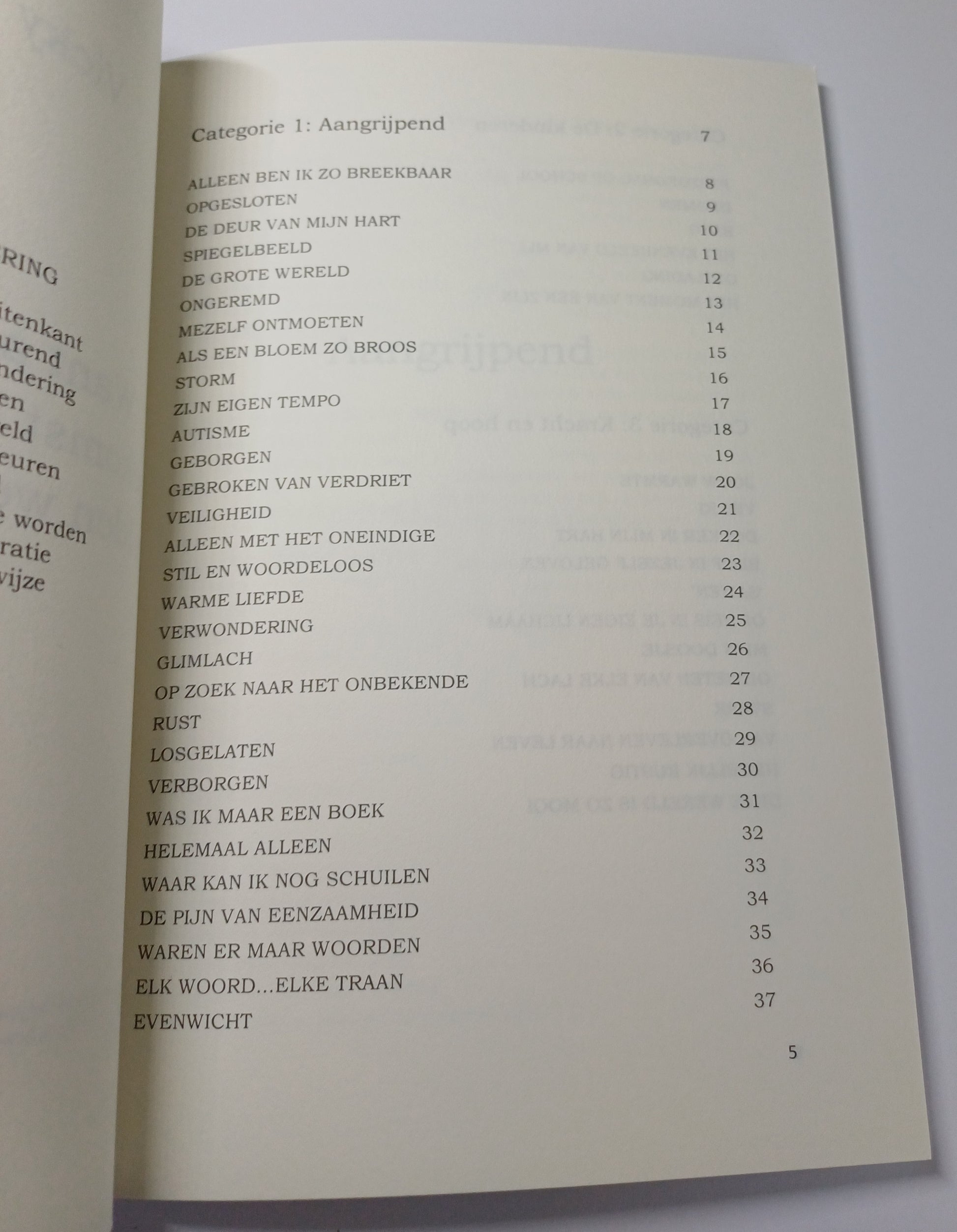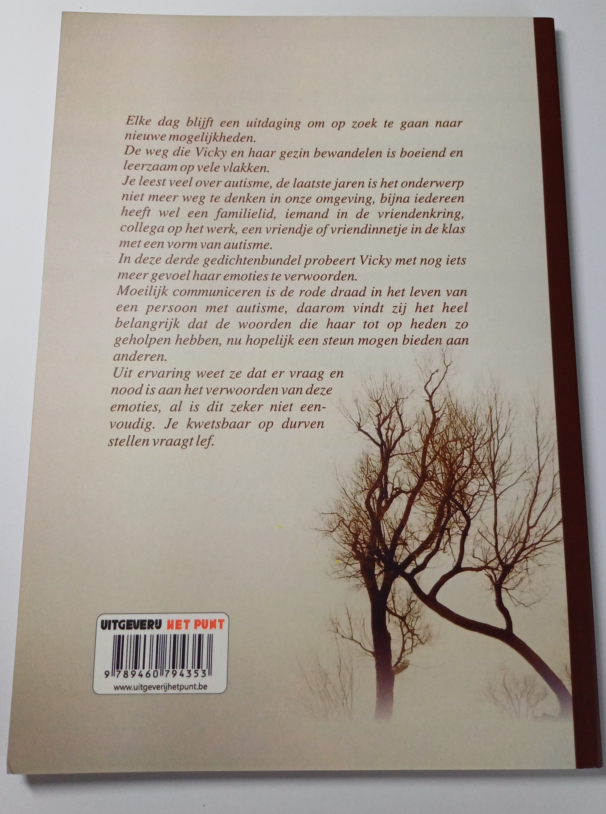 In deze derde gedichtenbundel probeert Vicky met nog iets meer gevoel haar emoties te verwoorden. Moeilijk communiceren is de rode draad in het leven van een persoon met autisme, daarom vindt zij het heel belangrijk dat de woorden die haar tot op heden zo geholpen hebben, nu hopelijk een steun mogen bieden aan anderen.