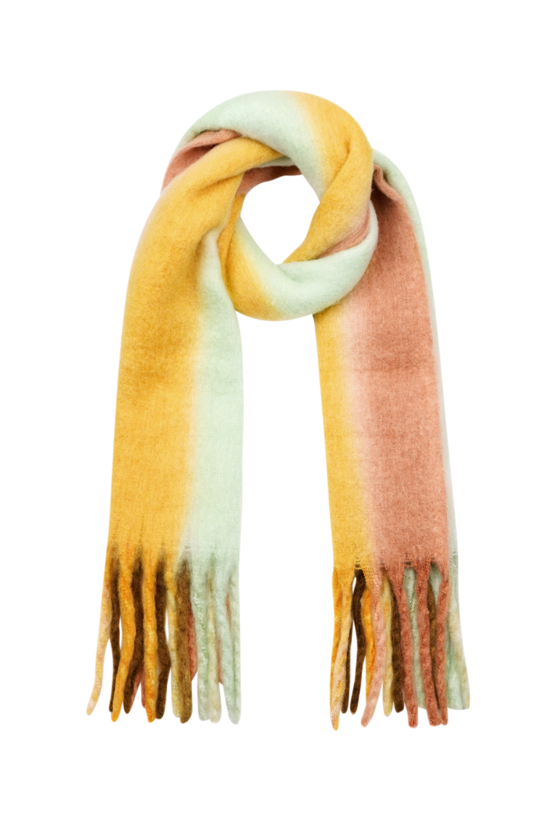 Dit is een mooie wintersjaal met ombré effect, waarbij de kleuren in elkaar overlopen van licht naar donker. Deze variant heeft de kleuren roze, oranje en groen en is gemaakt van 100% polyester. De sjaal heeft een afmeting van 180 cm x 50 cm. Groot genoeg om je lekker warm te houden in de koudere maanden.