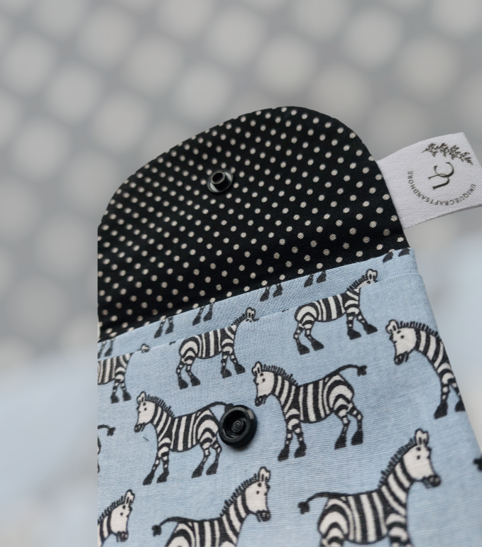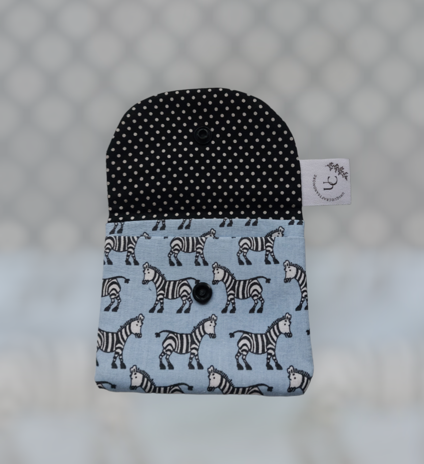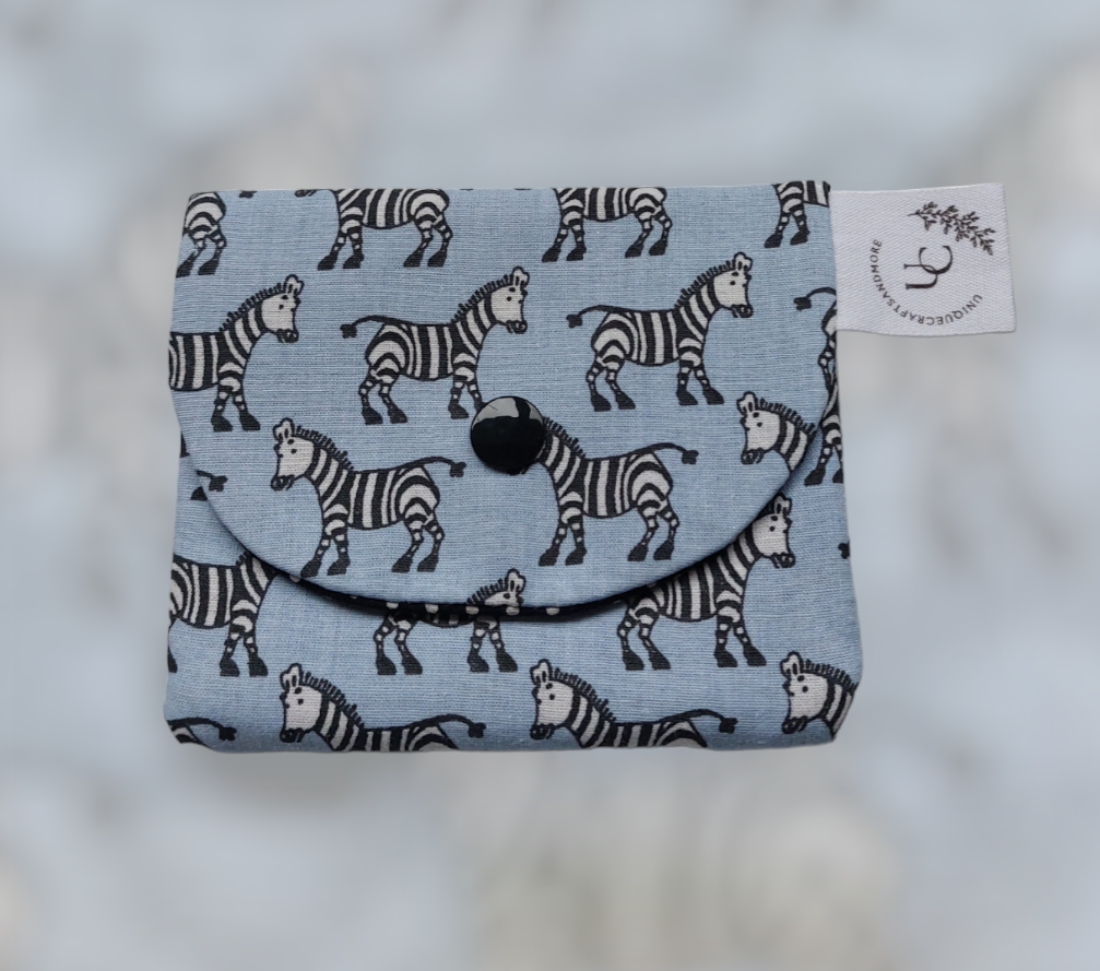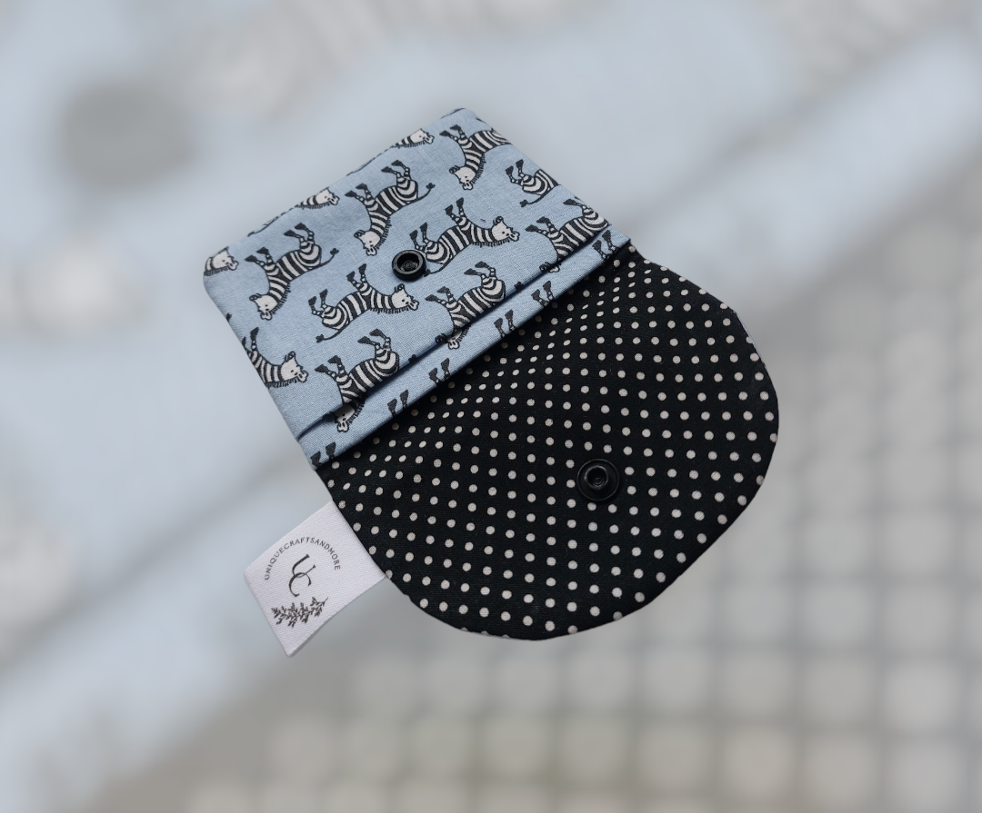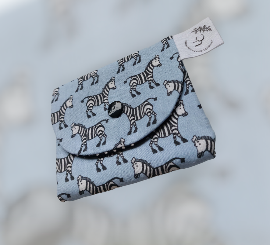 Dit is een handgemaakte portefeuille met een leuke print😊 hij is 11 cm breed en 10 cm hoog.
