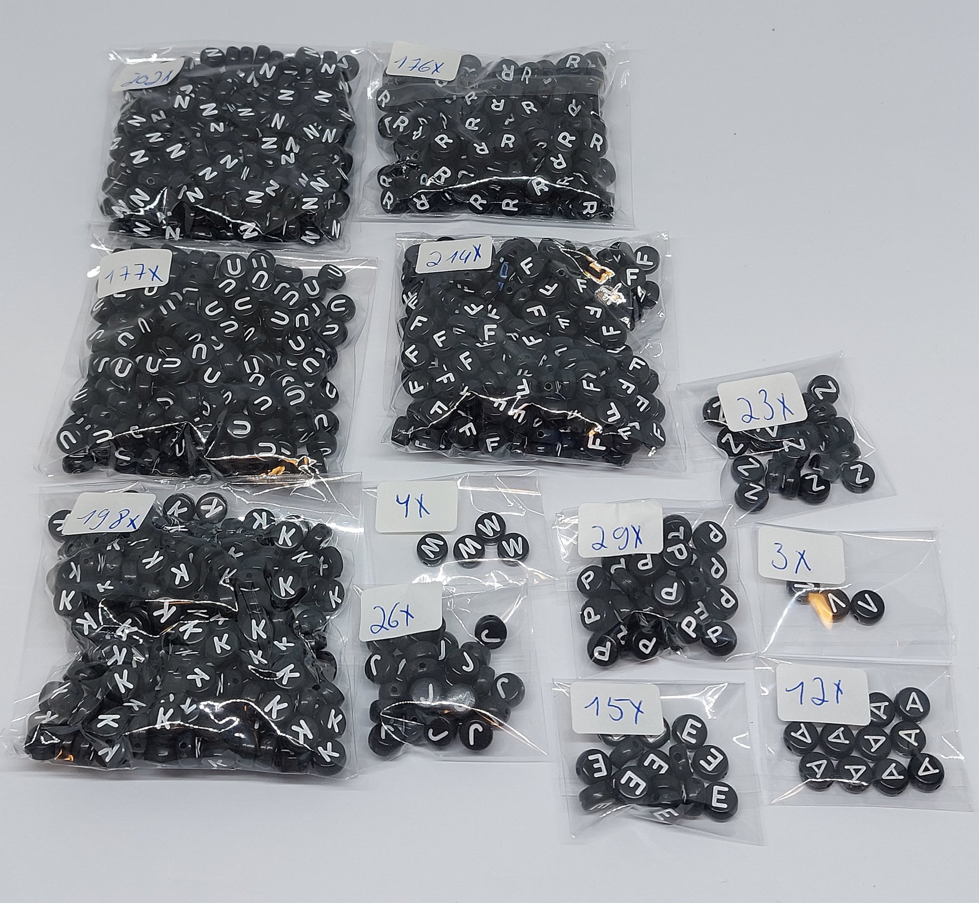 Dit is een pakket met zwarte acryl kralen in dit pakket zit: 202x letter N, 176x letter R, 177x letter U, 214x letter F, 198x letter K, 4x letter W, 26x letter J, 29x letter P, 15x letter E, 23x letter Z, 3x letter V, 12x letter A. Dus in totaal zijn dit 1079 letterkralen